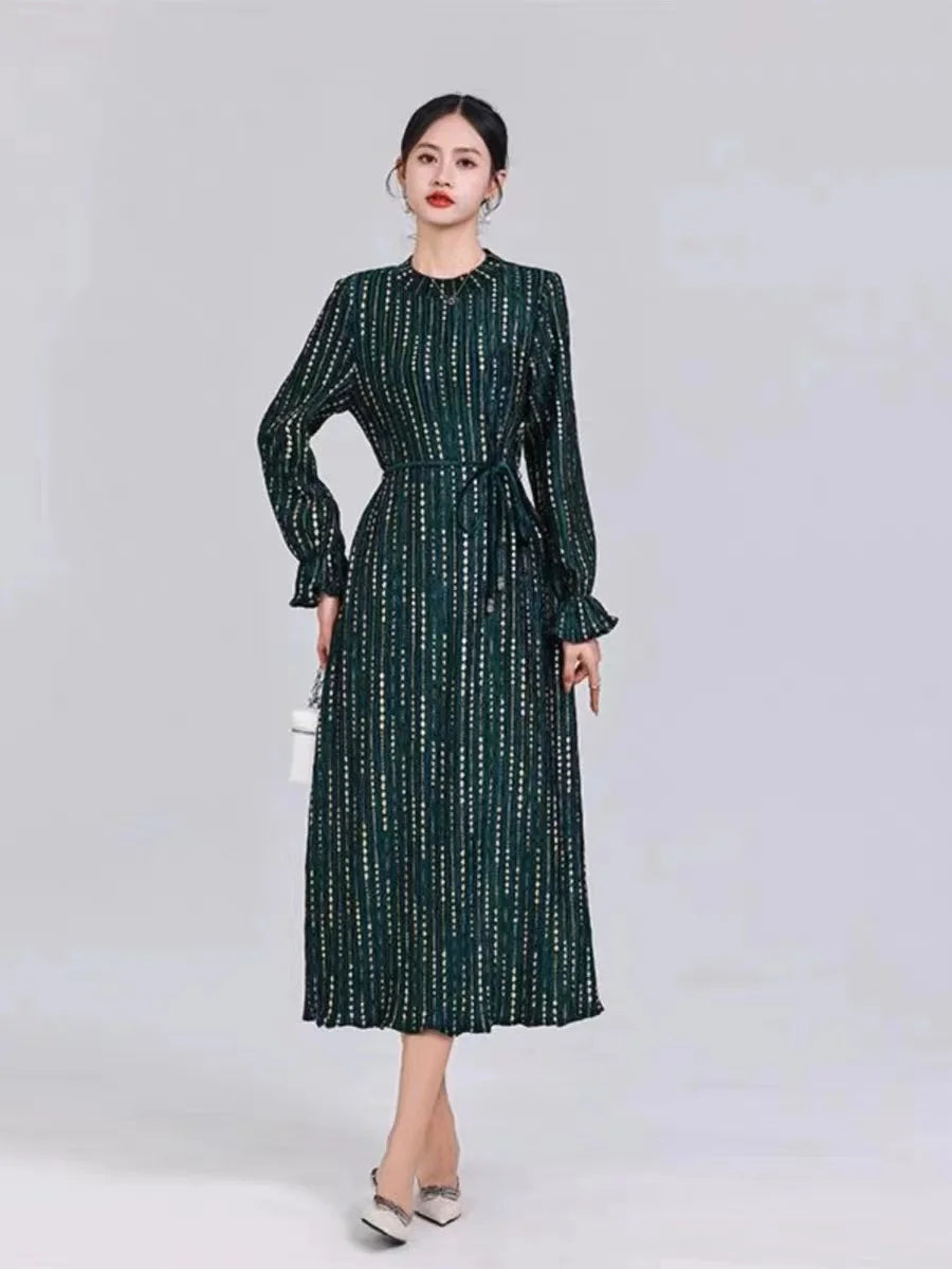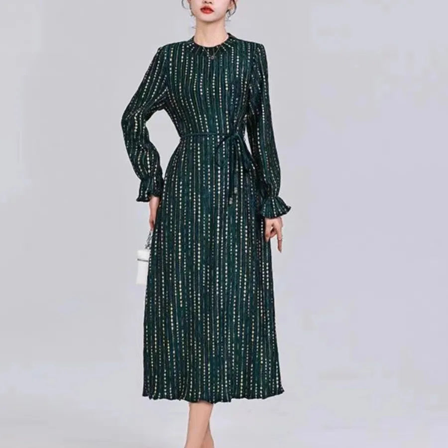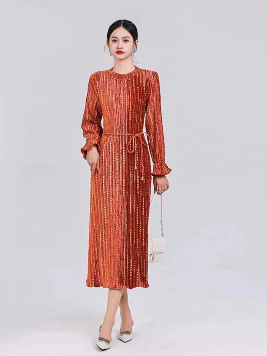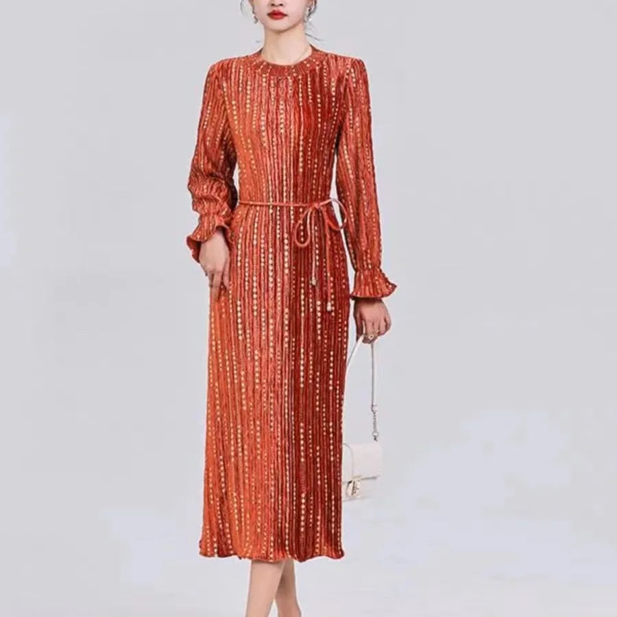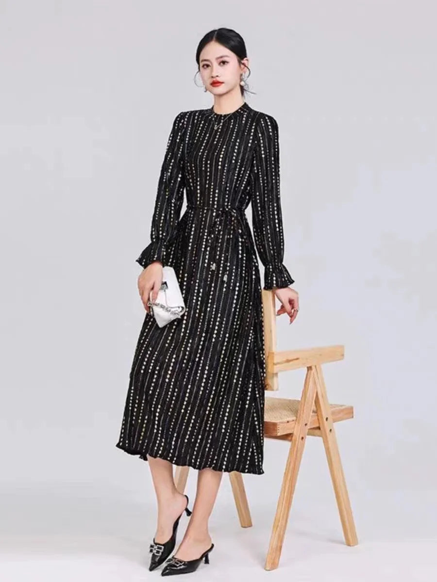 Elevate your autumn and winter wardrobe with the stunning Miyake Pleated Sequined Dress, designed for the modern, fashionable woman.