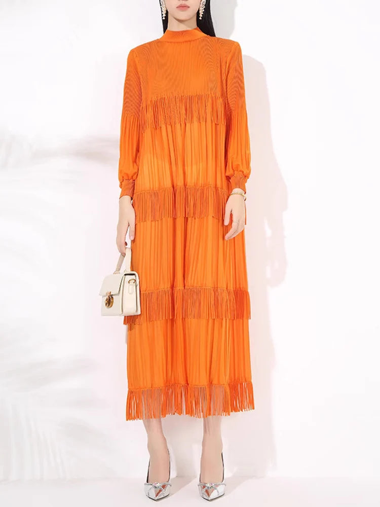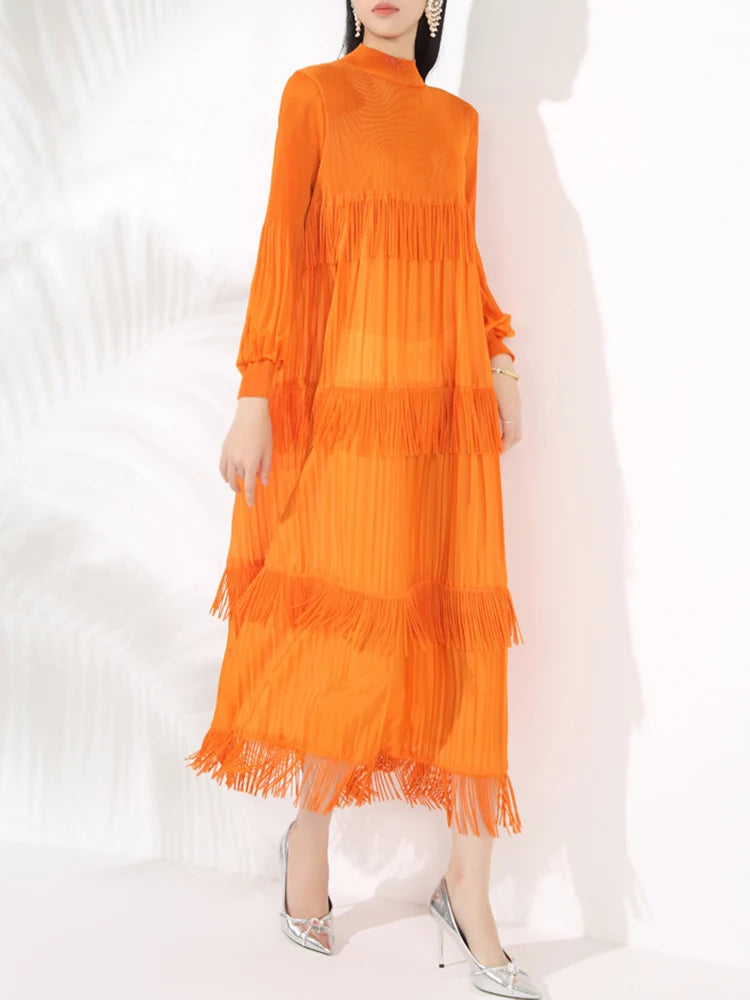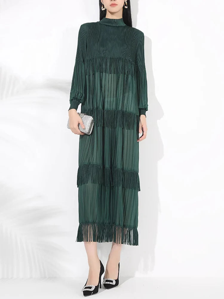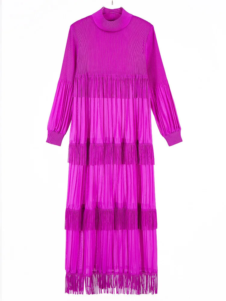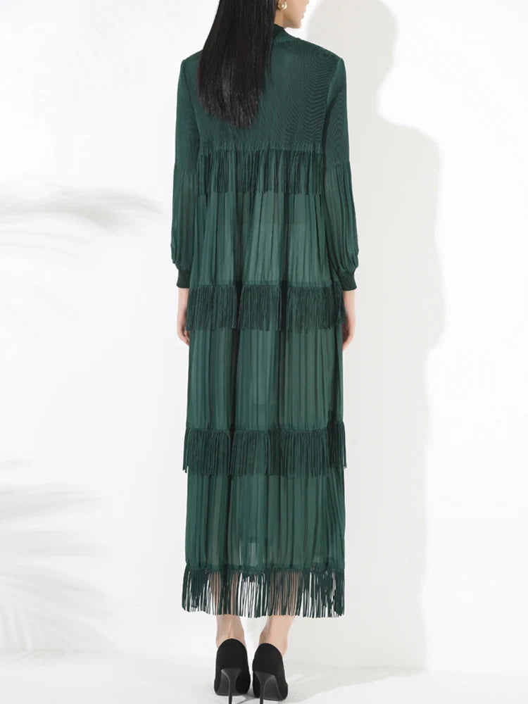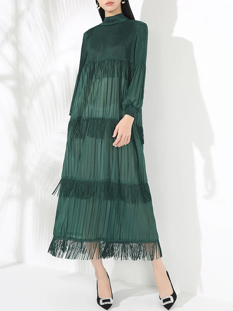 Elevate your style with our Elegant Party Pleated Long Dress featuring a chic stand collar and unique tassel design.