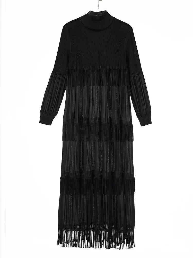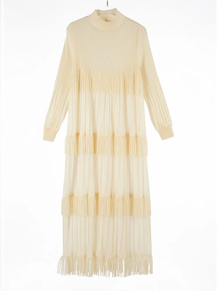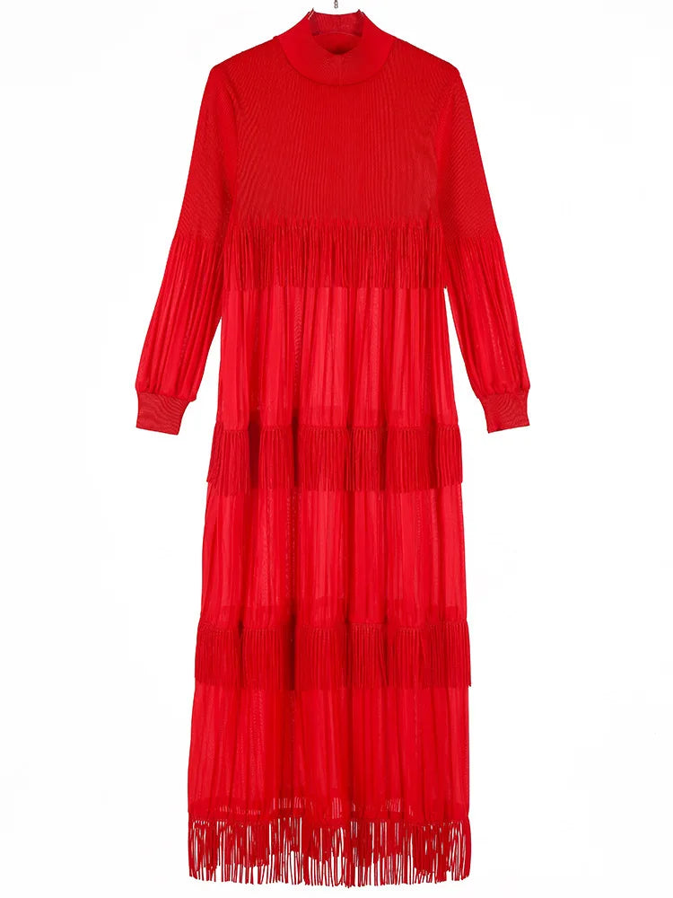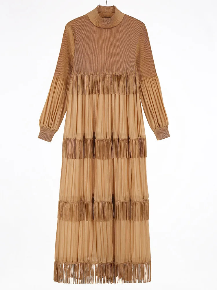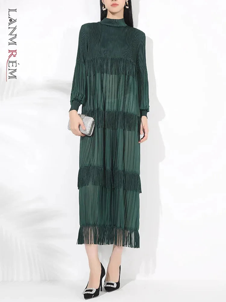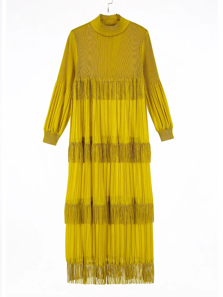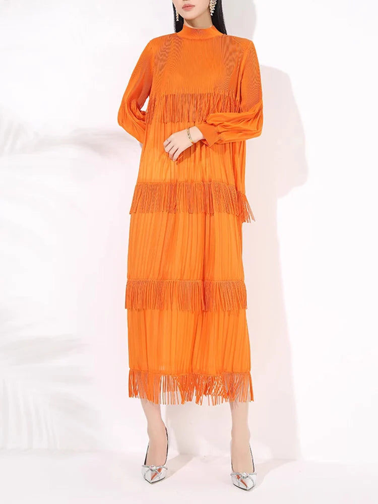 Elevate your style with our Elegant Party Pleated Long Dress featuring a chic stand collar and unique tassel design.