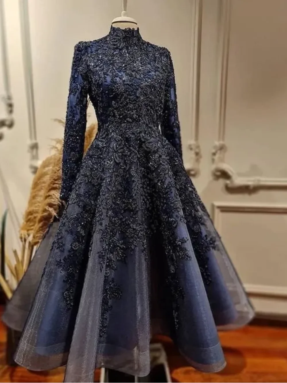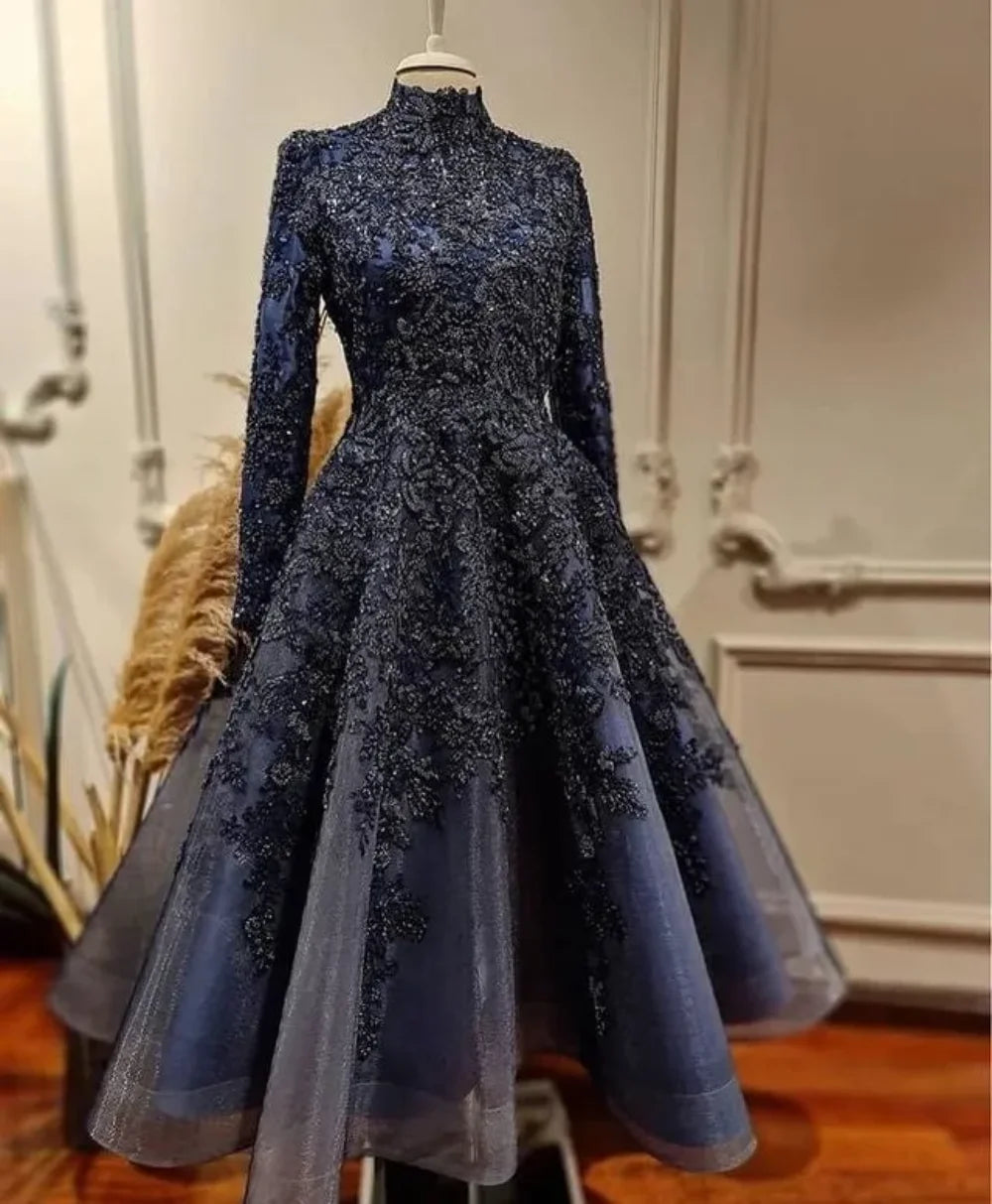 This exquisite evening dress is made with high-quality materials and is designed to highlight your curves beautifully. The lace details add a touch of opulence, making it perfect for any formal occasion.