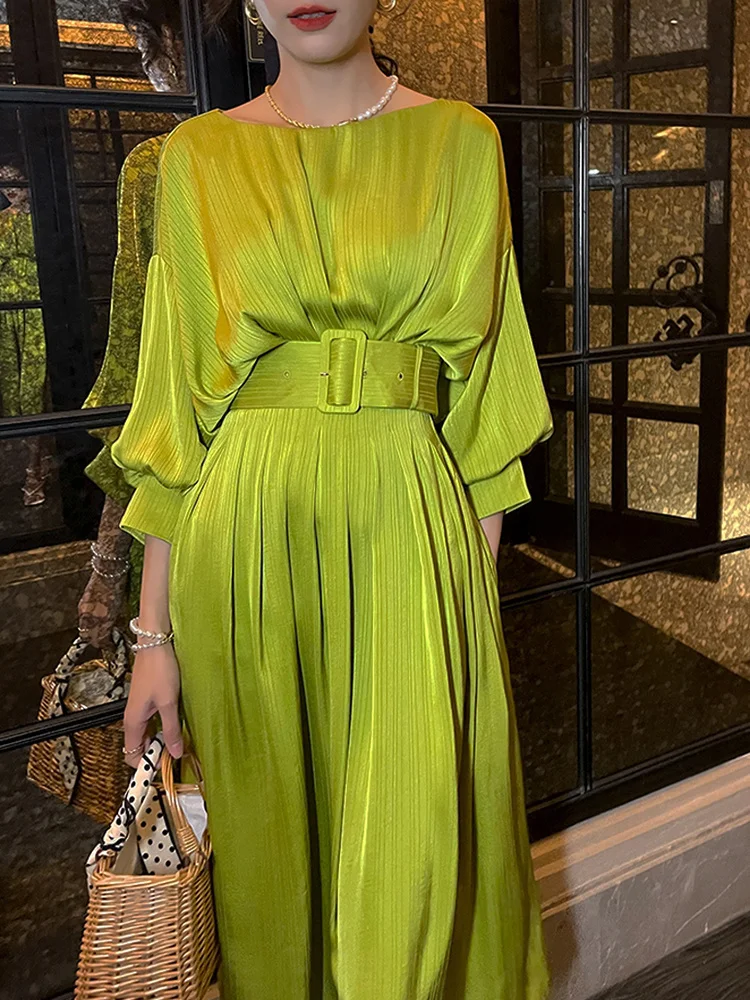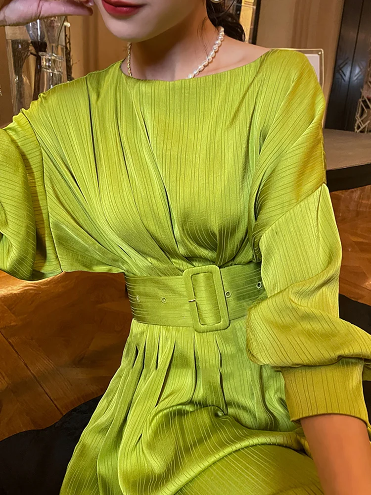 Introducing our TWOTWINSTYLE Elegant Solid Dress, the perfect addition to your wardrobe for the upcoming 2022 Spring season. This dress features a stylish slash neck and lantern sleeves, giving off an elegant and feminine vibe. The sashes and lace-up design add a touch of sophistication, making it suitable for any occasion. Available in sizes M-XL, with bust measurements ranging from 104cm to 116cm, this dress is designed to fit and flatter all body types. Made with premium quality materials, it guarantees both comfort and style. Don't miss out on this limited time offer and add this best-selling dress to your cart now!