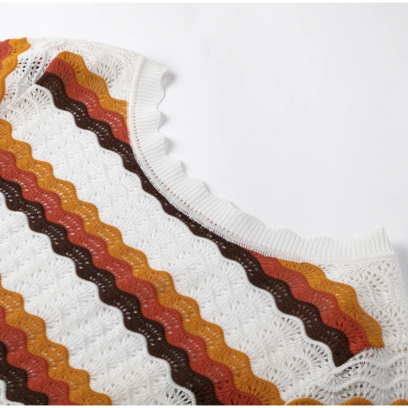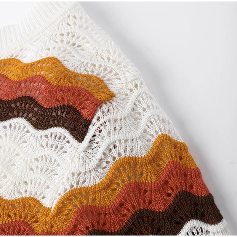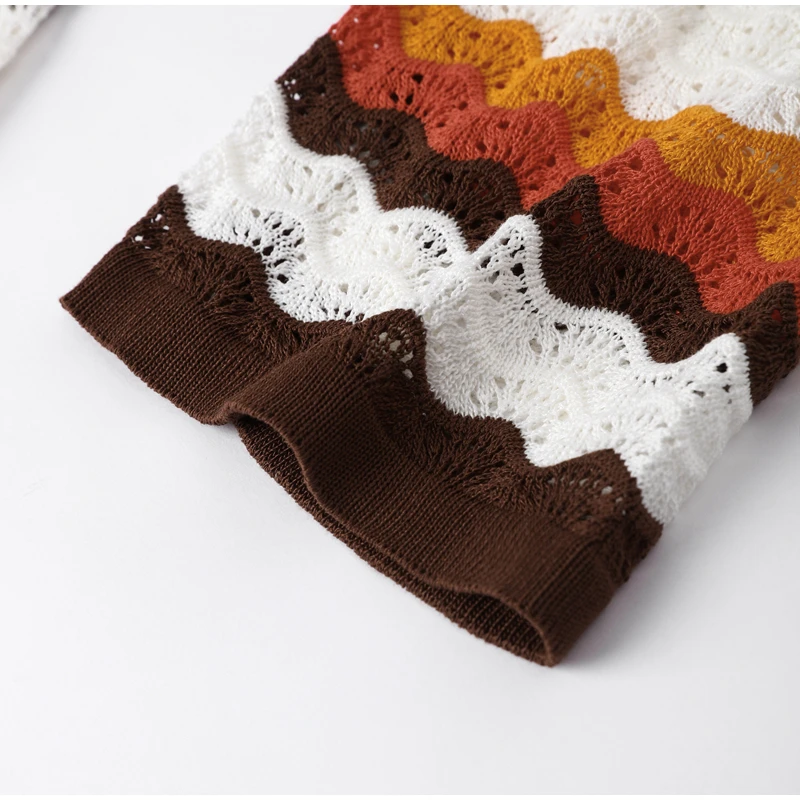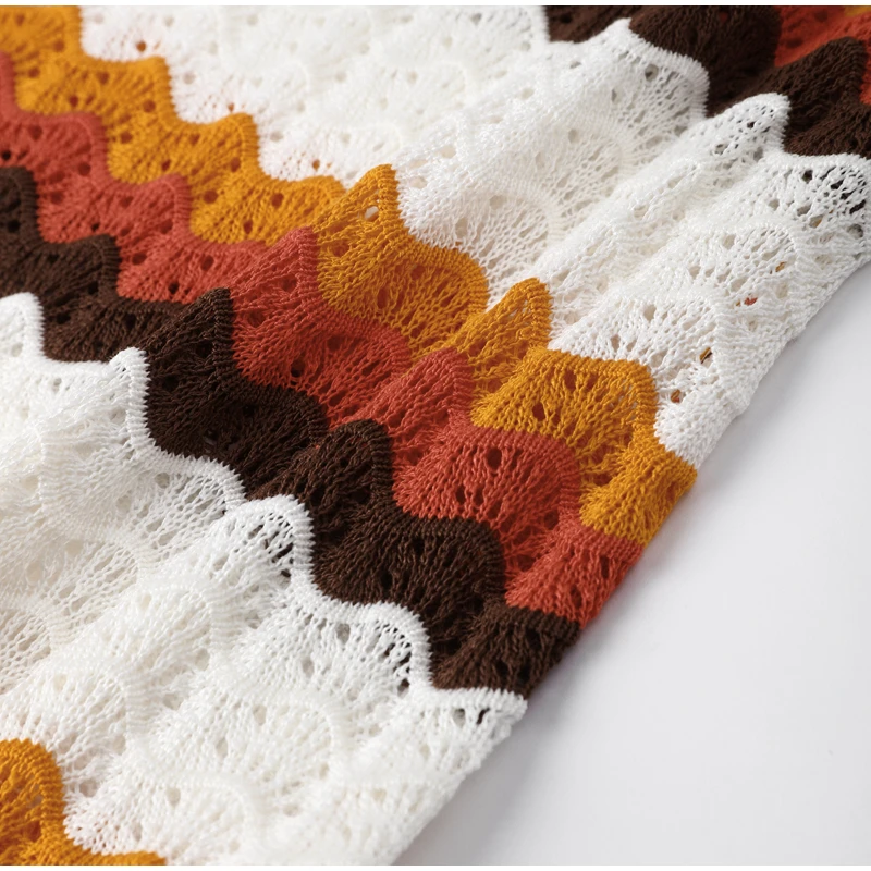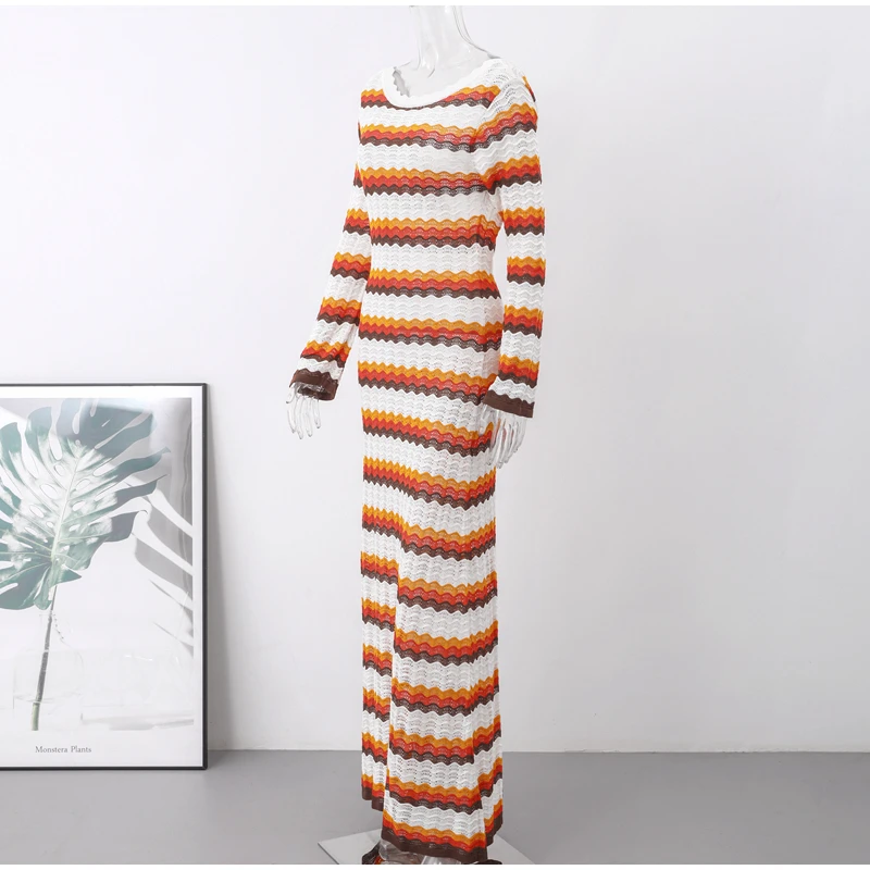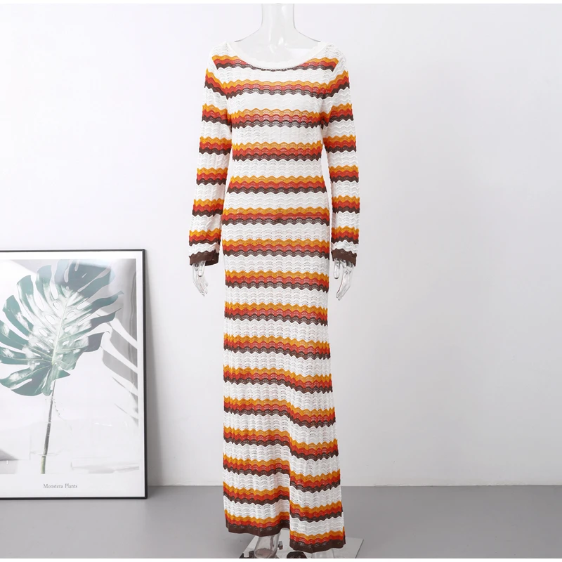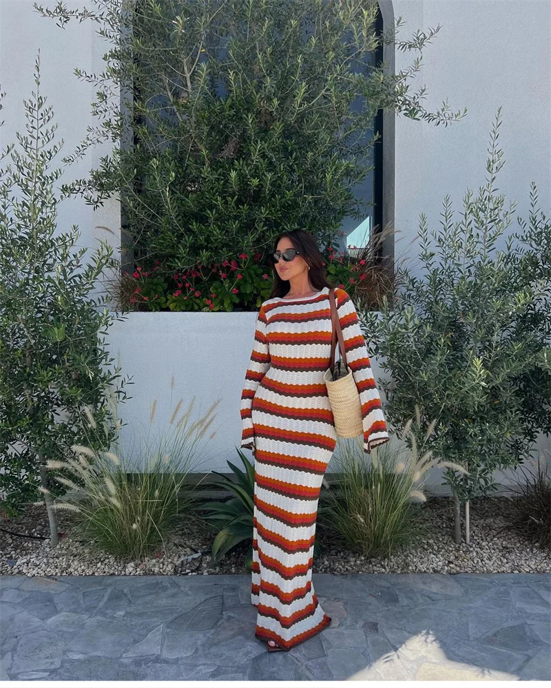 Introducing our latest fashion must-have, the Fashion Knitted Crochet Stripe Maxi Dress. This elegant dress features a unique horn sleeve design and is perfect for any occasion, from a beach day to an evening party. Made from premium materials, this dress offers a perfect fit for sizes S, M, and L. With its chic and stylish design, it's a best seller and a limited time exclusive item. Don't miss out on this perfect addition to your wardrobe. Solve your fashion dilemmas with this versatile and trendy dress. Gain confidence and style with our Fashion Knitted Crochet Stripe Maxi Dress.