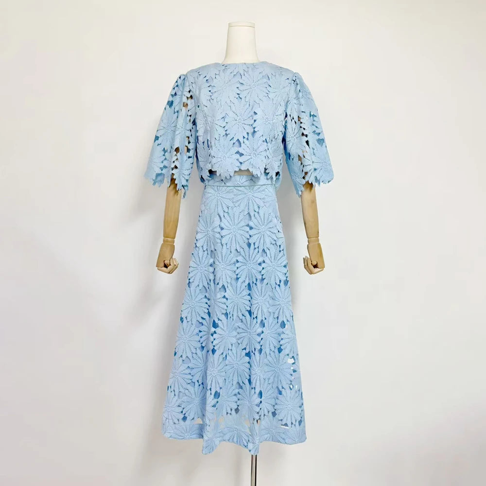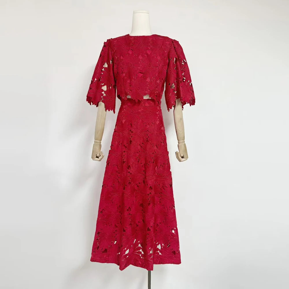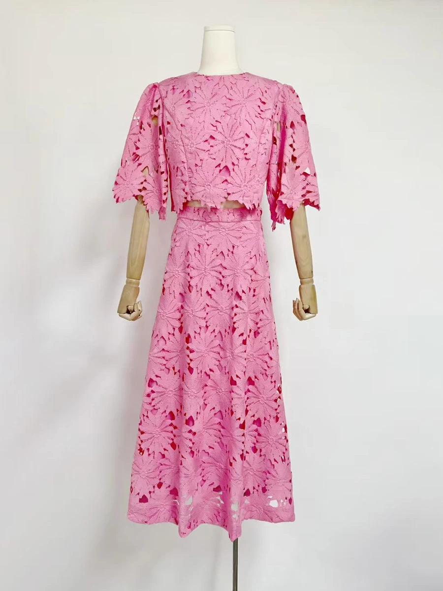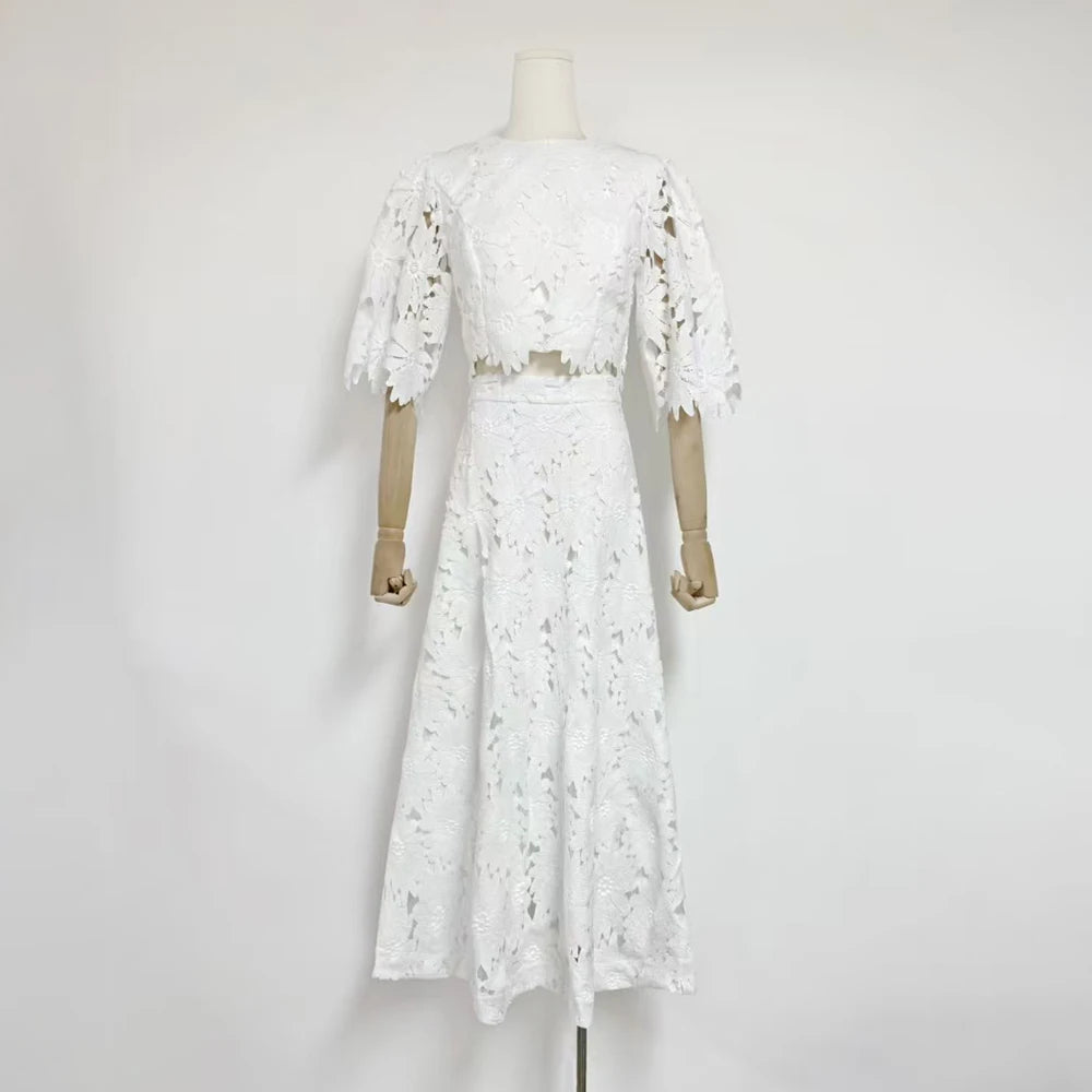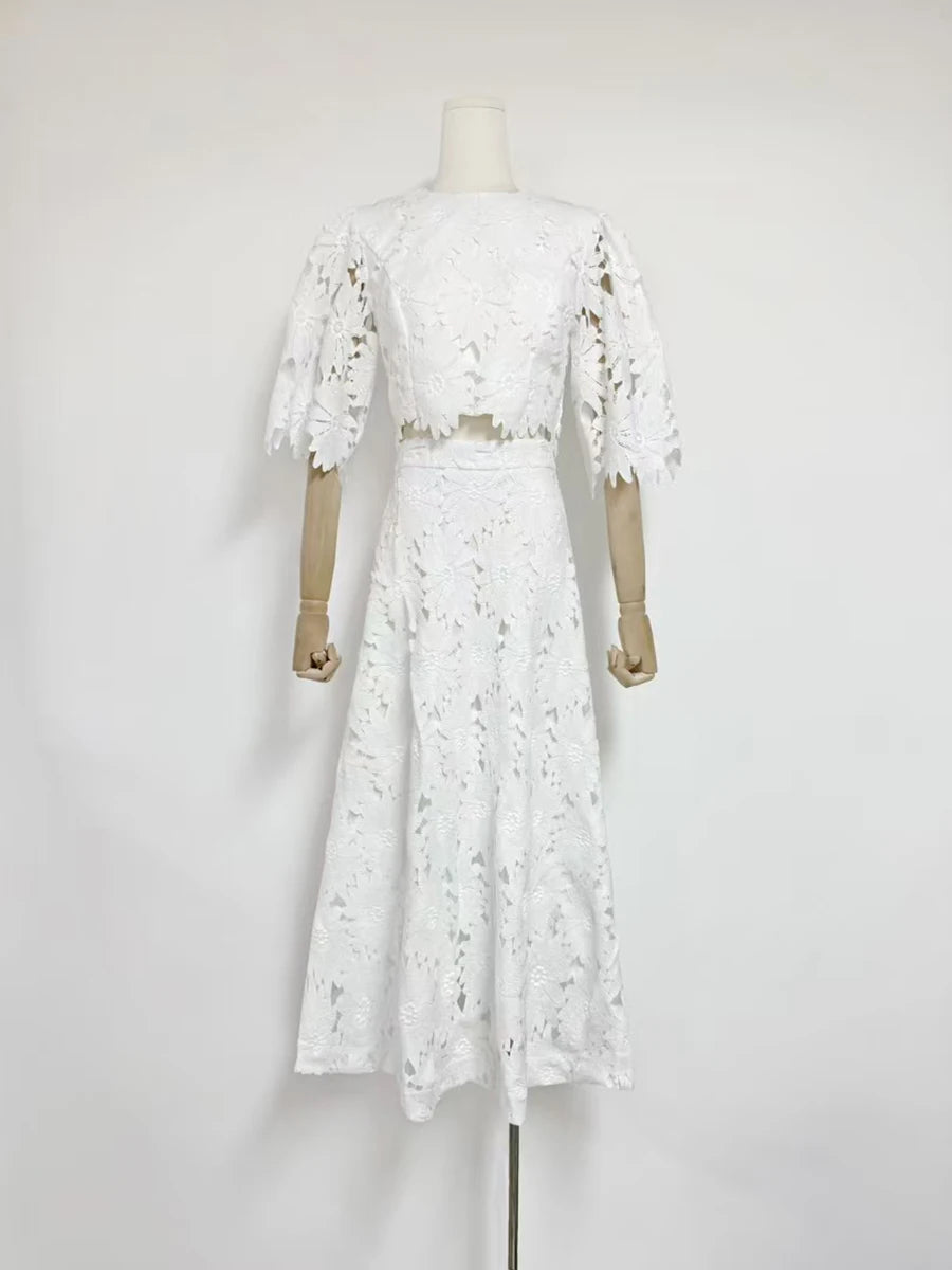 Step out in style with the Elegant VGH Embroidery Two-Piece Set, featuring a chic O-neck batwing sleeve top and a high-waist hollow-out A-line skirt. This exclusive suit is perfect for any occasion and guaranteed to make you shine.