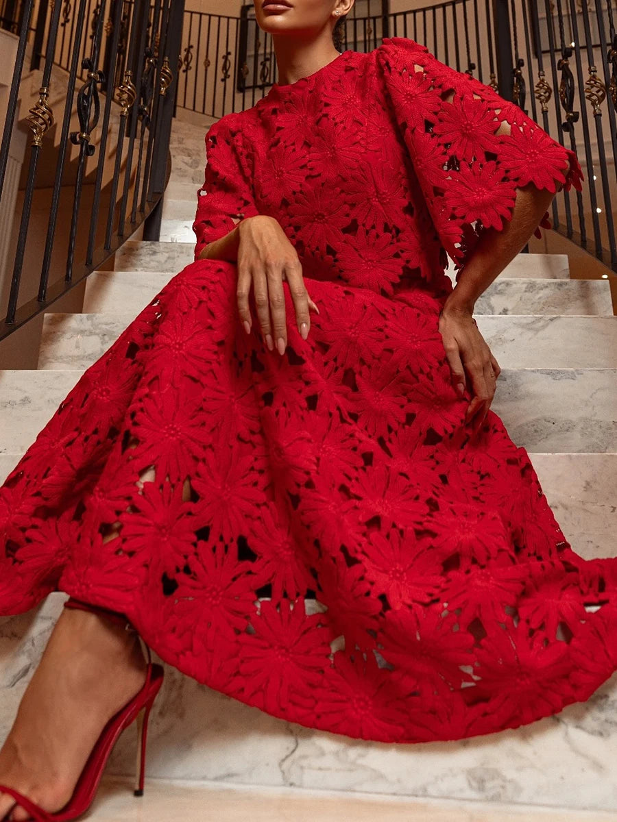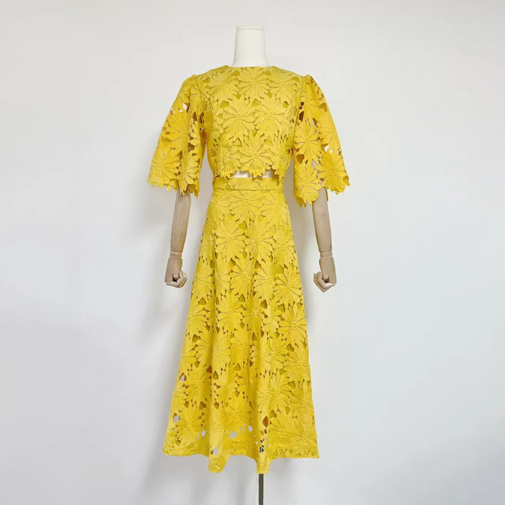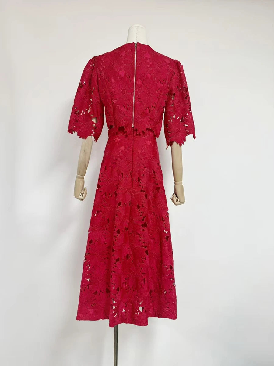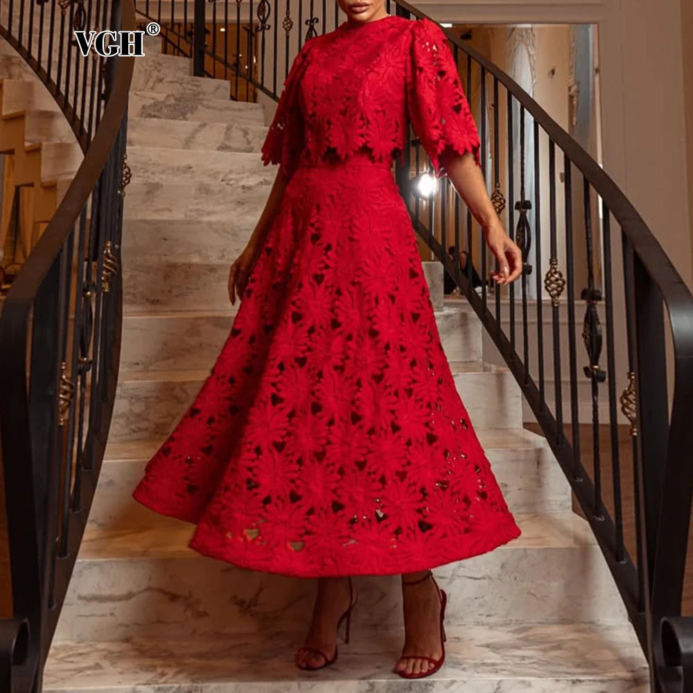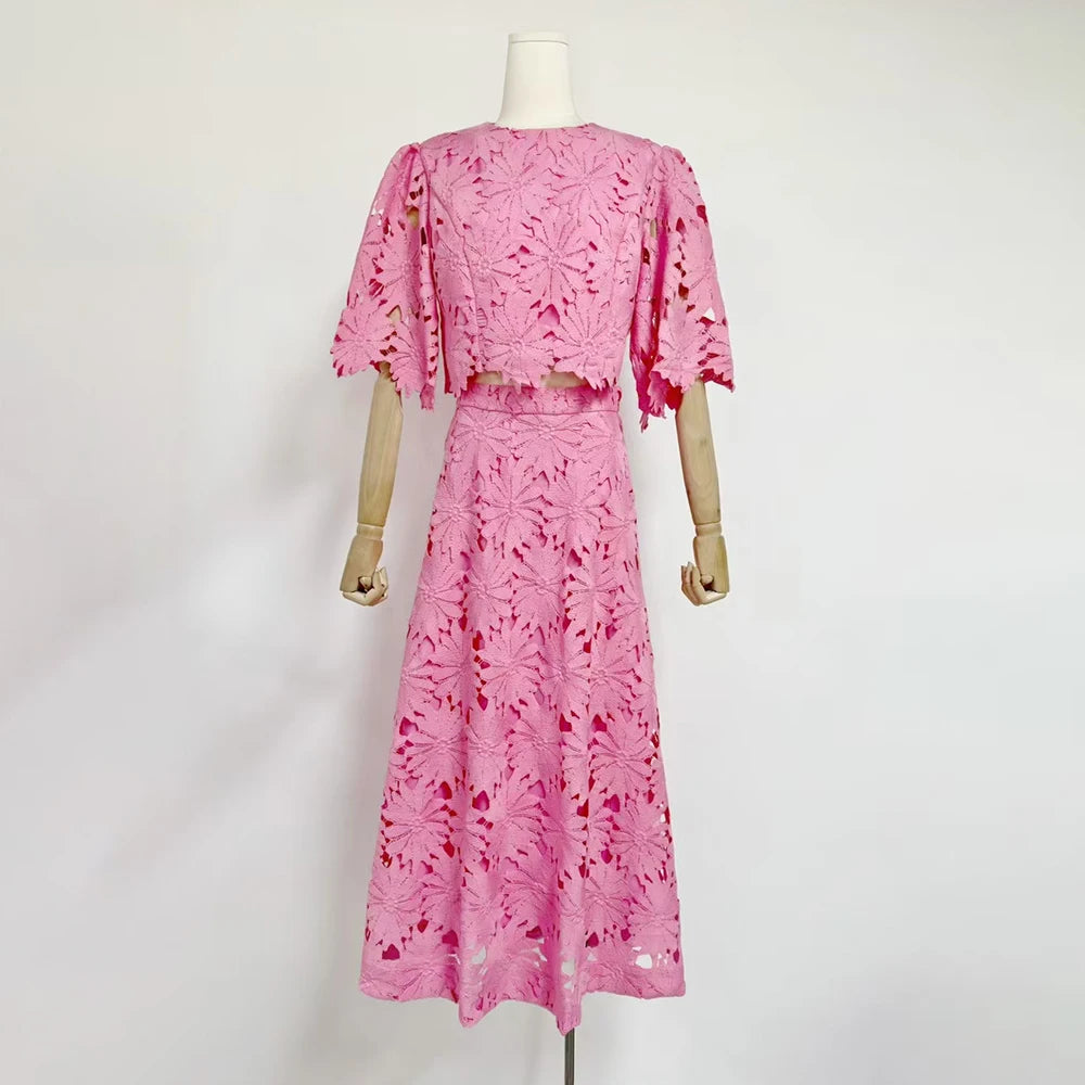 Step out in style with the Elegant VGH Embroidery Two-Piece Set, featuring a chic O-neck batwing sleeve top and a high-waist hollow-out A-line skirt. This exclusive suit is perfect for any occasion and guaranteed to make you shine.