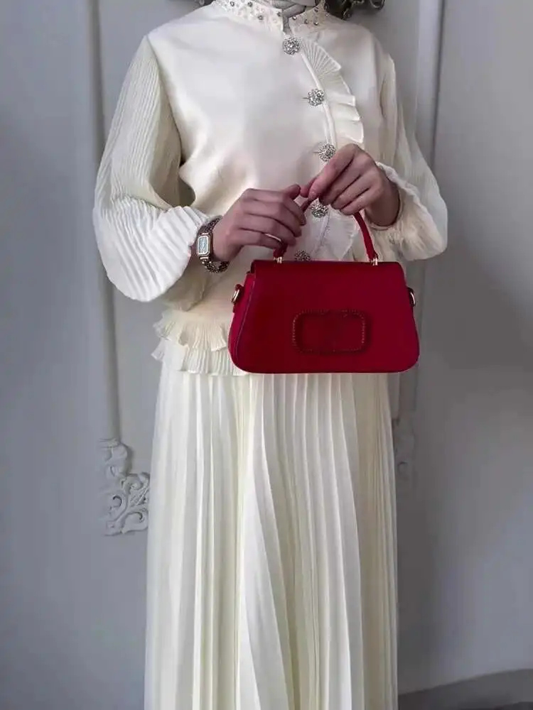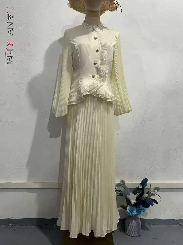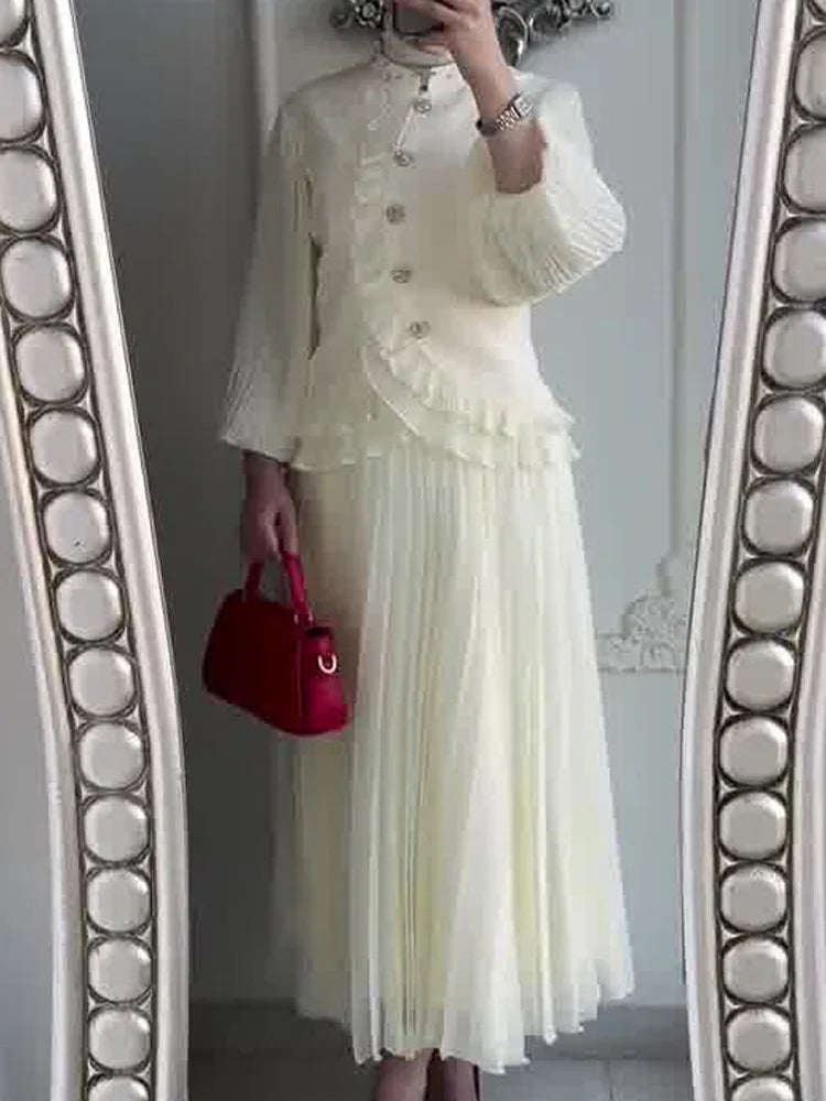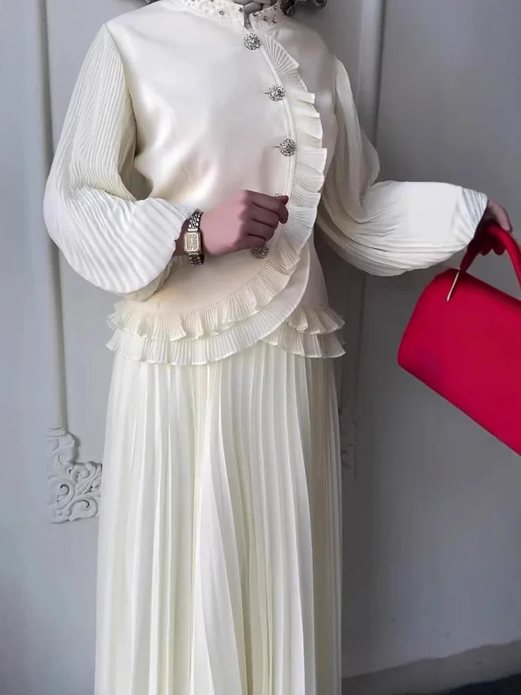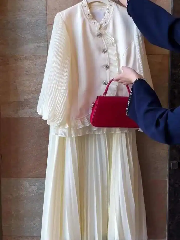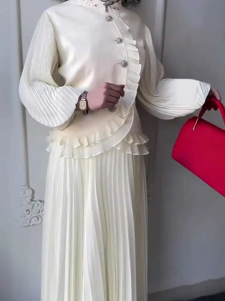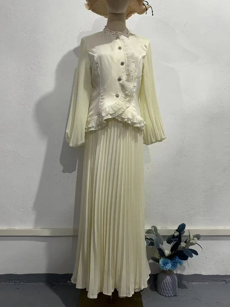 Crafted with care, the top features intricate beading and a chic stand collar, while the A-line skirt enhances your silhouette beautifully. This two-piece set is made from premium materials, ensuring both style and comfort.