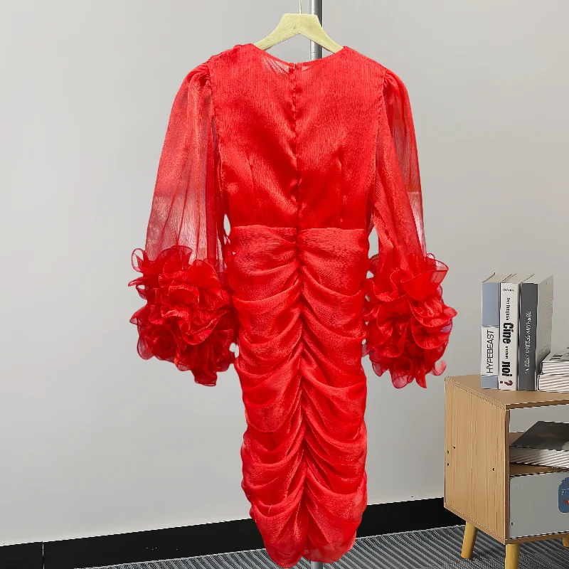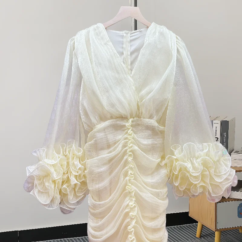 EWQ Fashion 3D Ruffle Spliced Dress For Women Solid Color V-neck Long Sleeve Zipper Slim Casual Dresses 2024 Summer New 27X484