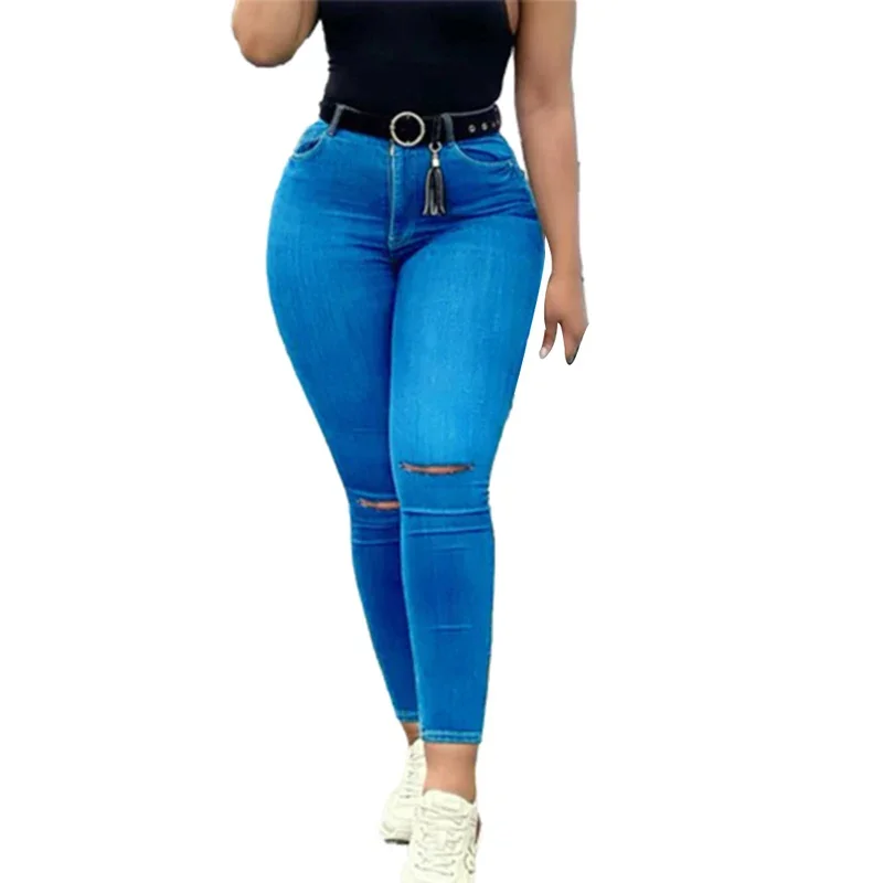 Introducing our premium Women Knee Broken Holes Pencil Jeans - the perfect blend of style and comfort. Designed with a high waist and slim fit, these jeans are made from stretch denim for a flattering and comfortable fit. Whether you're at the office or running errands, these pants are perfect for any occasion. Our size chart ensures a perfect fit, and our cold water hand washing suggestion helps maintain the shape of the jeans. Don't settle for ordinary, choose our best-selling jeans for a limited time only. Upgrade your wardrobe with our exclusive and on-the-go denim pants now.