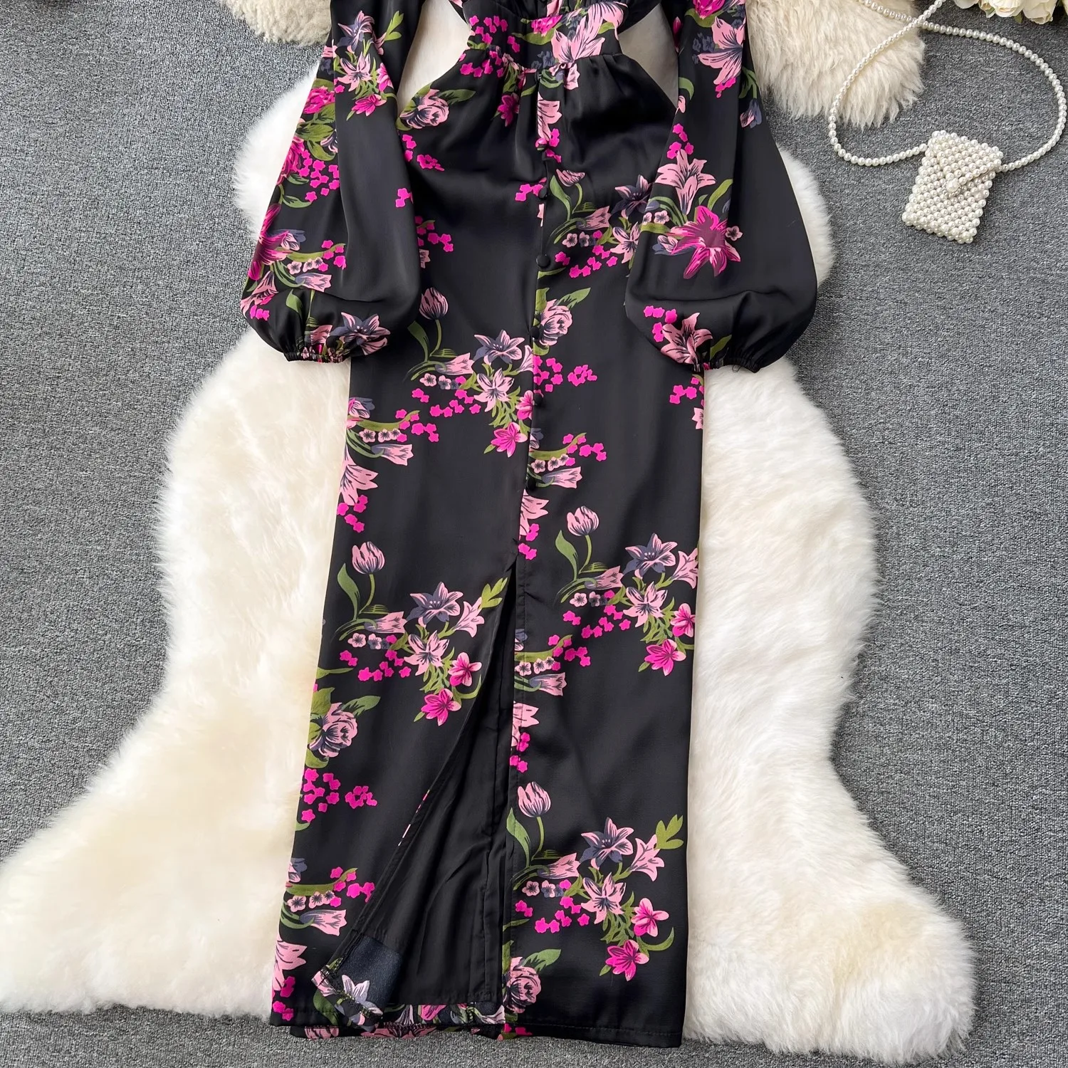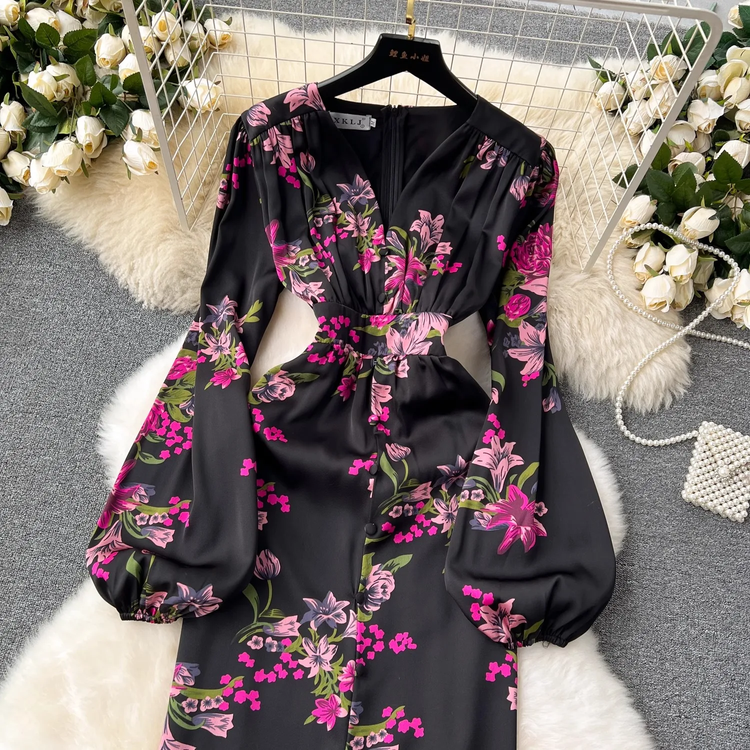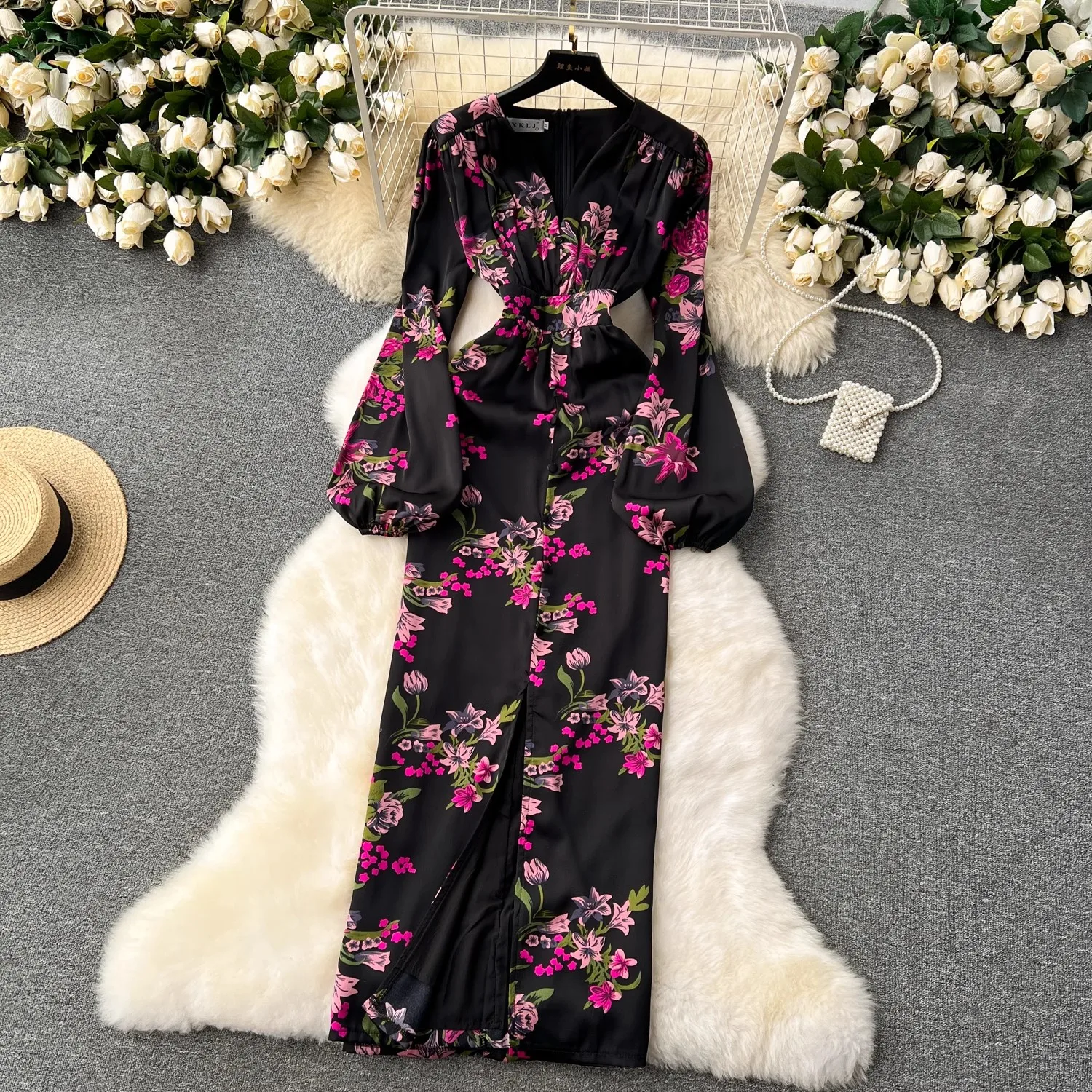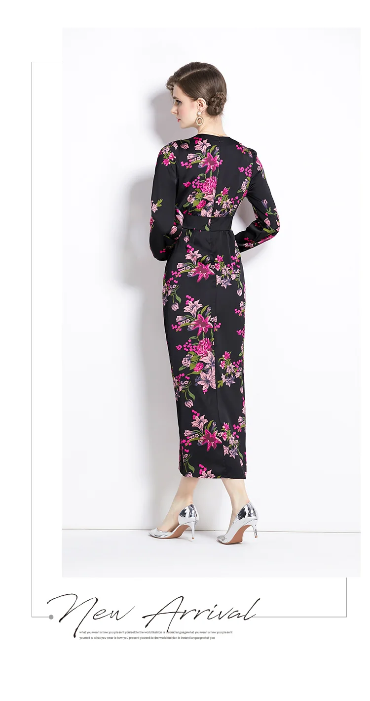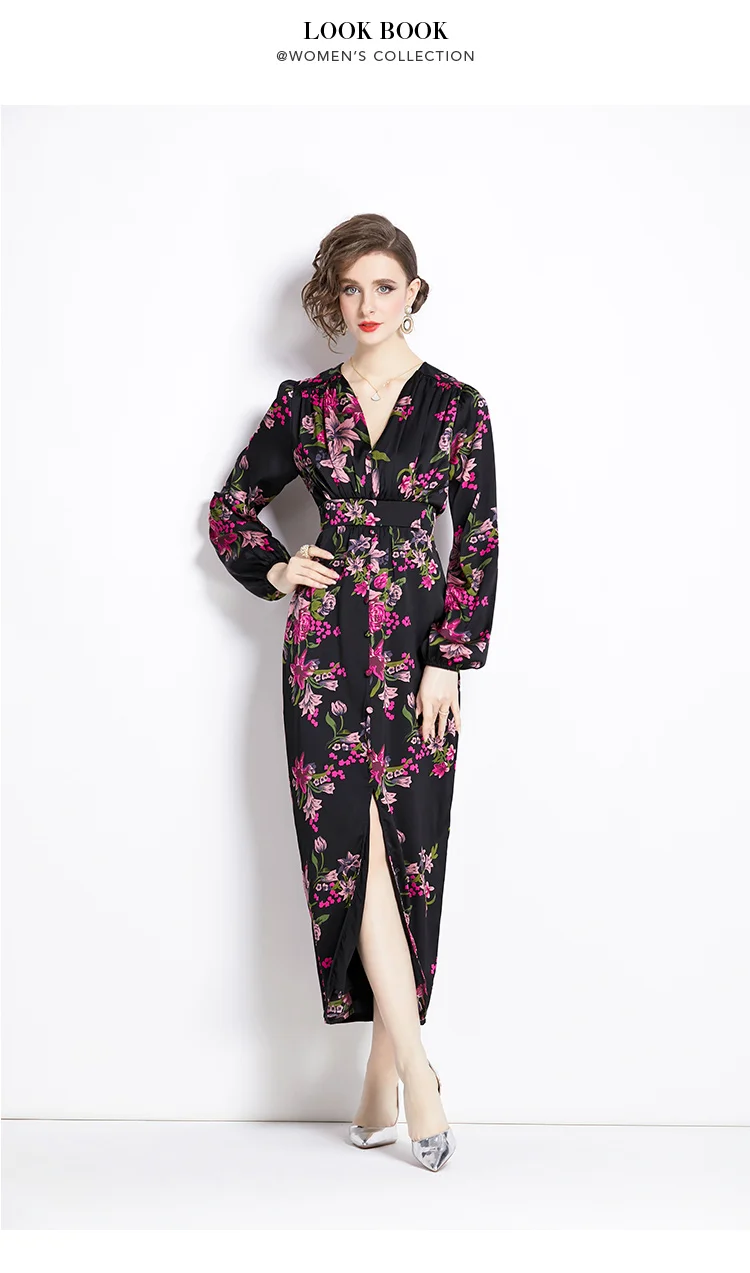 French Vintage Flower Print Lantern Sleeve Dress V Neck Evening Party Prom Vestidos Women Elegant Occasion Pencil Split Clothes