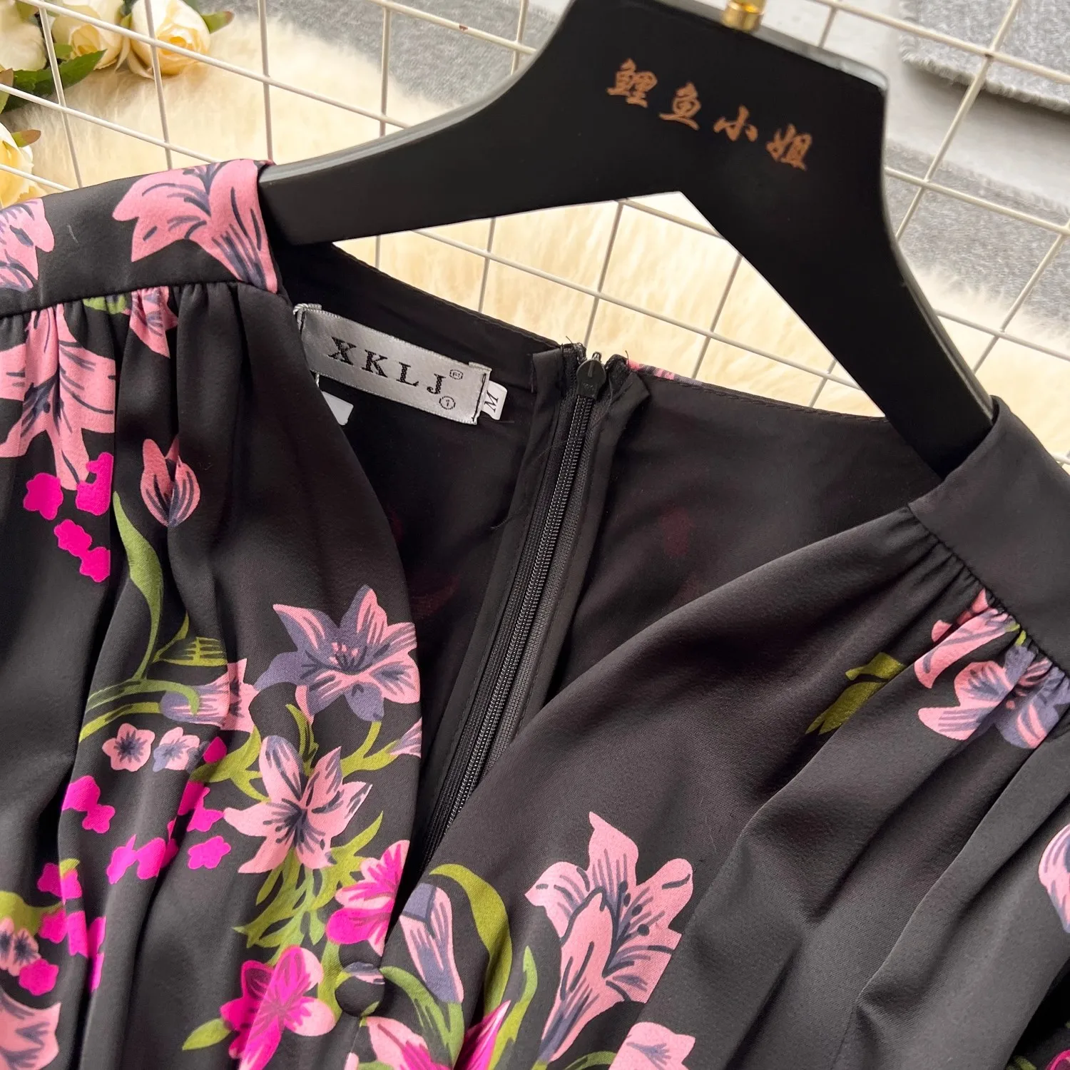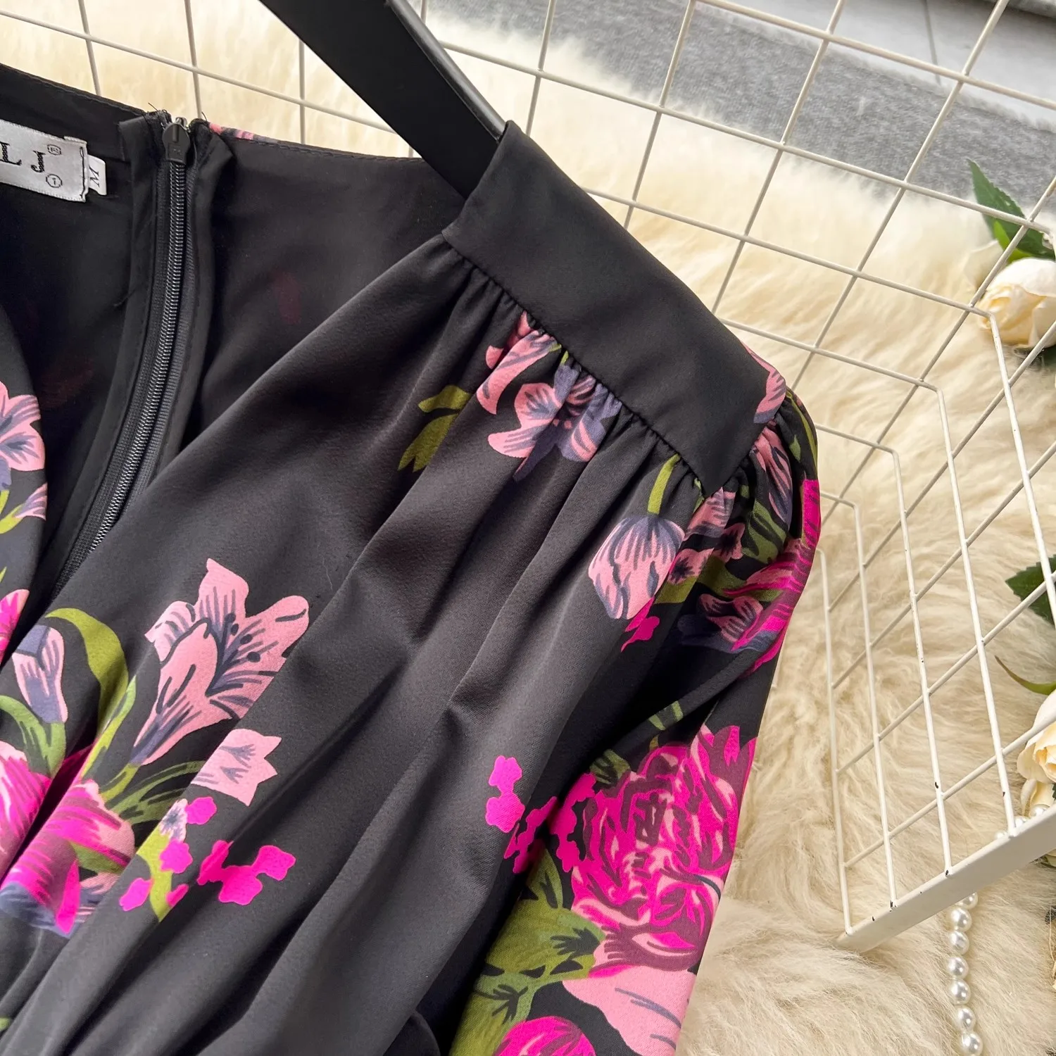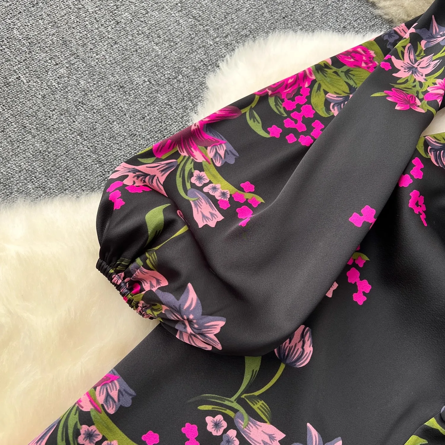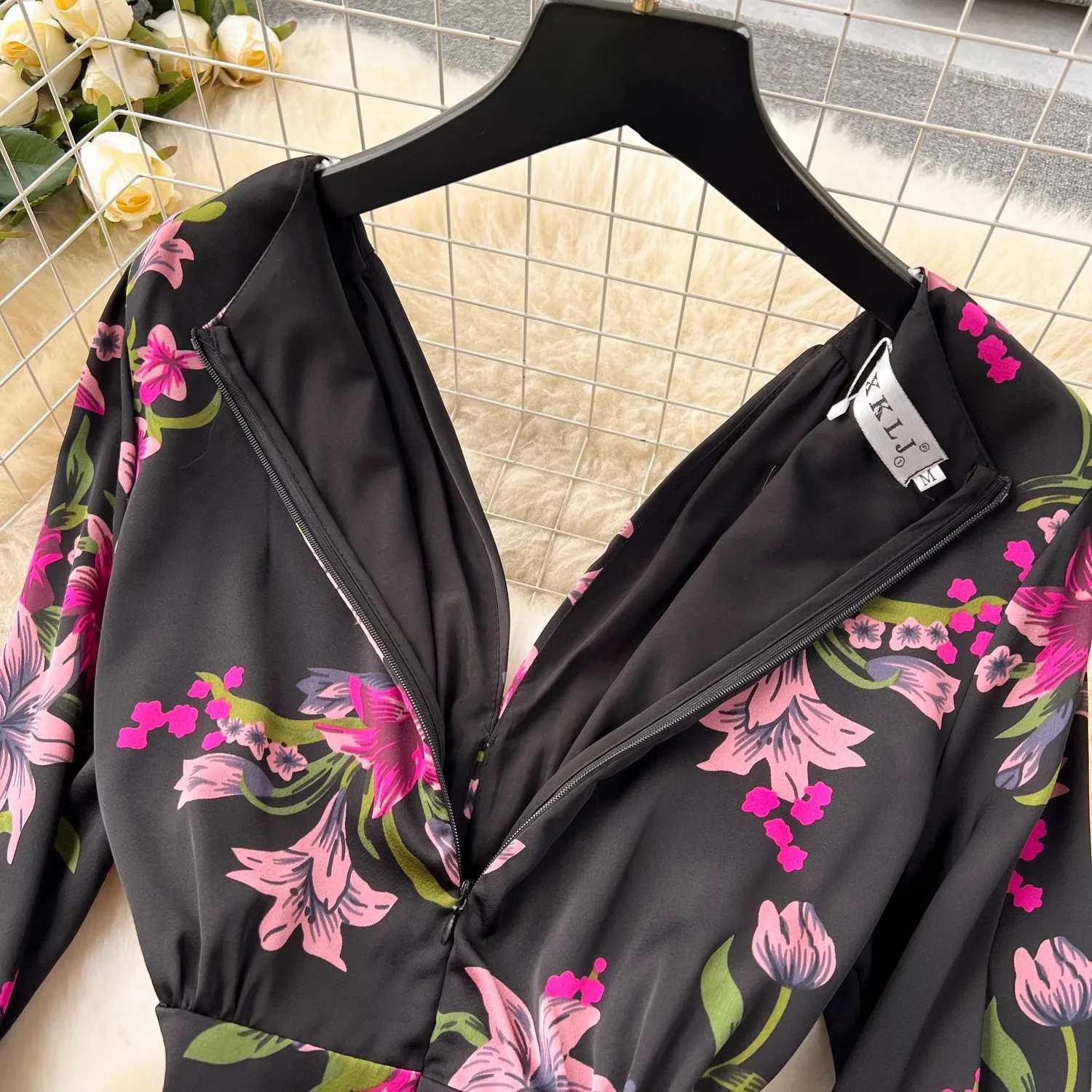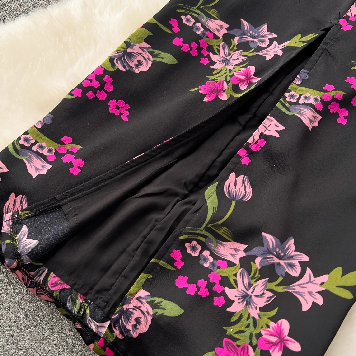 French Vintage Flower Print Lantern Sleeve Dress V Neck Evening Party Prom Vestidos Women Elegant Occasion Pencil Split Clothes