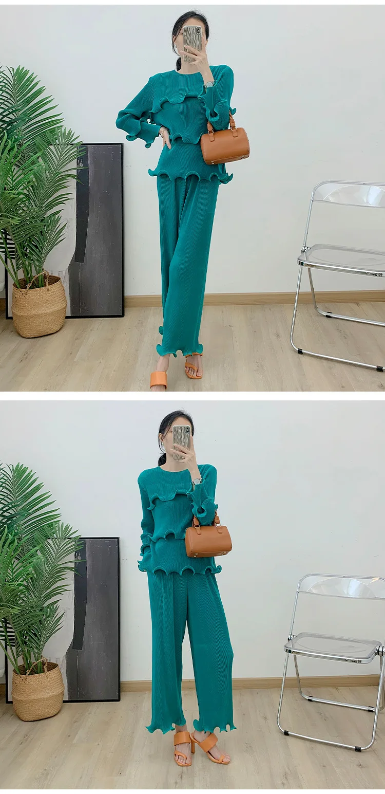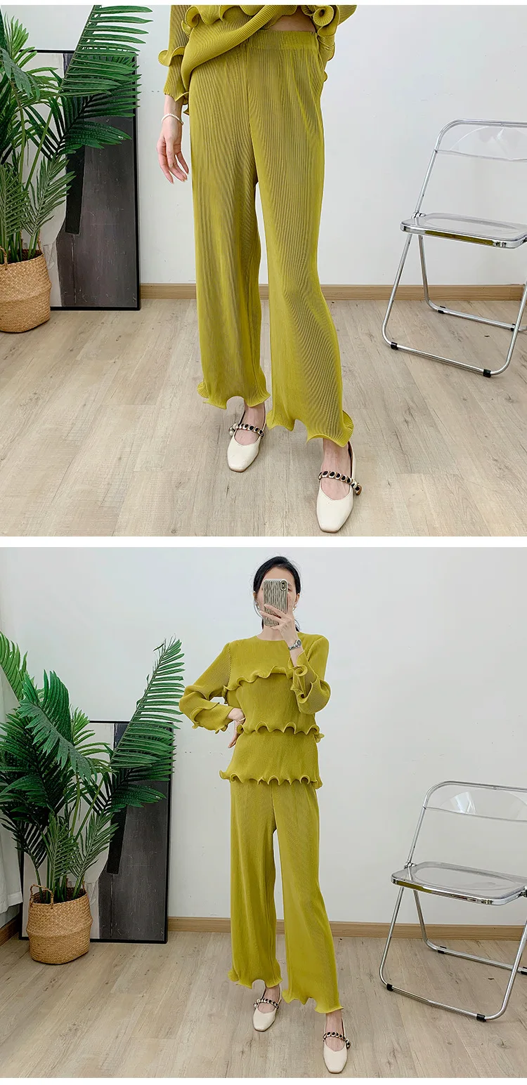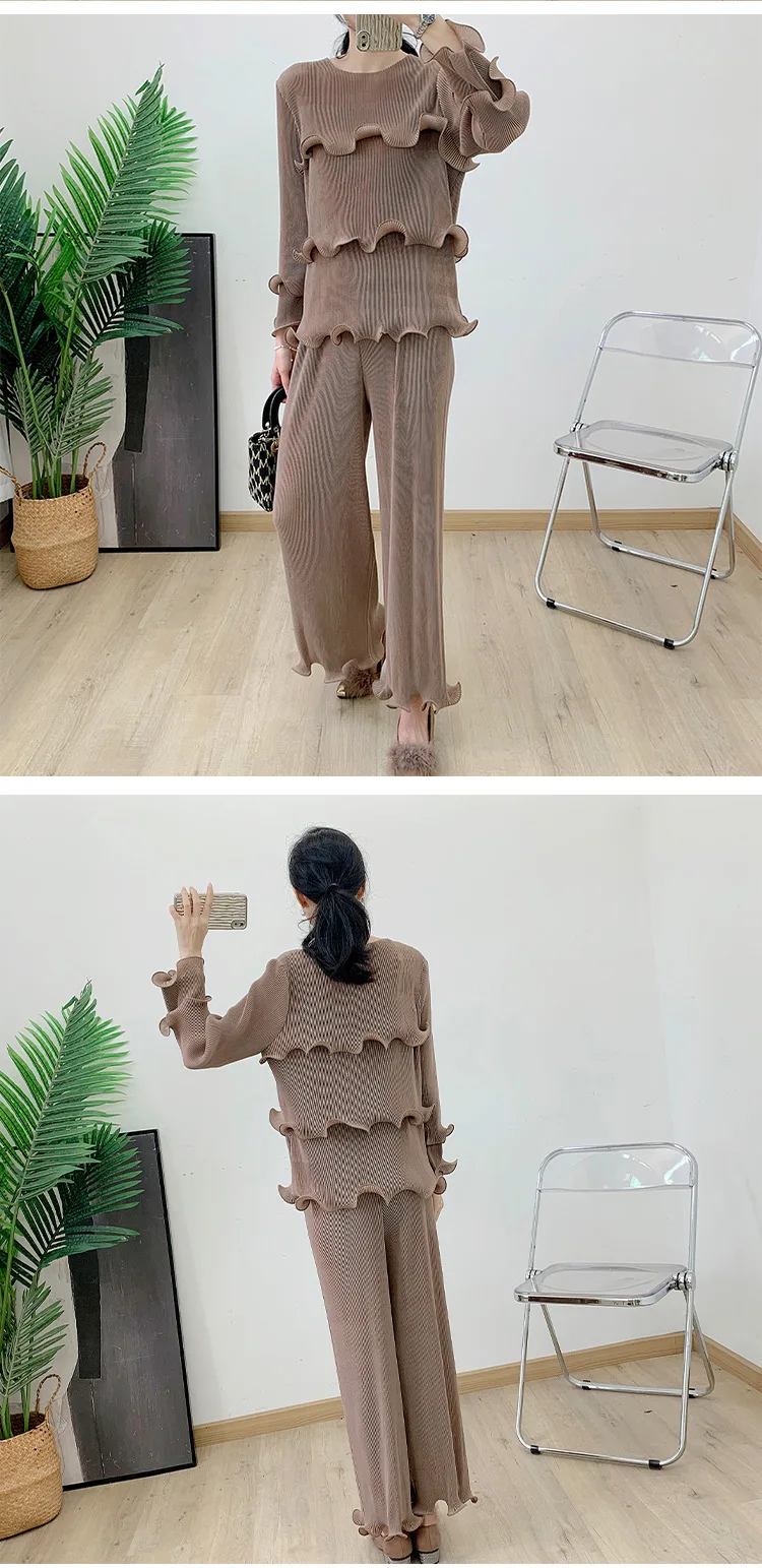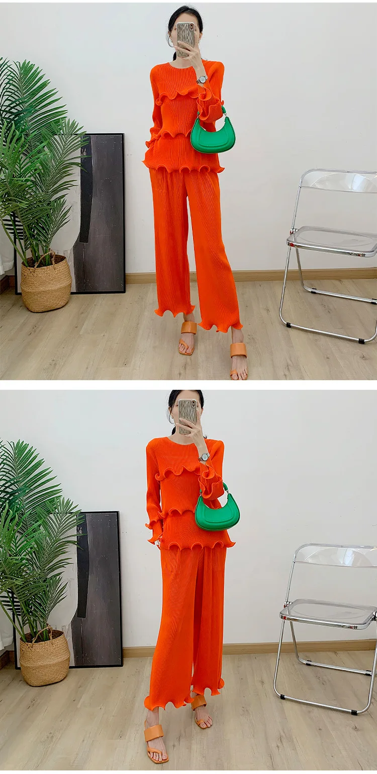 Add a fashionable flair to your wardrobe with this versatile 2-piece set. Perfect for any occasion, whether you're heading to brunch with friends or a night out on the town. The pleated design adds a trendy touch, while the wide-leg trousers ensure comfort and style all day long.
