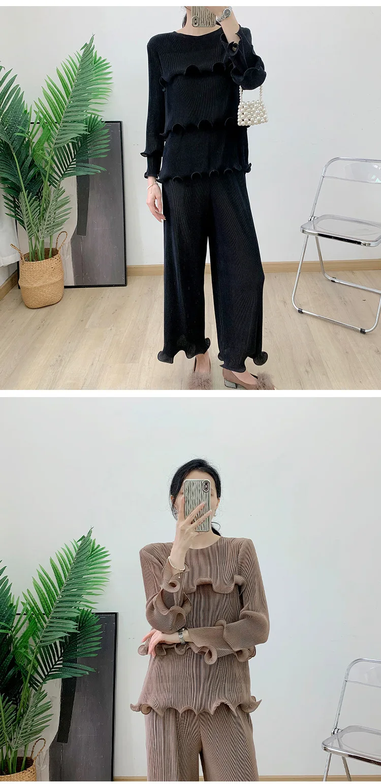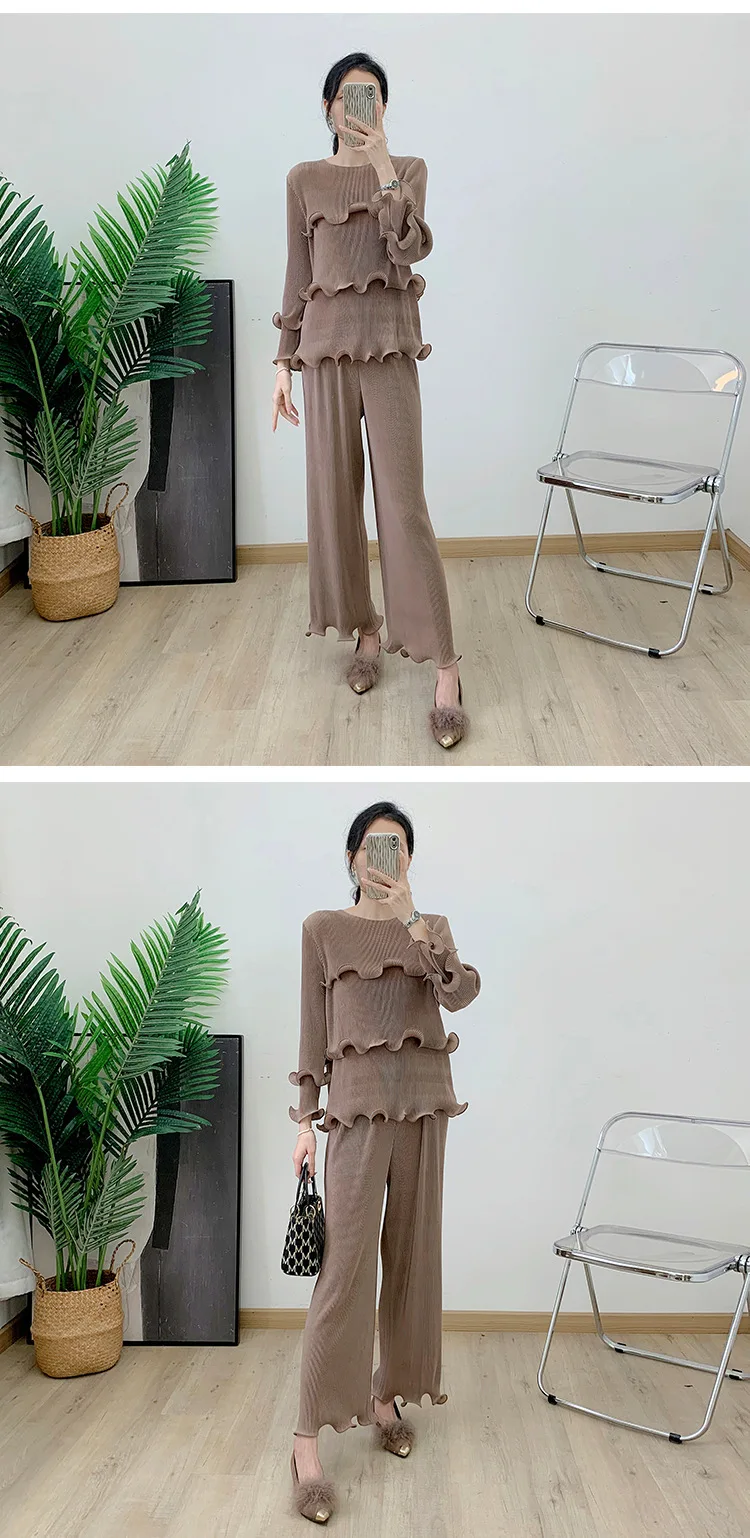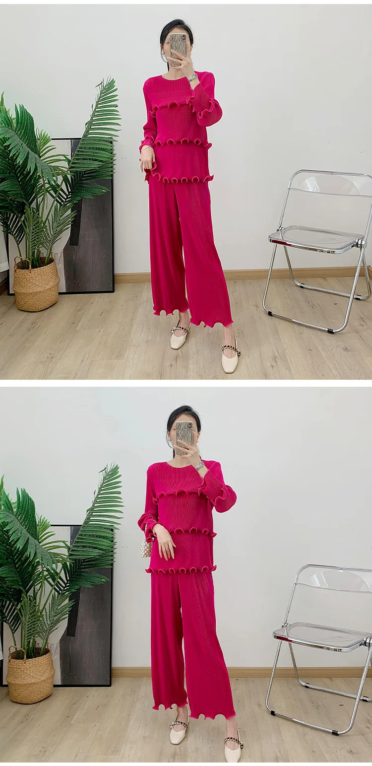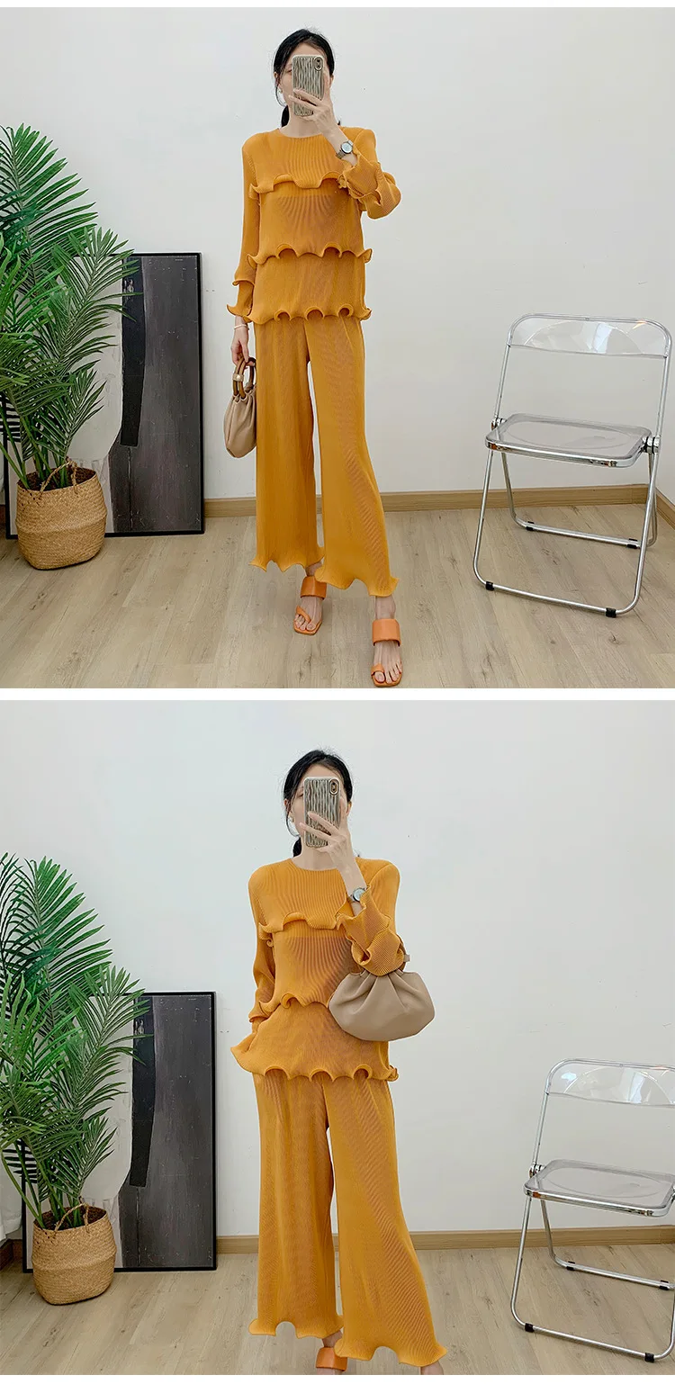 Add a fashionable flair to your wardrobe with this versatile 2-piece set. Perfect for any occasion, whether you're heading to brunch with friends or a night out on the town. The pleated design adds a trendy touch, while the wide-leg trousers ensure comfort and style all day long.