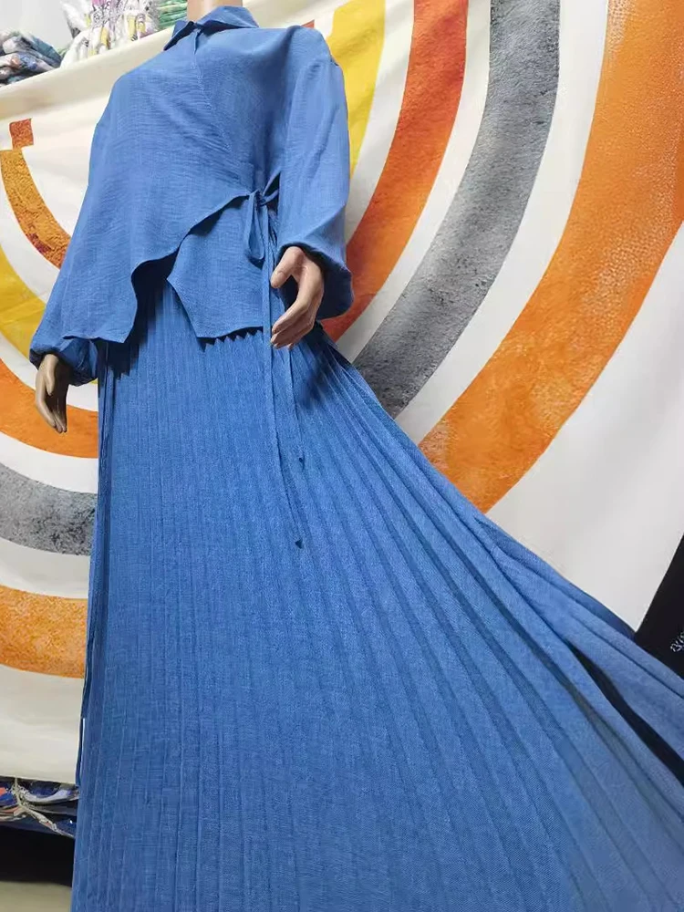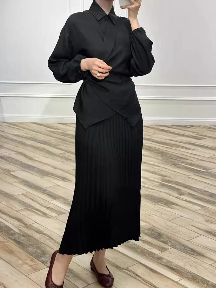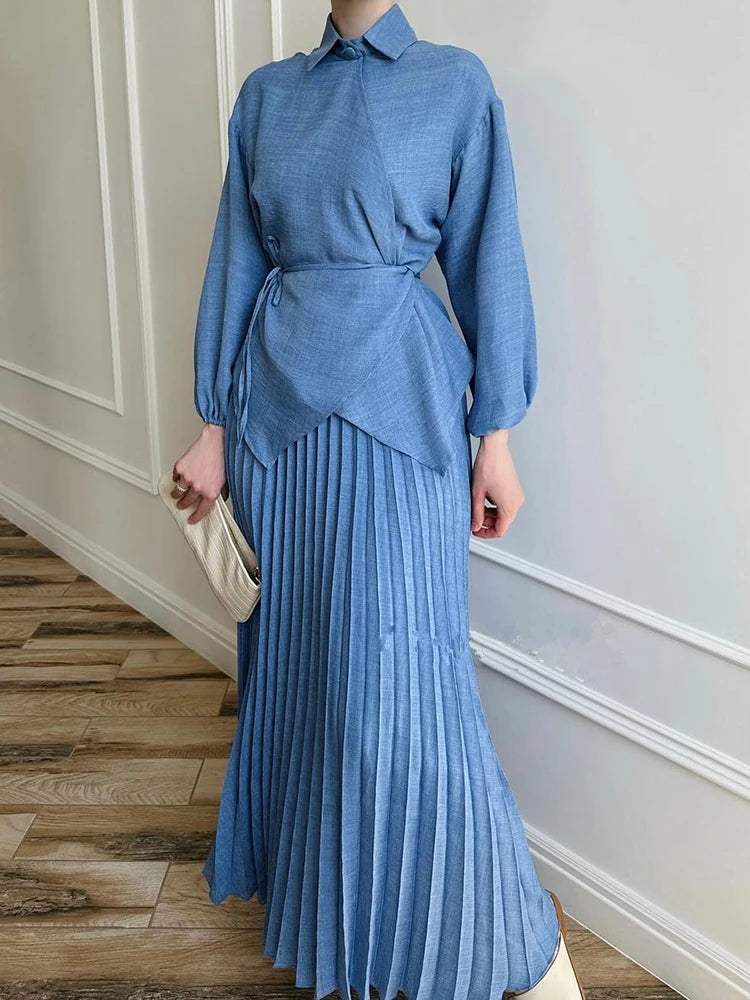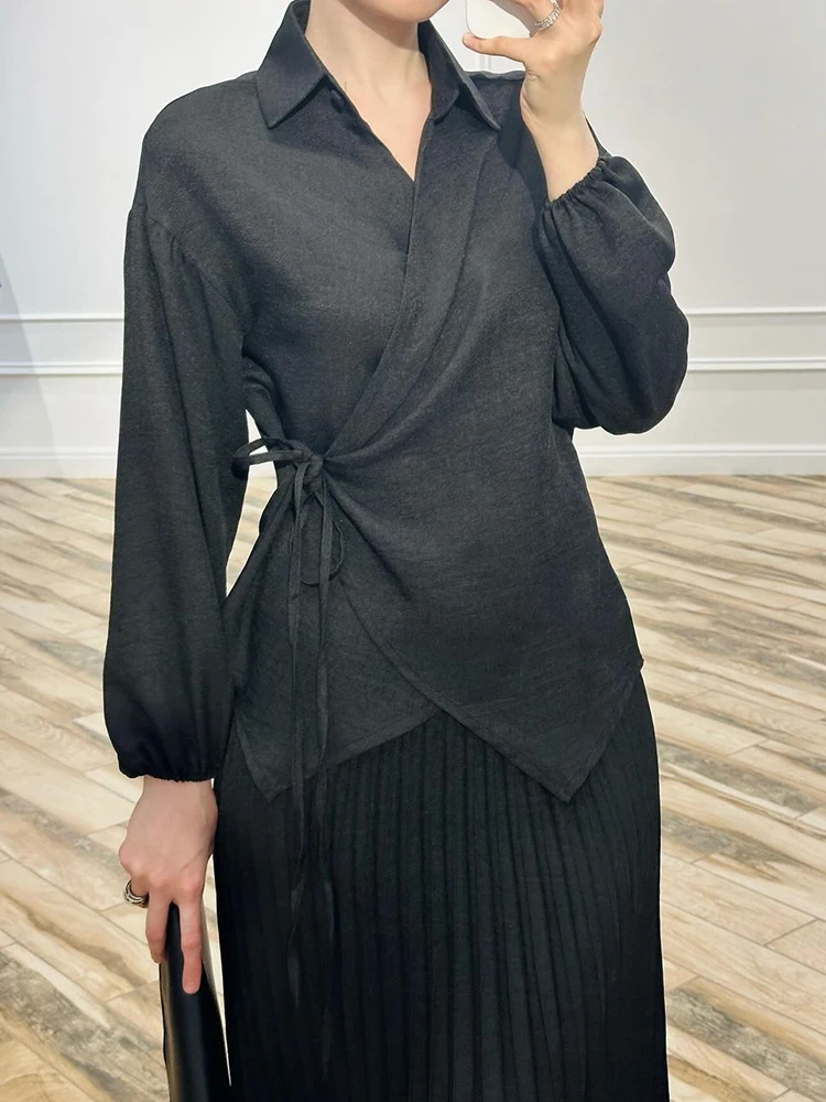 🌟 What it is - A fashion-forward ensemble featuring a lace-up full sleeve shirt and an elegant A-line skirt in solid colors for a chic look.