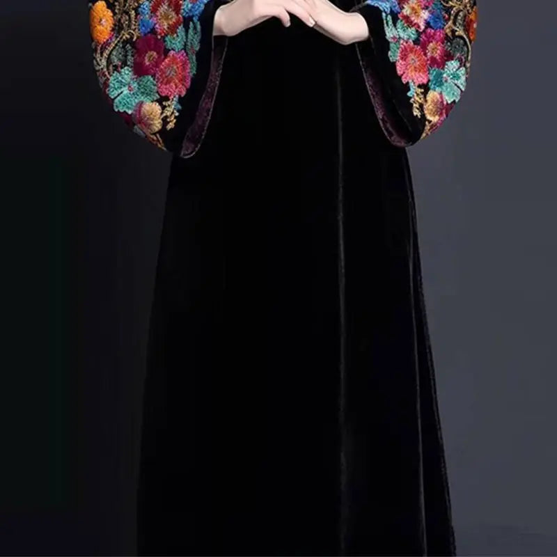 This luxurious dress features a noble silhouette accented with intricate embroidery, perfect for any high-end event. Made from rich velvet, it provides a lovely drape while keeping you cozy during cooler months.