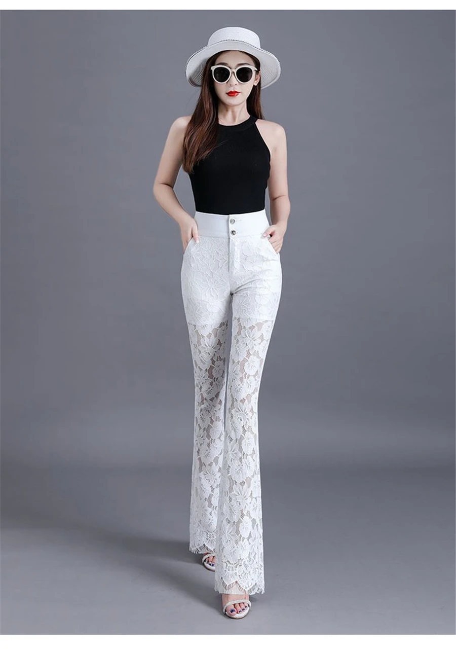 Introducing our Lace Patchwork Flare Pants, the ultimate addition to your summer wardrobe. Made with the highest quality materials and featuring a delicate hollow out design, these pants are perfect for any occasion. Our Asian sizing ensures the perfect fit, and with our size chart, you can easily find your size. These pants are not only stylish, but also solve the problem of finding comfortable yet elegant trousers. Don't miss out on this limited time offer and elevate your fashion game with our best-selling Korean fashion pants.