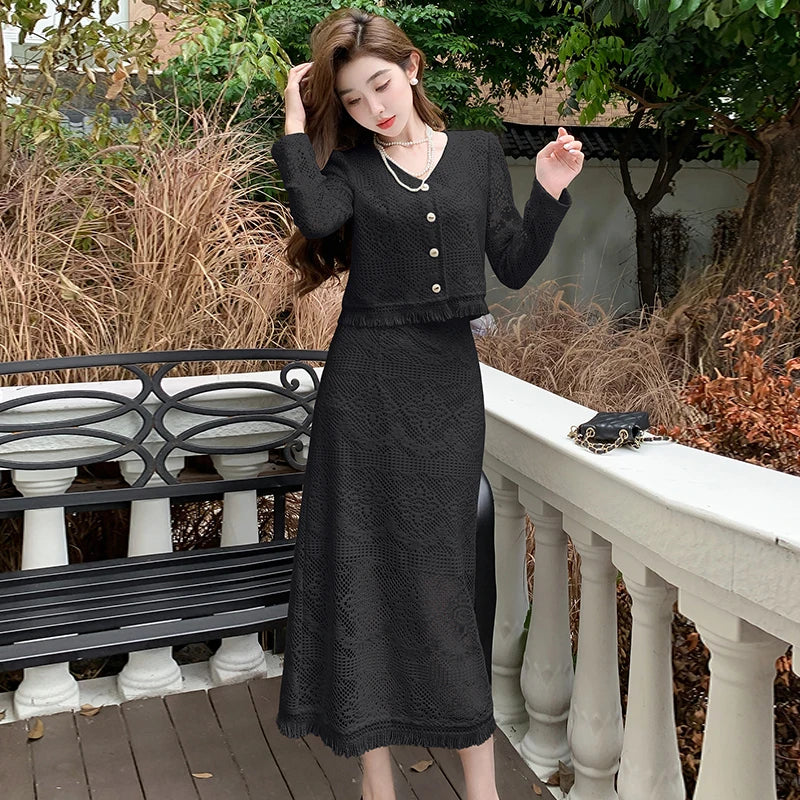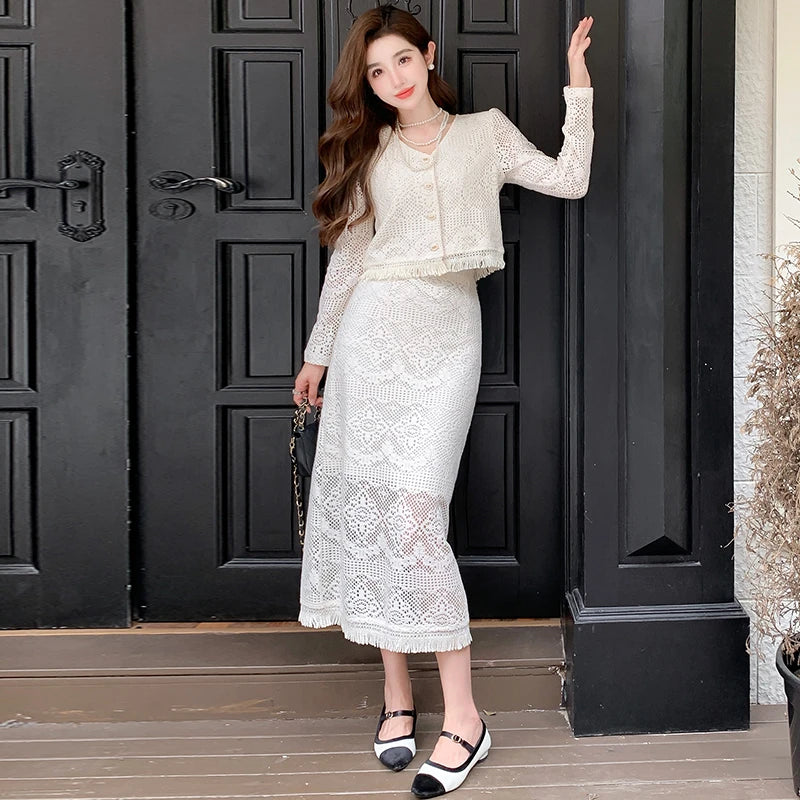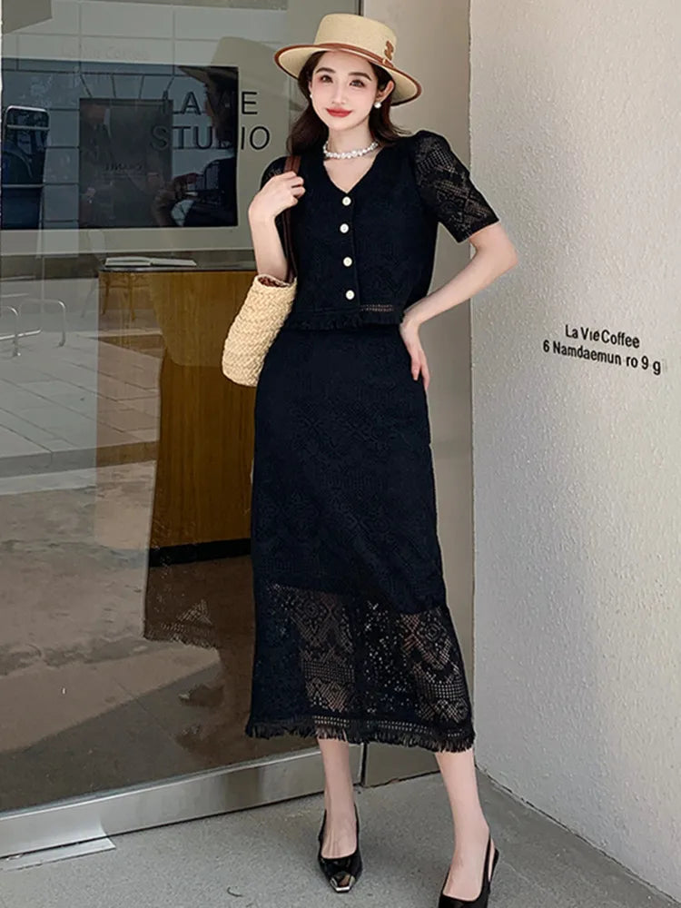 Introducing our newest addition to the Korean fashion scene - the Lace Two Piece Set for Women. This set is perfect for the summer with its tassel v-neck short sleeve shirt and high waist long skirt. Our carefully crafted design ensures a perfect fit and the highest quality materials for a premium look and feel. This set is a best seller and is perfect for any occasion, whether you're on the go or looking for an exclusive outfit. Don't miss out on this limited time offer and add this set to your wardrobe today!