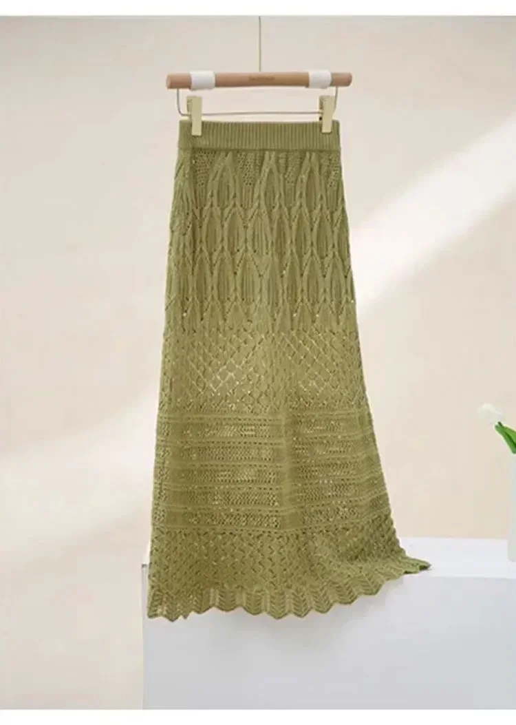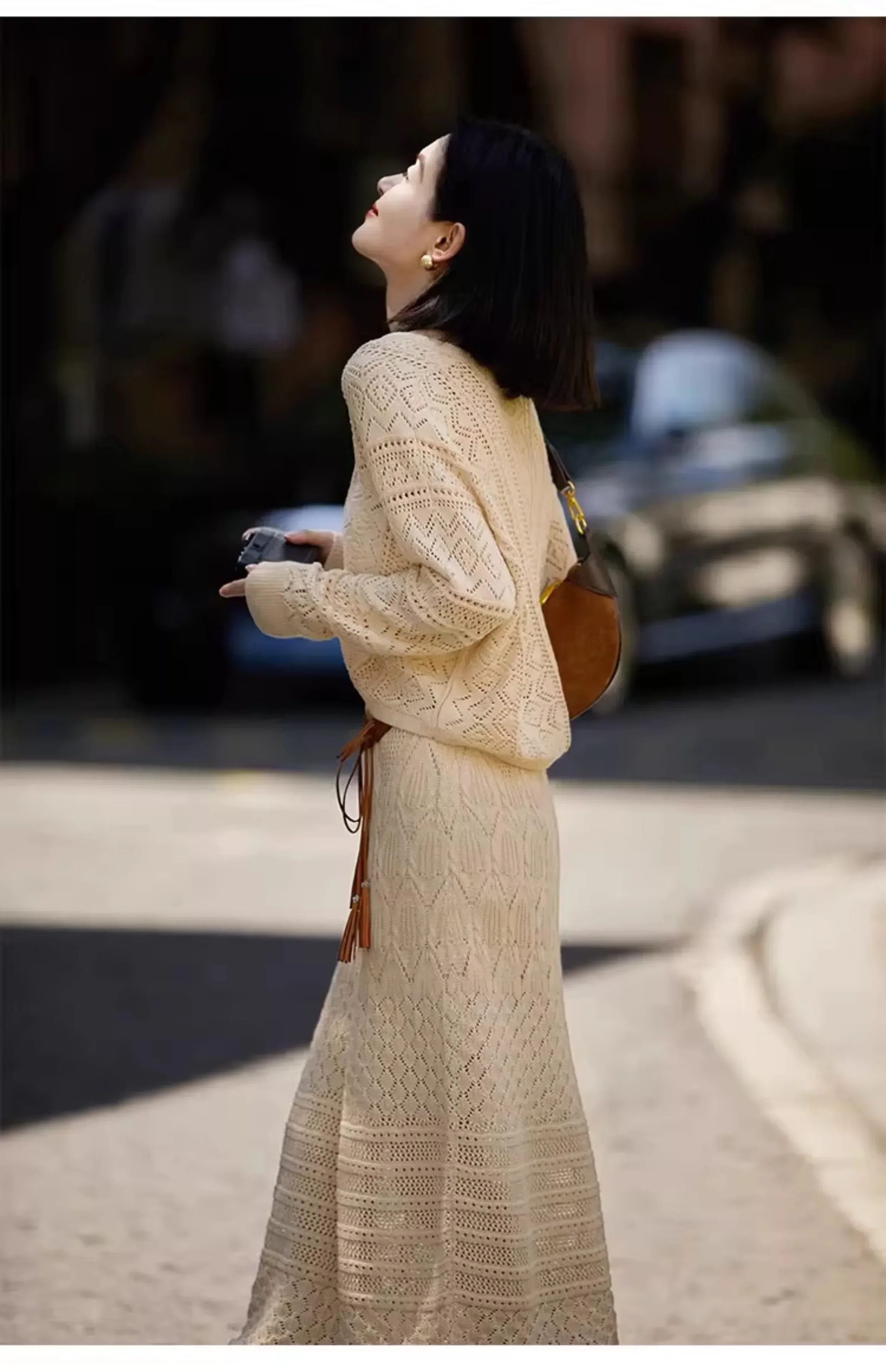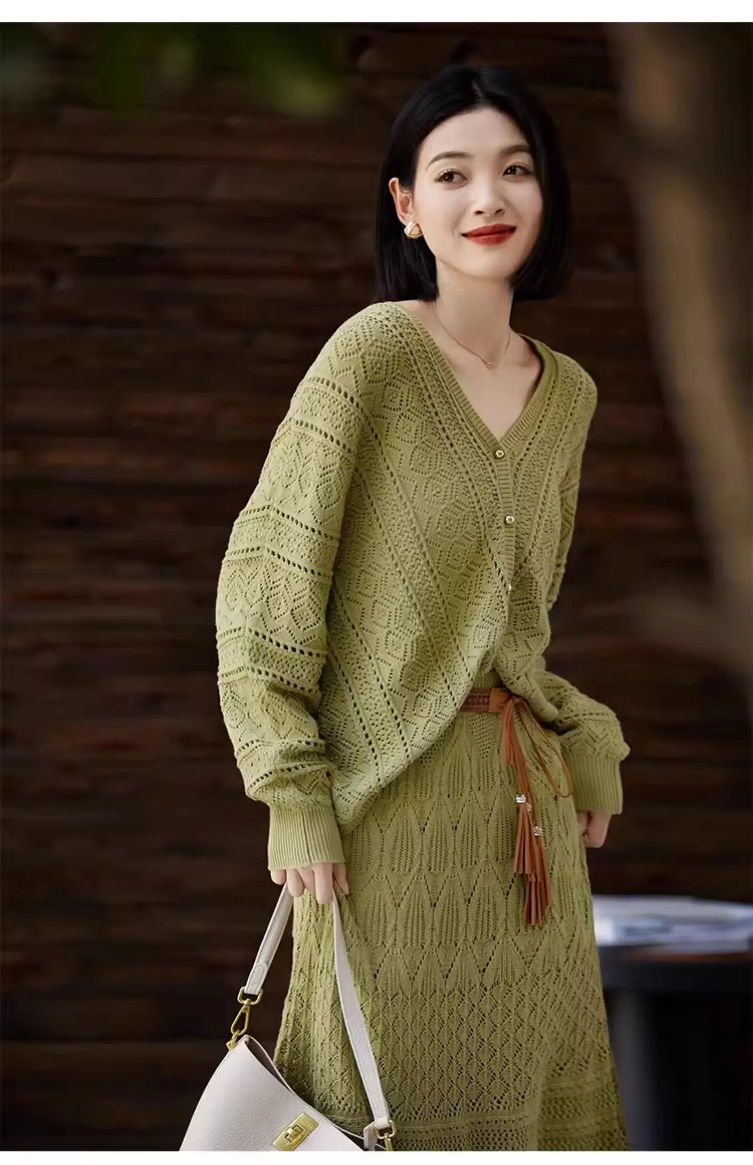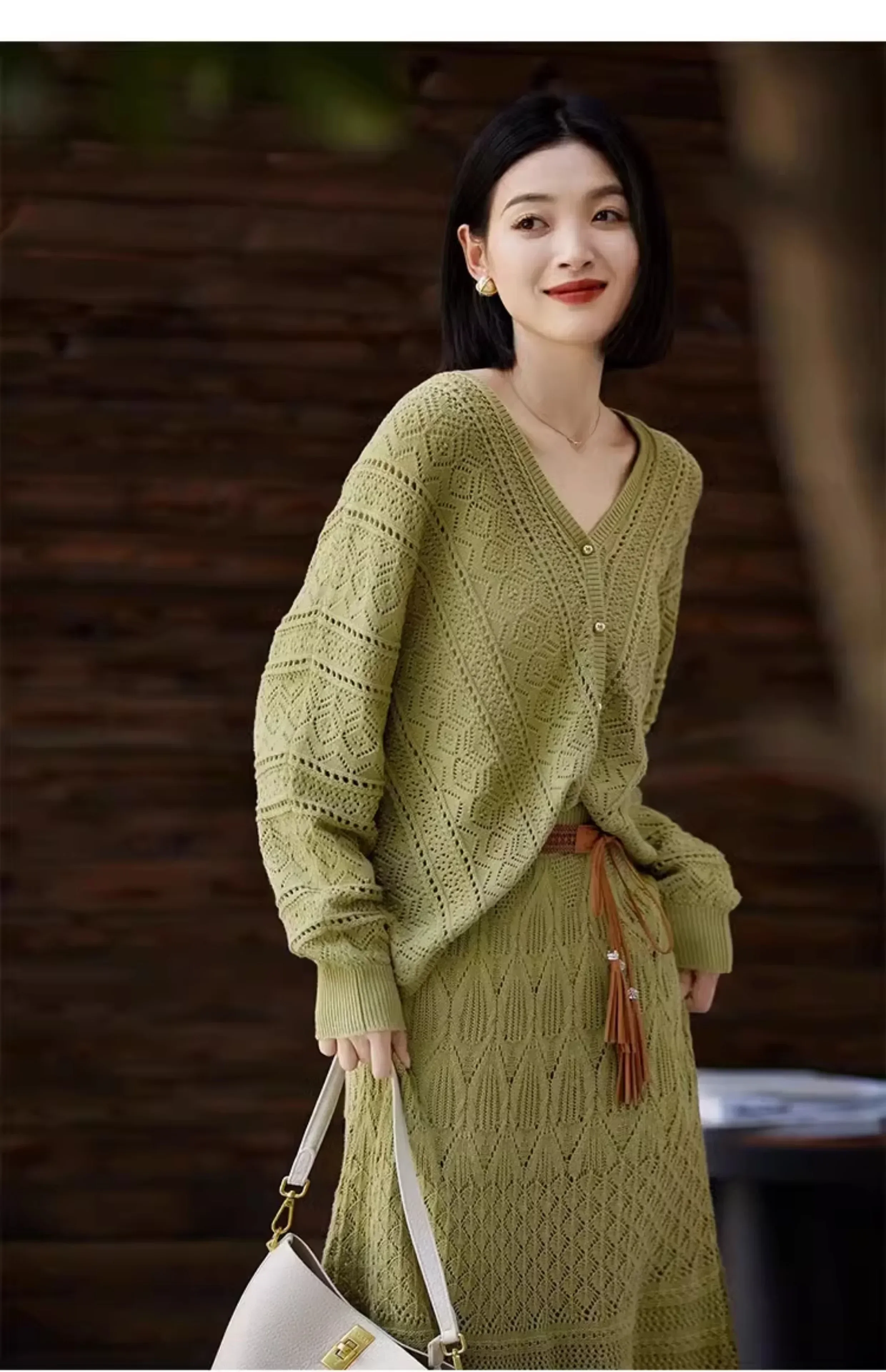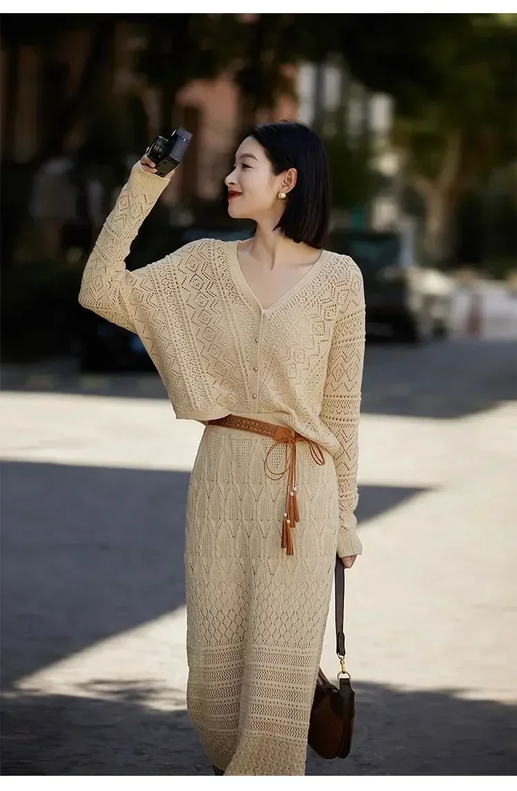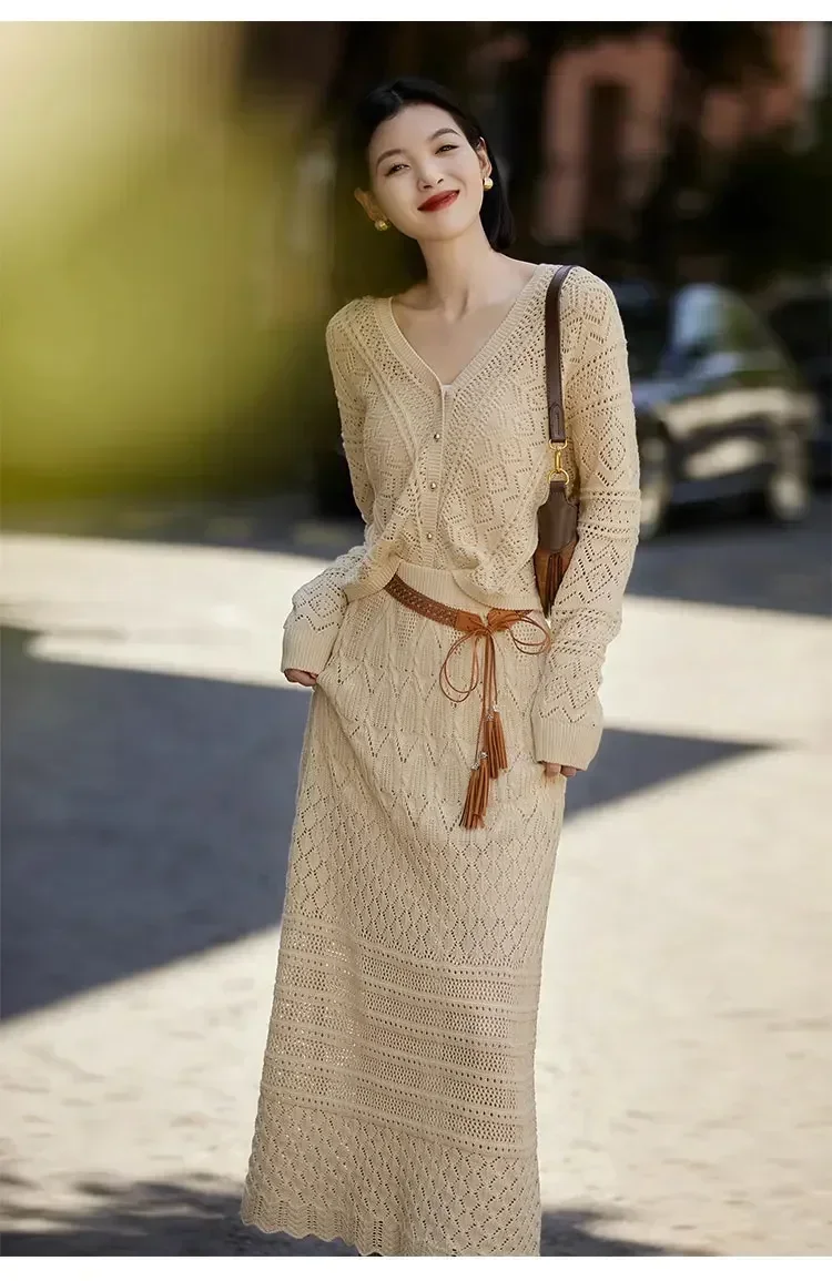Korean Fashion Slim High Waist Long Skirt Set Autumn Elegant Sets for Women 2 Pieces Loose V-neck Knitted Cardigan Two-piece Set
