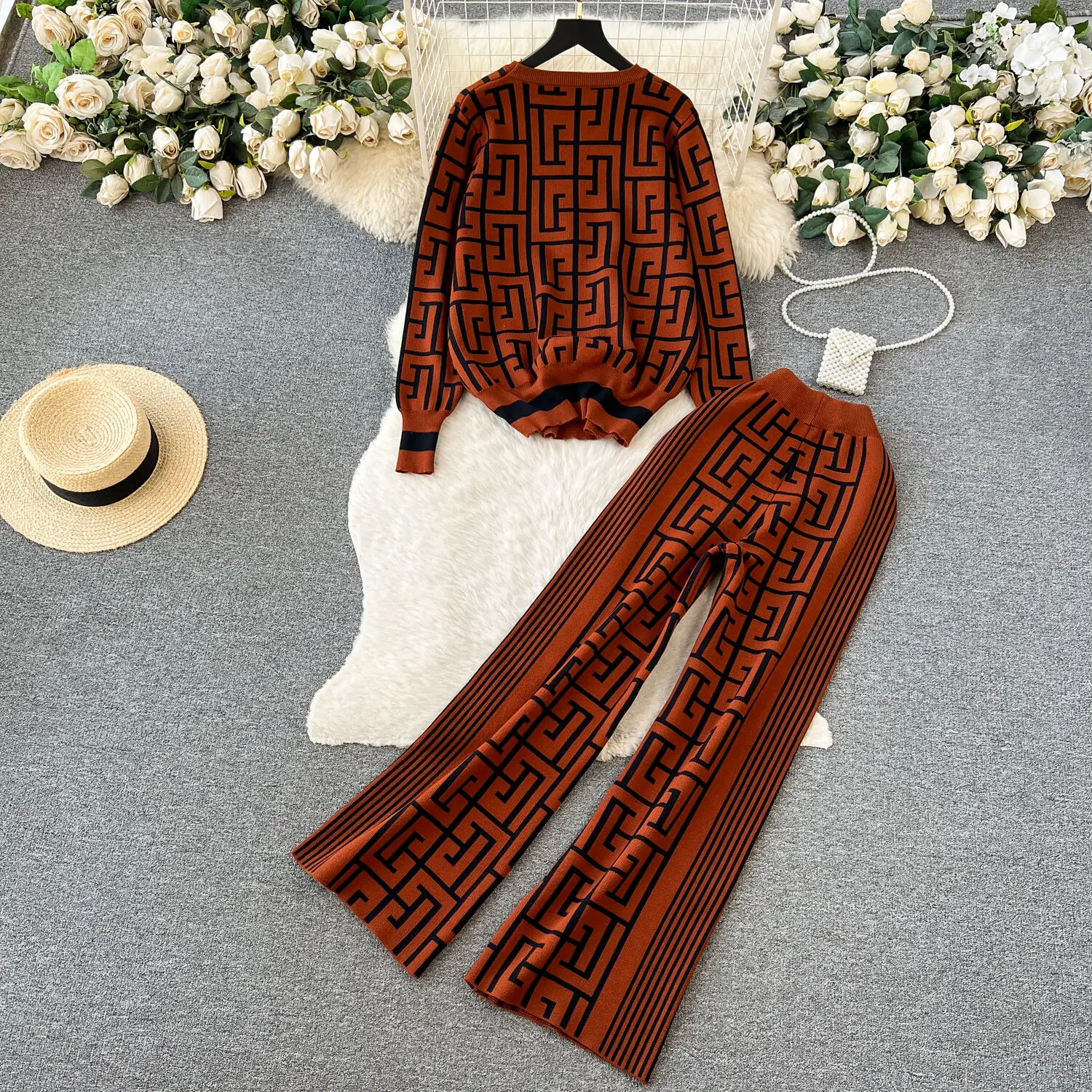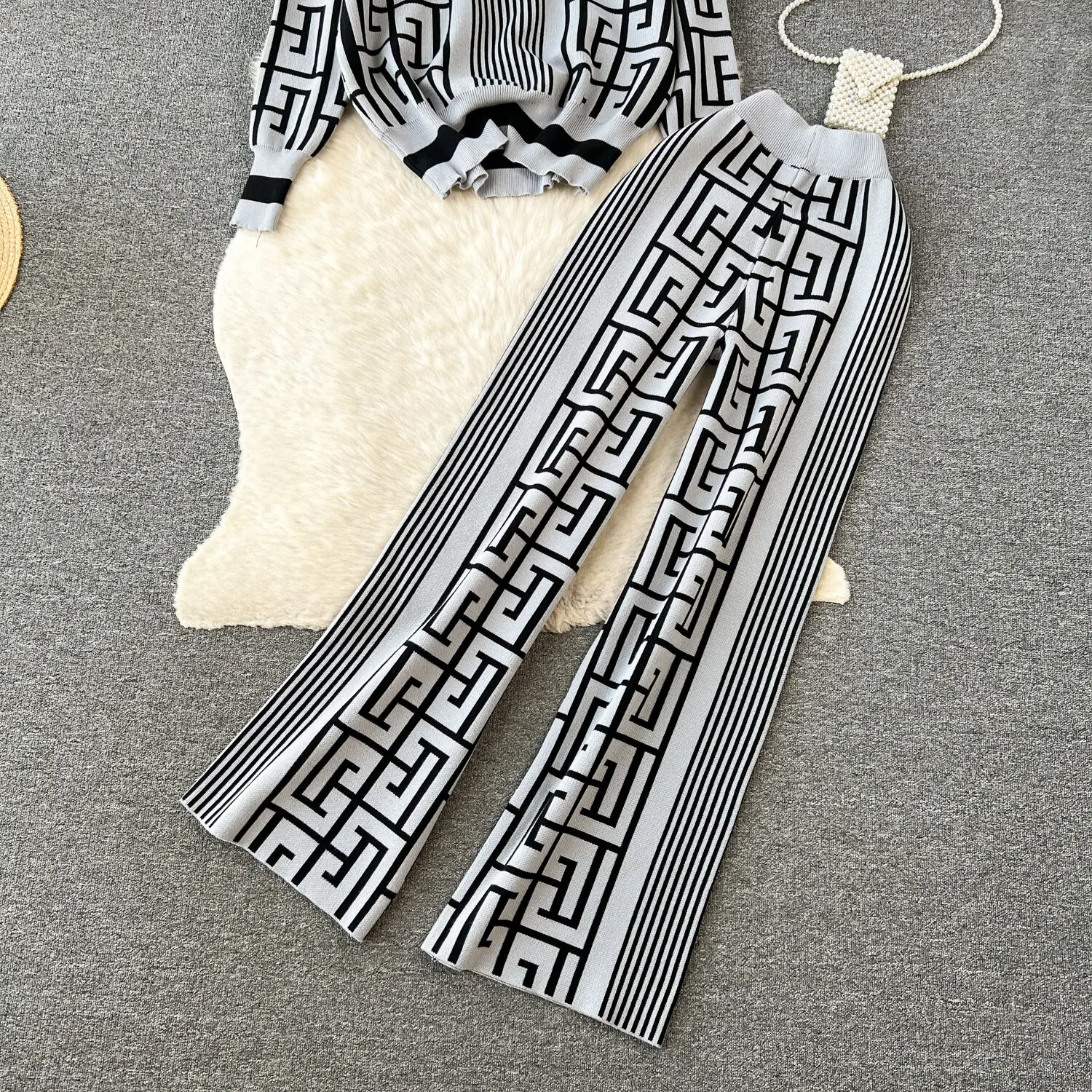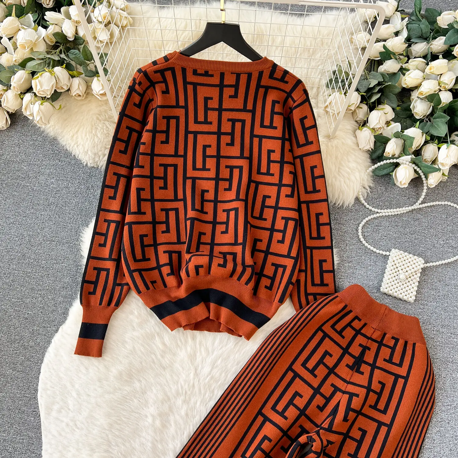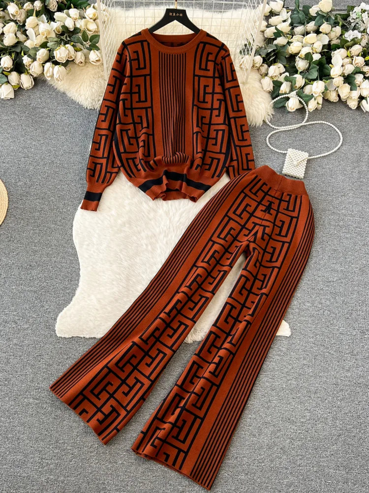 Introducing our newest arrival, the Fashion Knitted Two Pieces Suits! This set features a round neck labyrinth print loose sweater and wide leg long pants, perfect for a casual yet stylish look. Made with premium knitted fabric, this Korean style set is both comfortable and trendy. Say goodbye to the hassle of finding the perfect fit, as our one size option is designed to fit most body types. The elastic waistband and bust ensure a comfortable and flattering fit for all. So why wait? Elevate your wardrobe with this best-selling set and make a statement wherever you go. Limited time offer, don't miss out!
