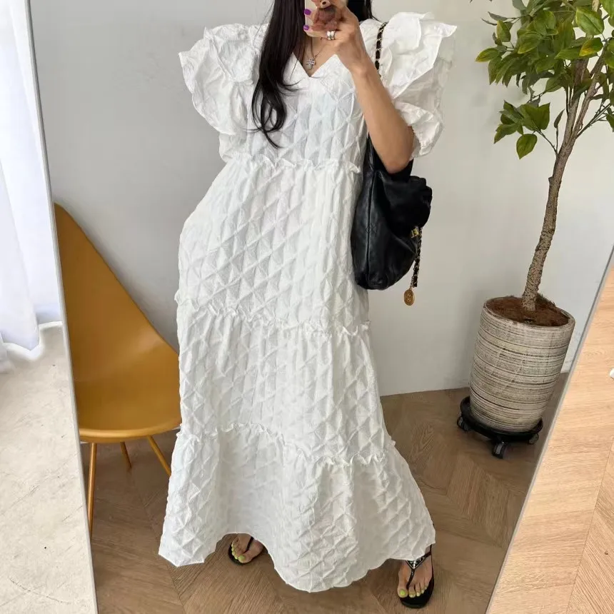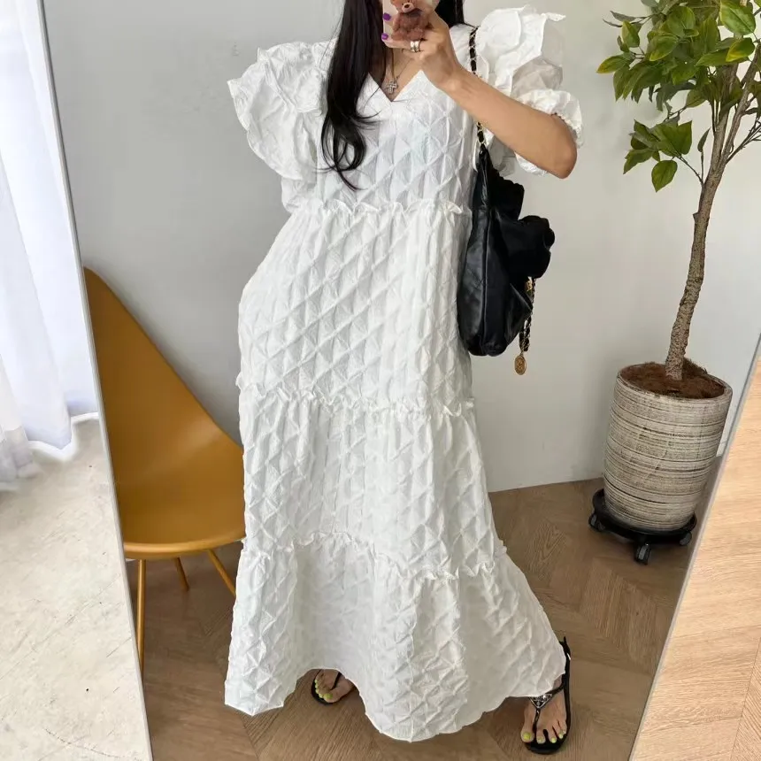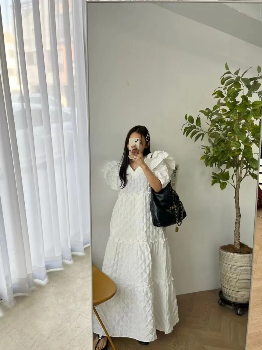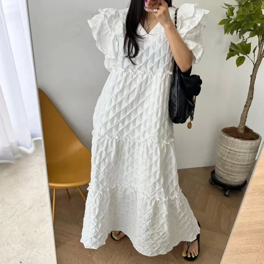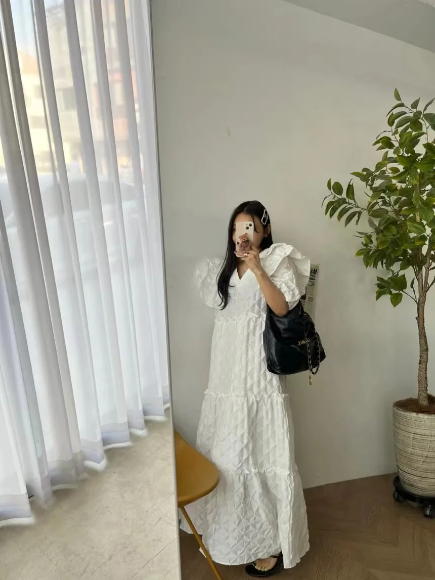 Elevate your summer style with our Korean Summer White V Neck Ruffles Midi Dress - a flawless blend of comfort and elegance that's perfect for every occasion.
