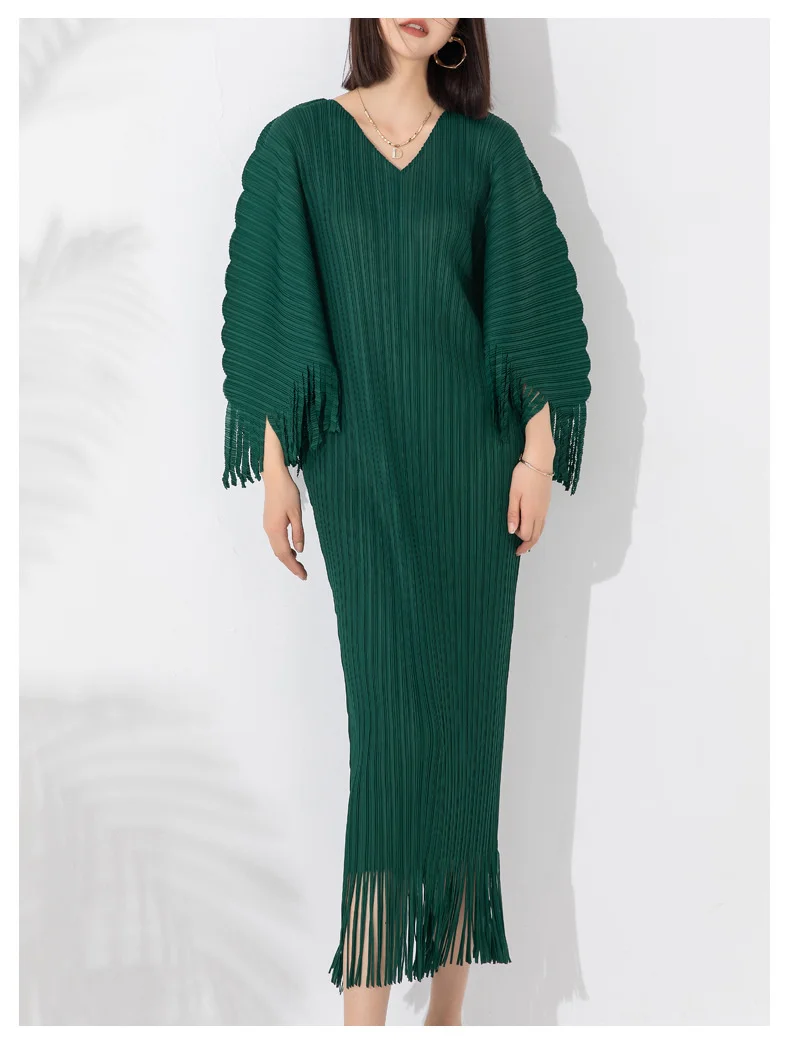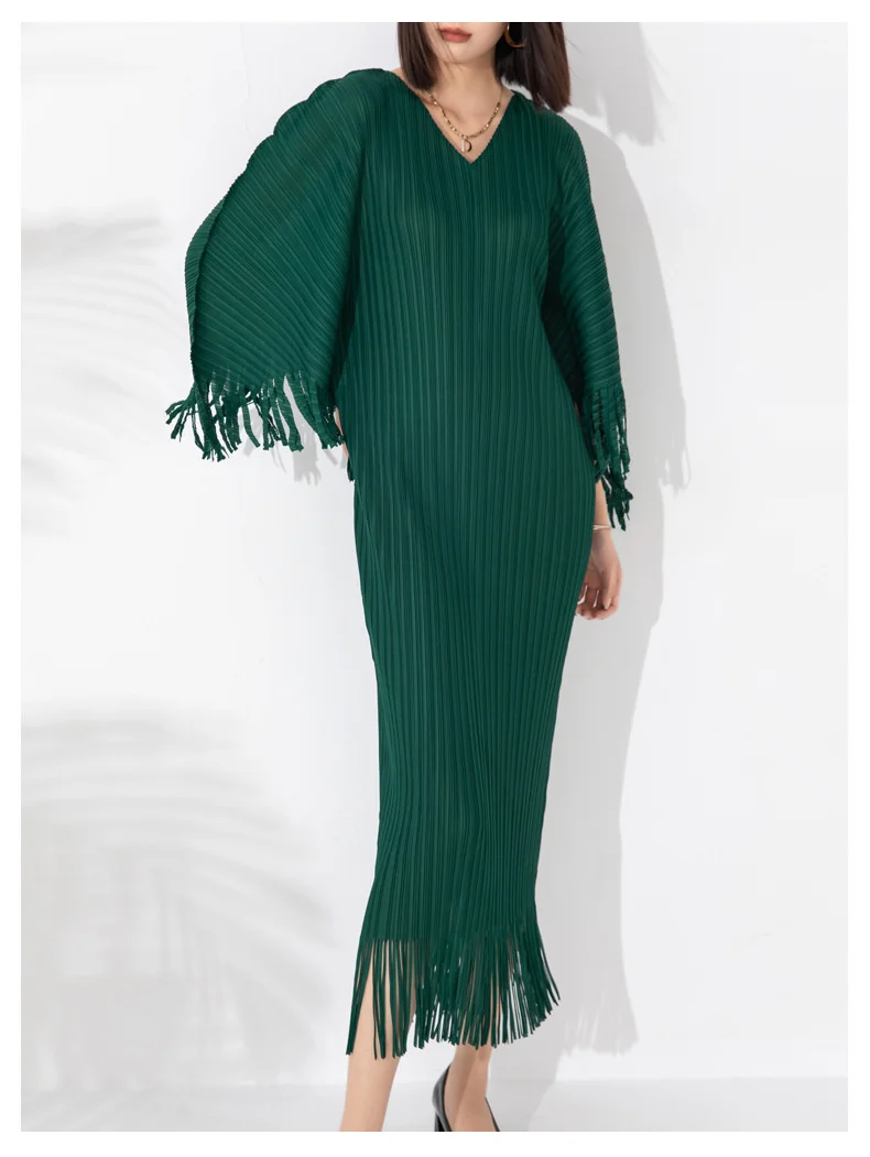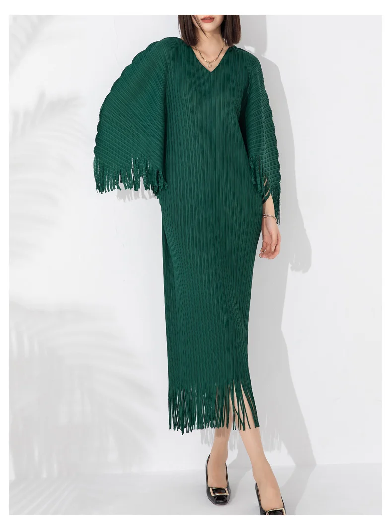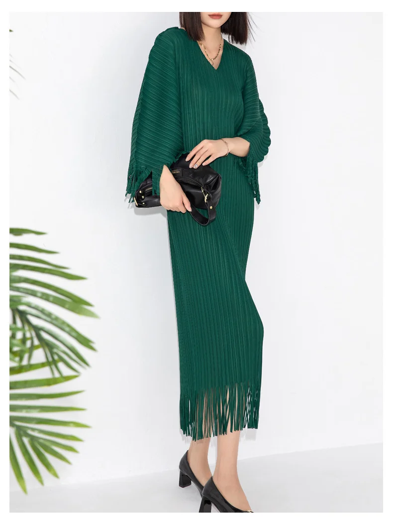 LANMREM Elegant Bat Sleeve Dress with Tassel Detail and V-neck - Festival Clothing for Women