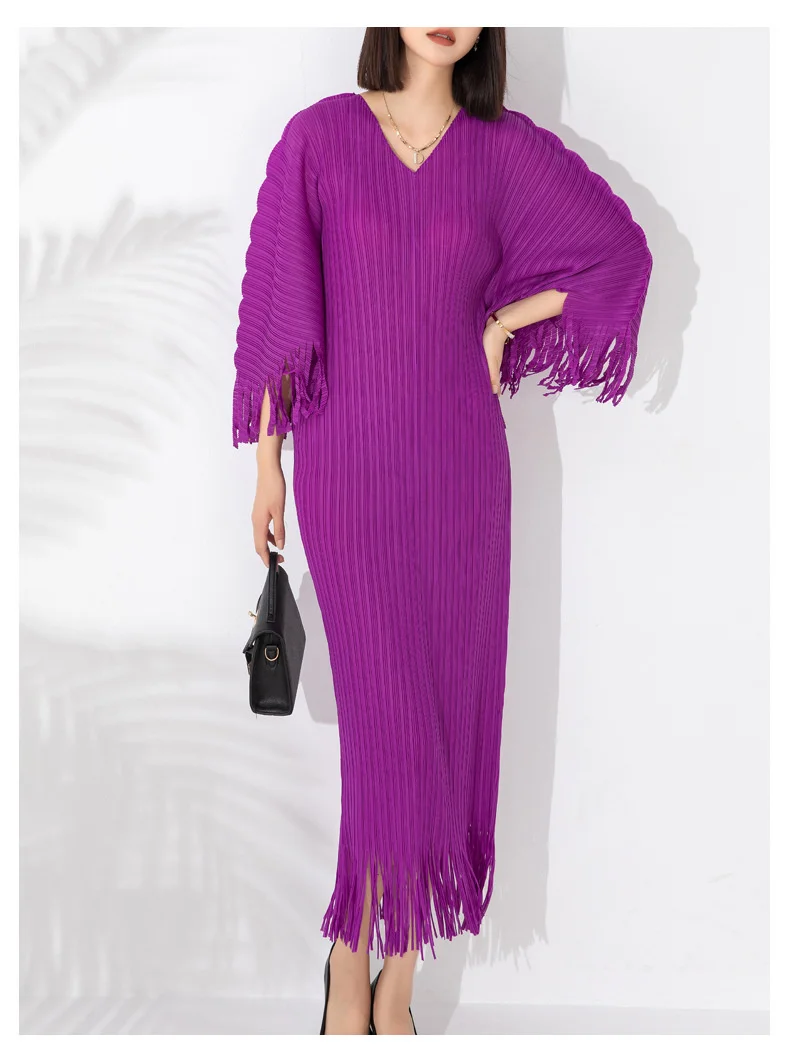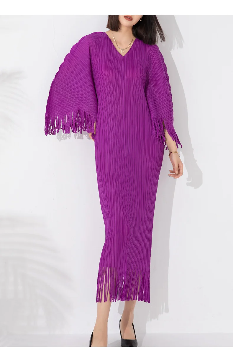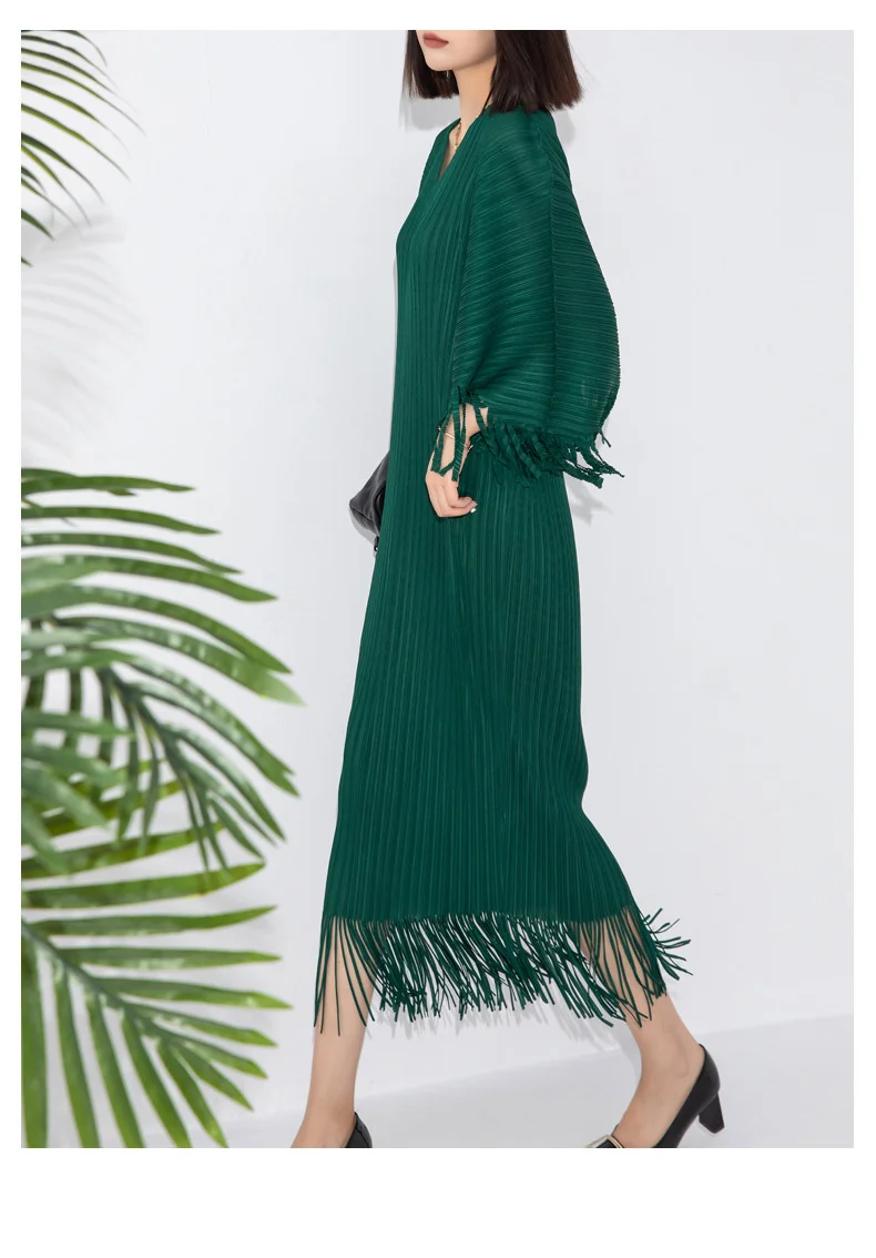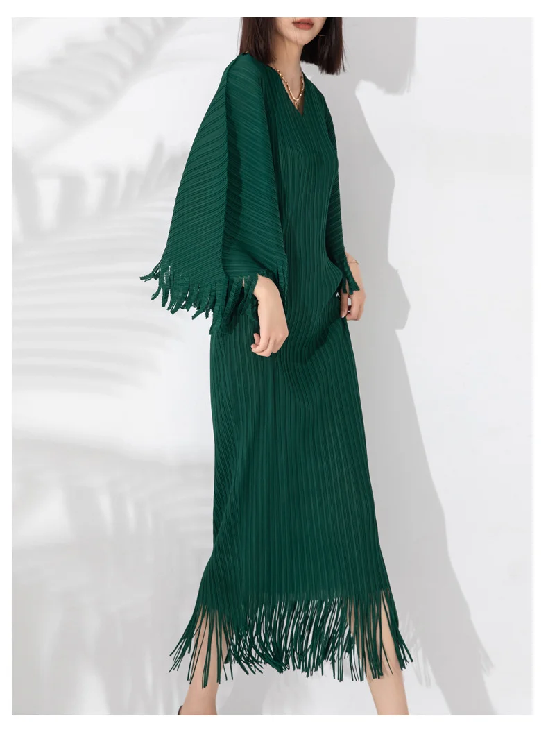 LANMREM Elegant Bat Sleeve Dress with Tassel Detail and V-neck - Festival Clothing for Women