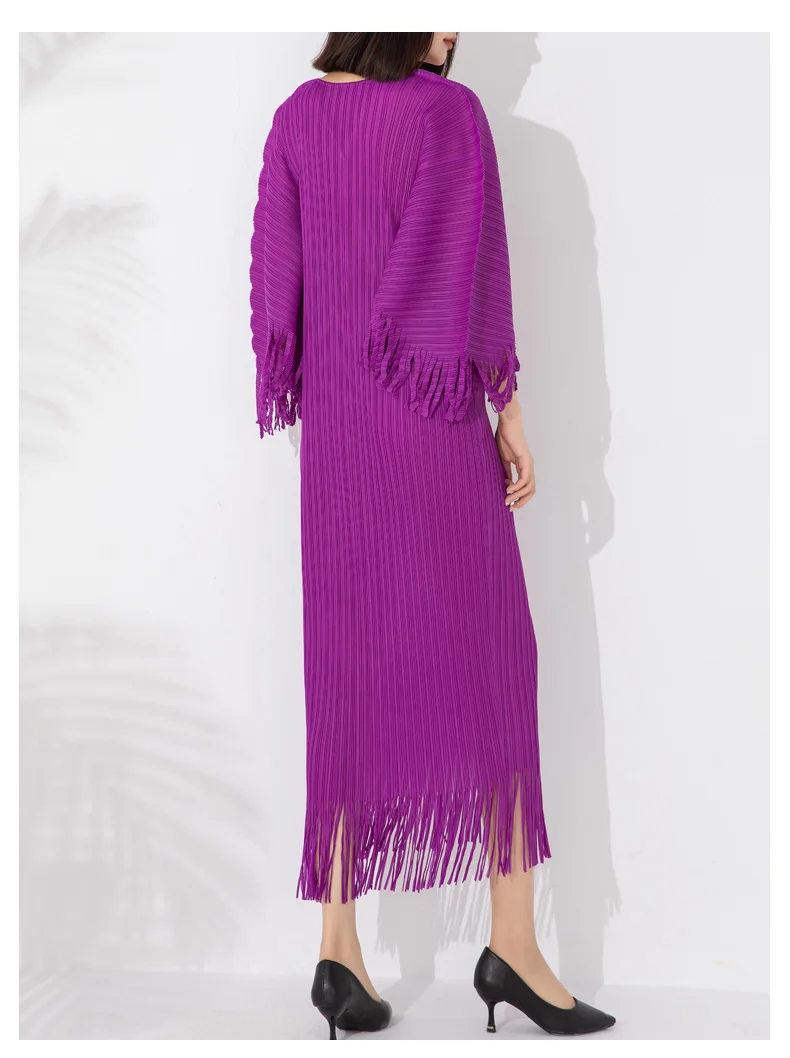 Introducing the LANMREM High End Pleated Tassel Dress, the perfect addition to your wardrobe. This elegant dress features a V-neckline, bat sleeves, and a long length for a flattering and sophisticated look. Made with high-quality materials, it offers a comfortable and stylish fit. Available in one size, with a length of 130 cm and 48 cm sleeves, this dress is perfect for any occasion. Plus, it comes with a convenient size conversion chart for your reference. Upgrade your festival clothing with this limited time offer and experience the premium quality and exclusive design of the LANMREM dress. Don't miss out on this best-selling item that solves the problem of finding the perfect dress for any event. Add it to your cart now and elevate your style game!