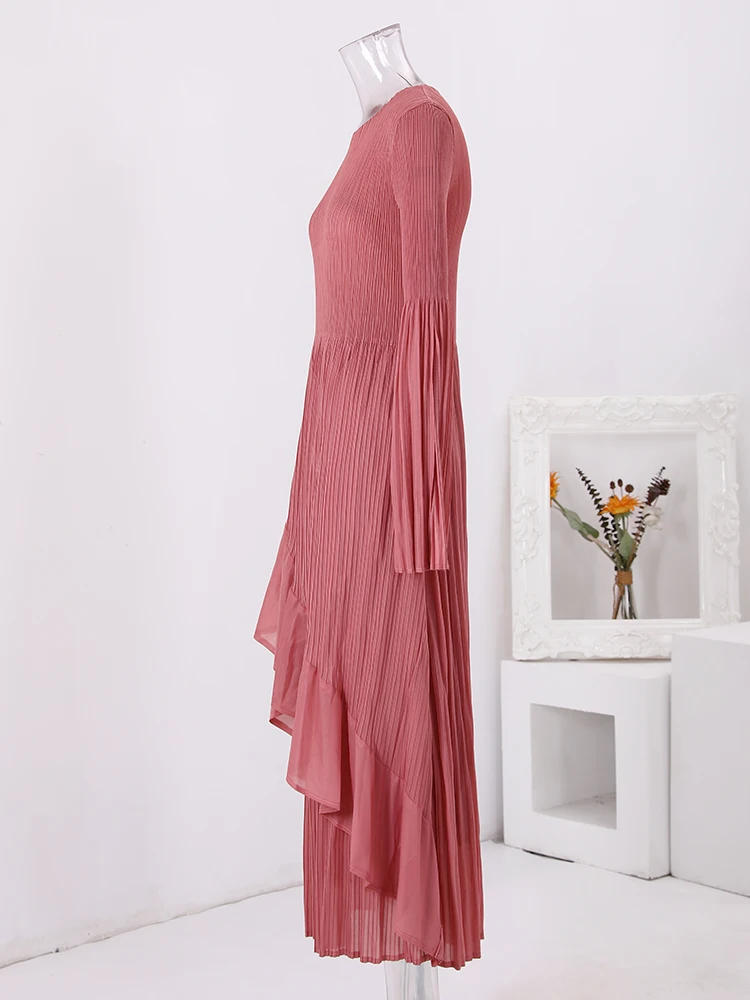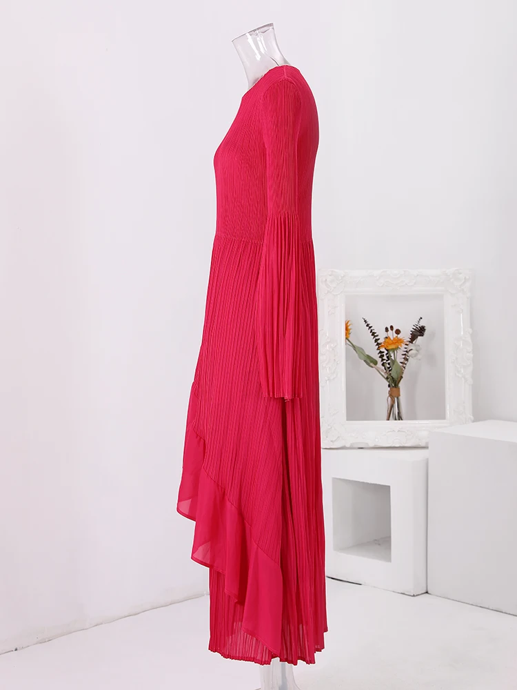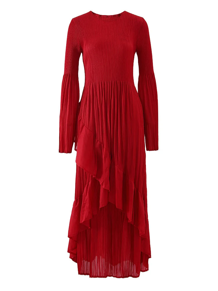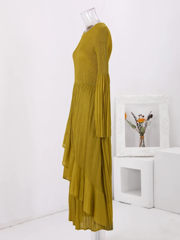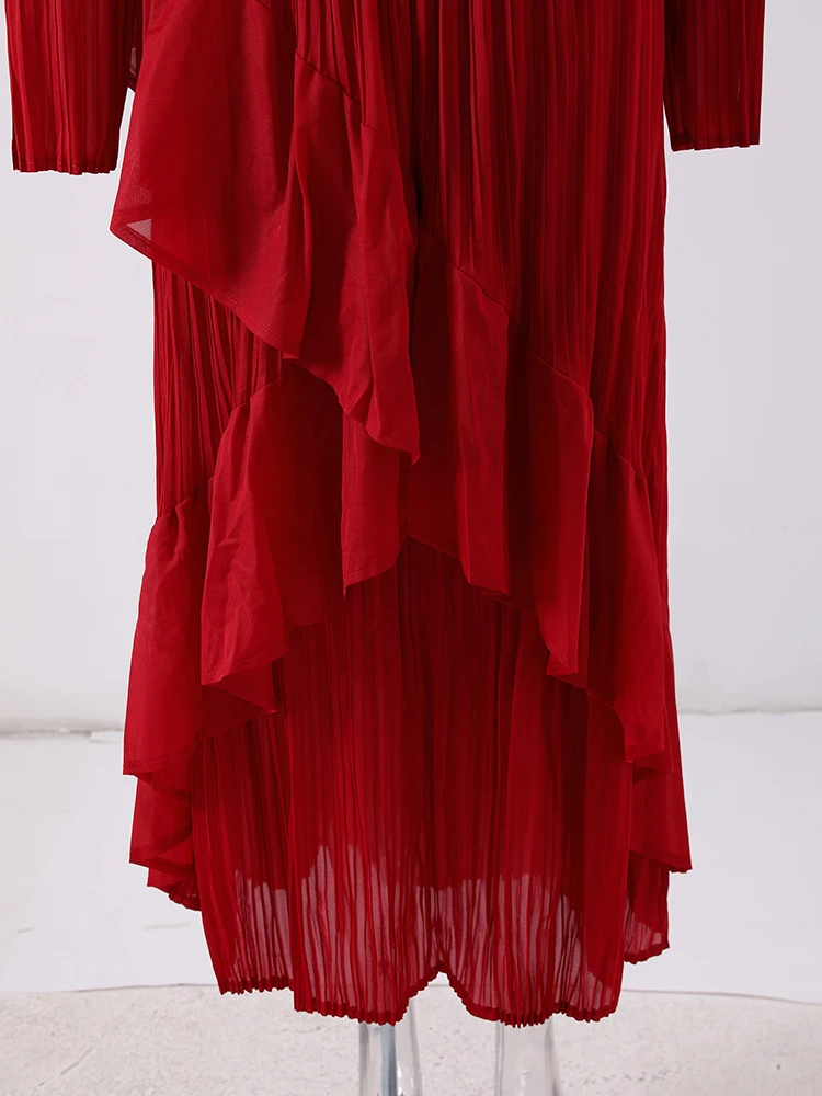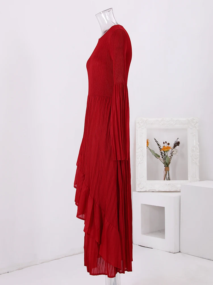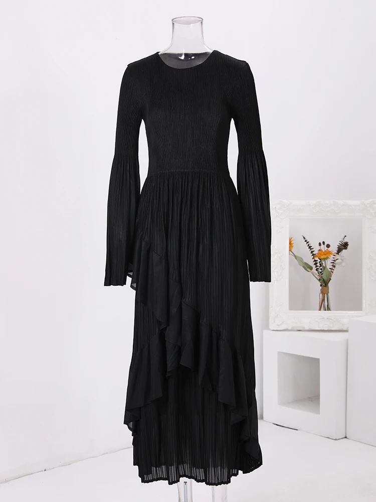 Get ready to turn heads in this elegant and stylish LANMREM pleated dress for women. 🌟 What it is - A stunning piece featuring irregular ruffles, long sleeves, split design, and a solid color - the epitome of fashion-forward style.