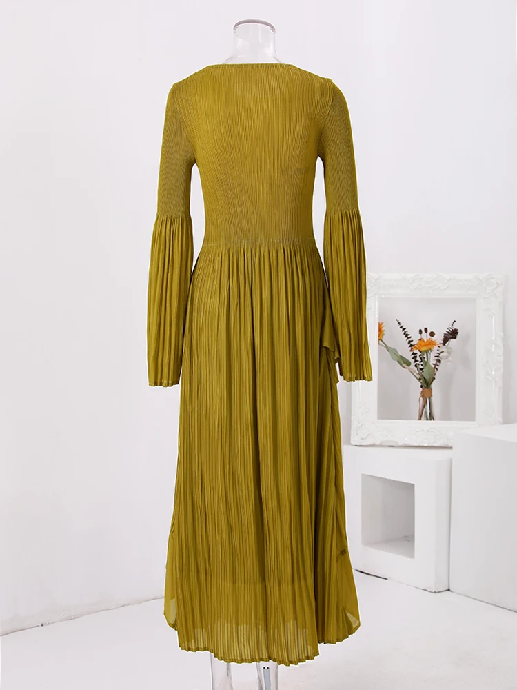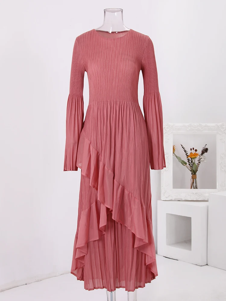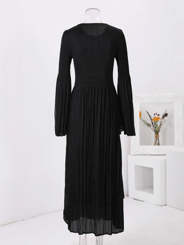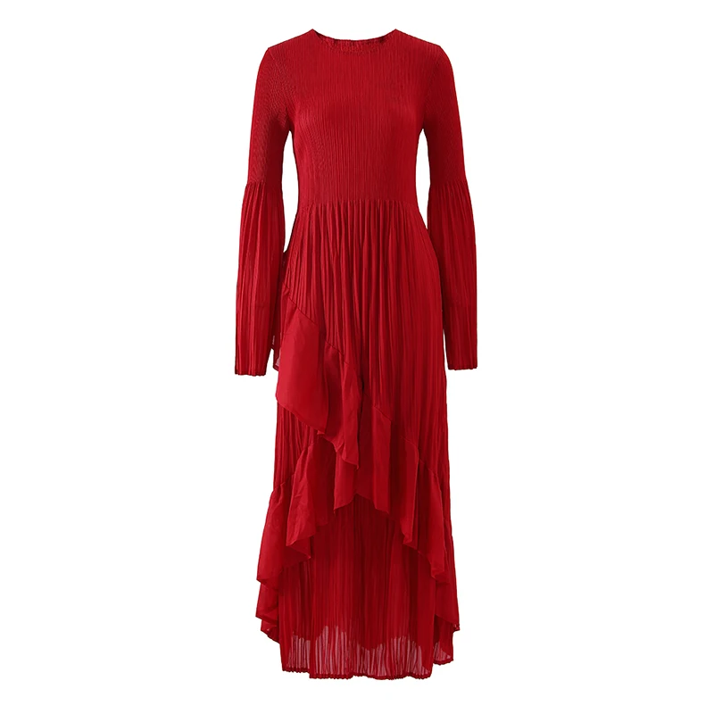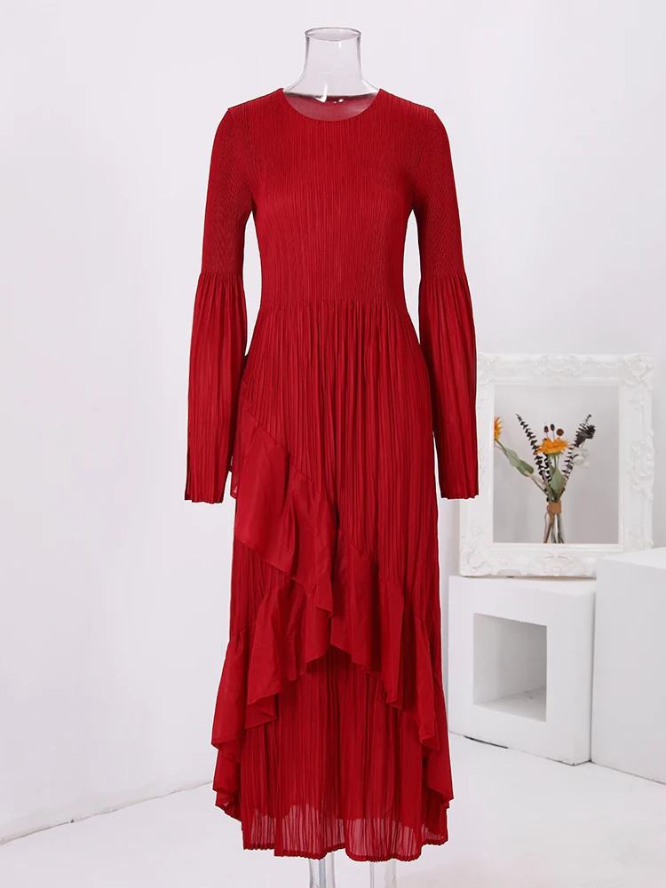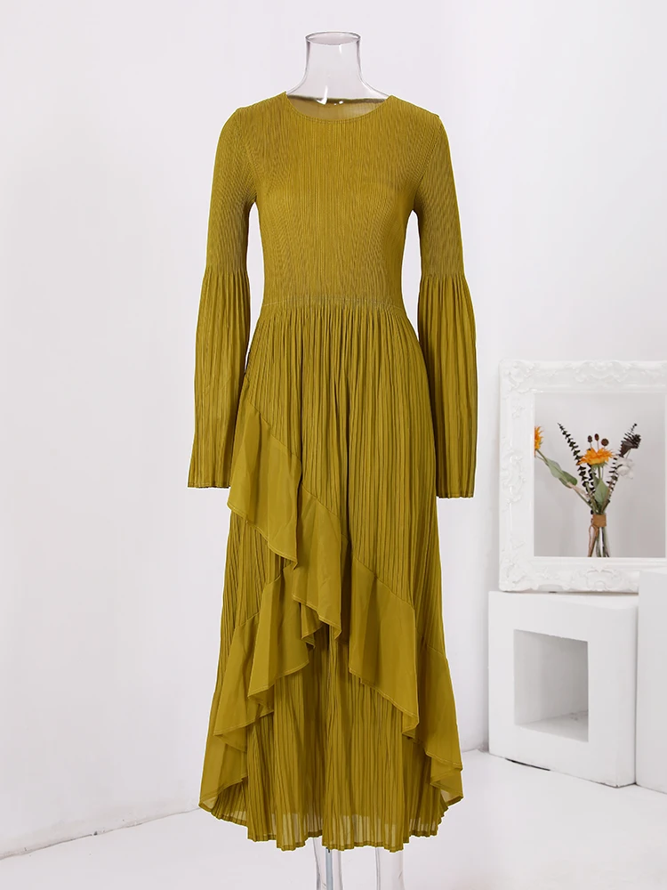 Get ready to turn heads in this elegant and stylish LANMREM pleated dress for women. 🌟 What it is - A stunning piece featuring irregular ruffles, long sleeves, split design, and a solid color - the epitome of fashion-forward style.