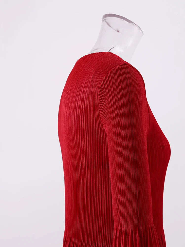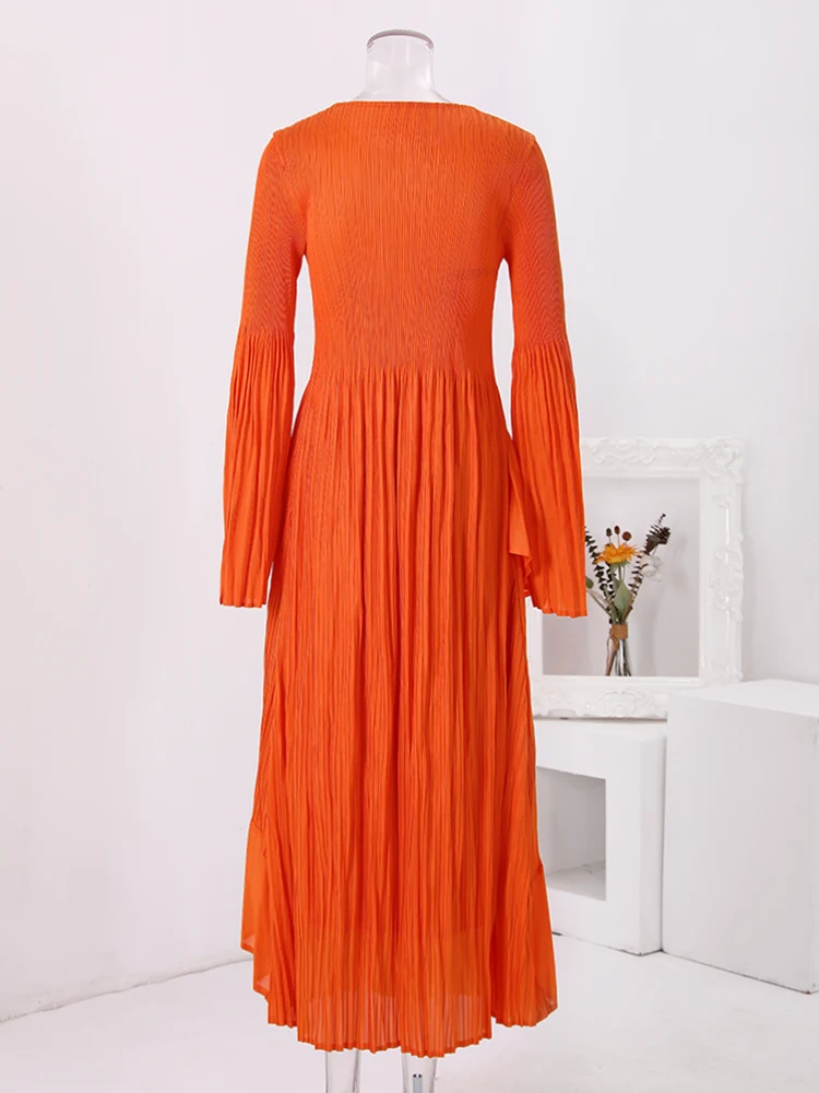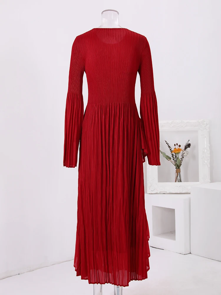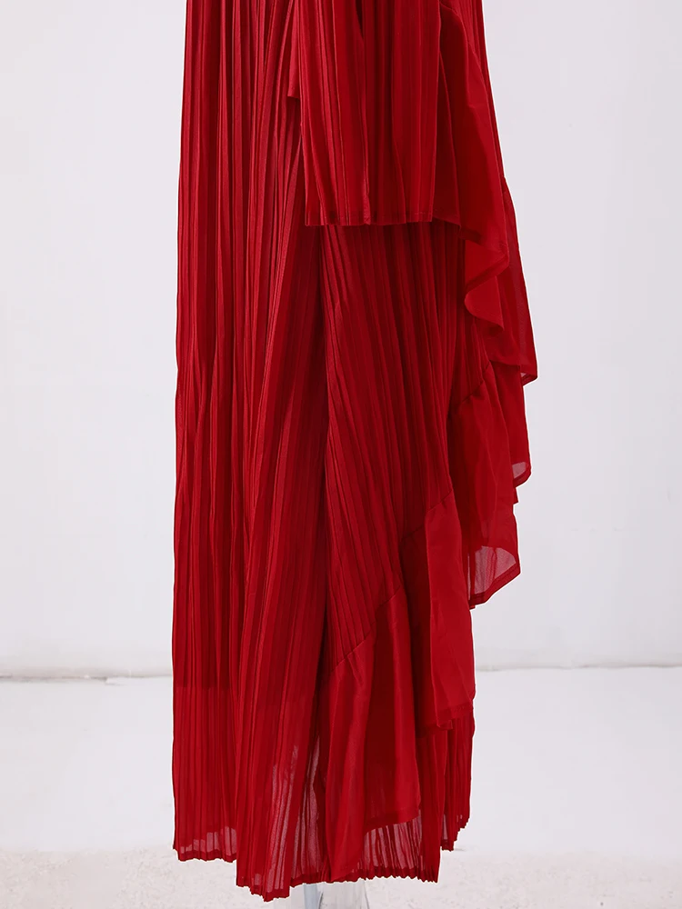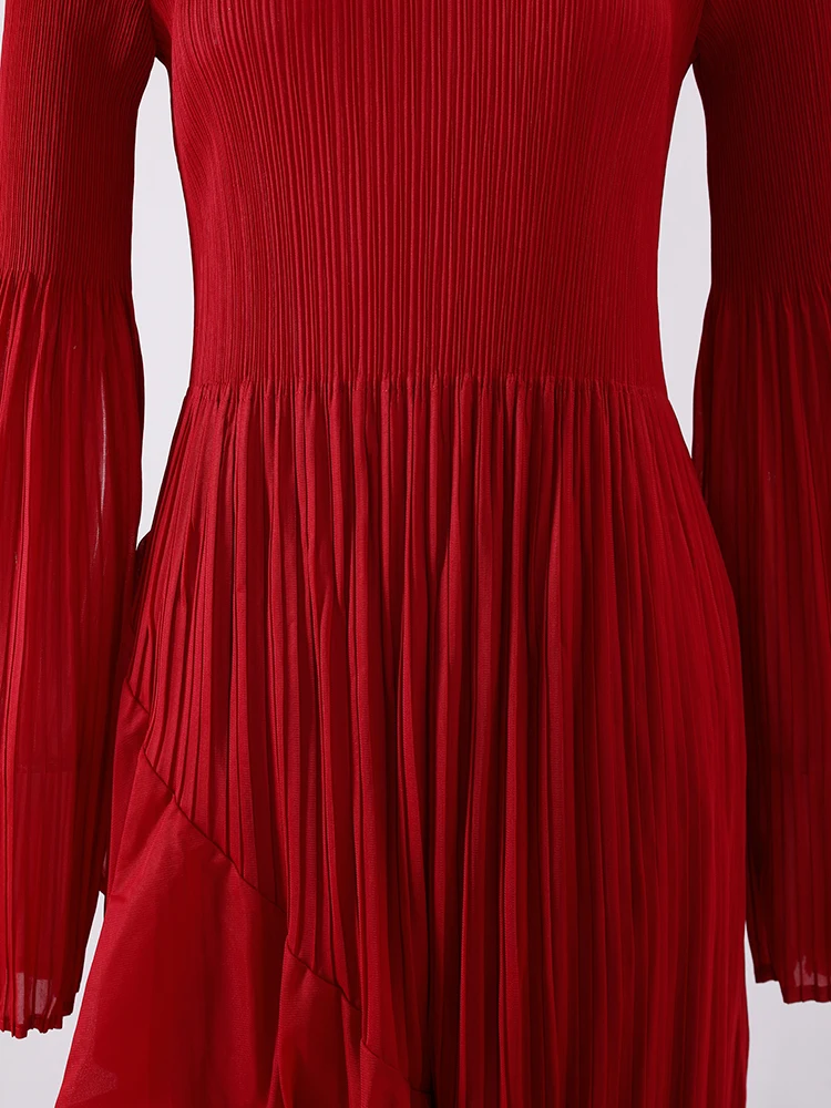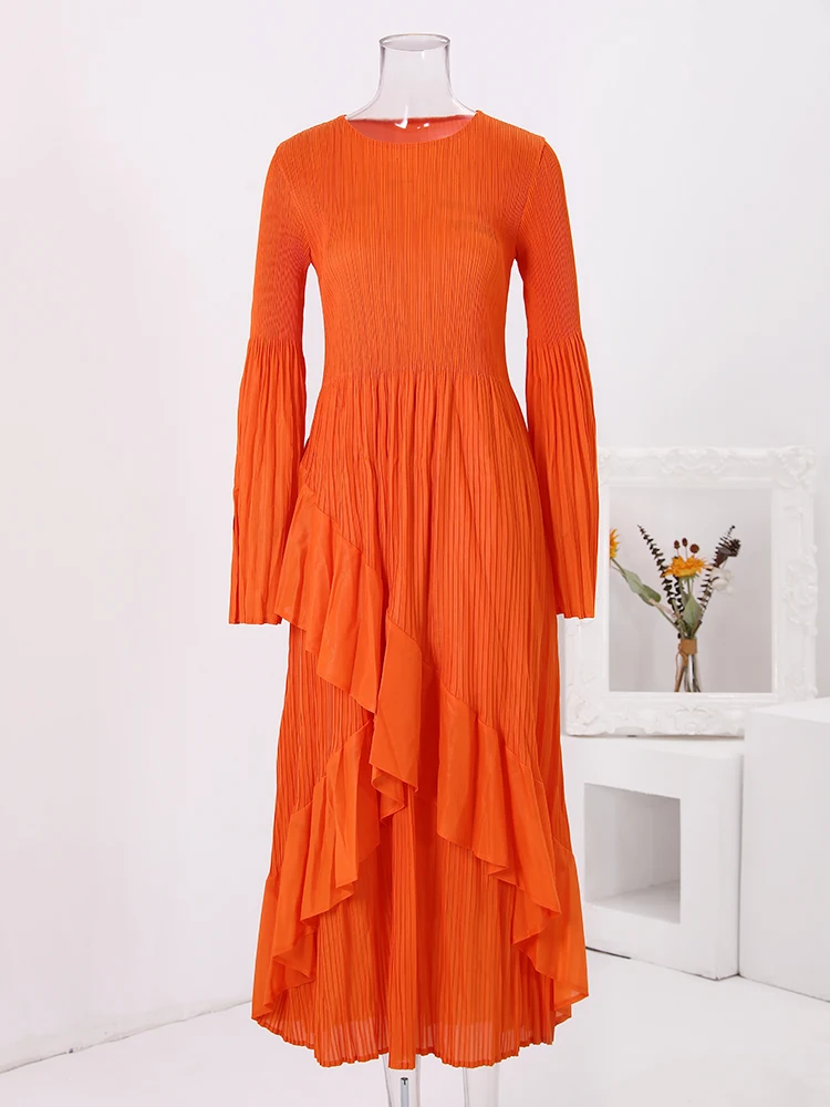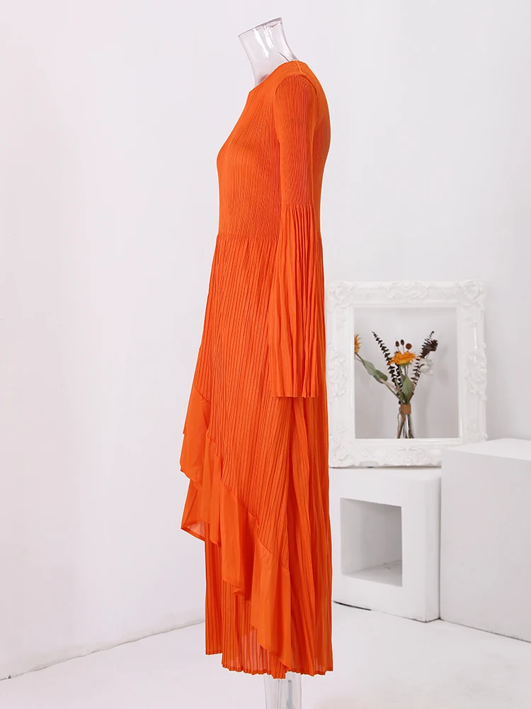 Get ready to turn heads in this elegant and stylish LANMREM pleated dress for women. 🌟 What it is - A stunning piece featuring irregular ruffles, long sleeves, split design, and a solid color - the epitome of fashion-forward style.
