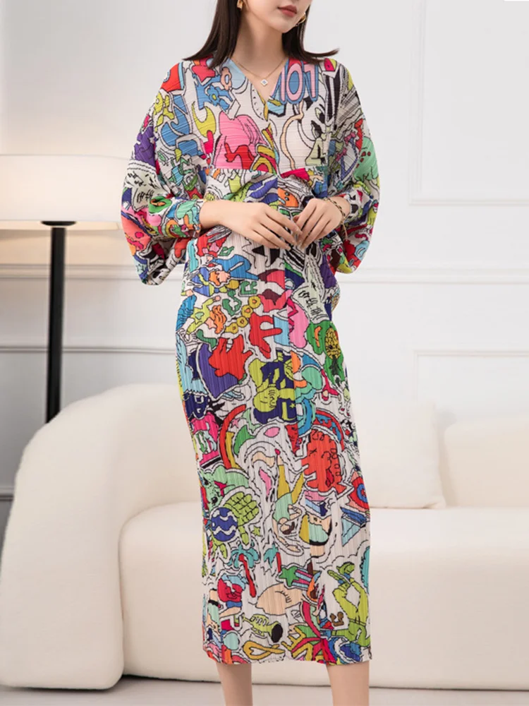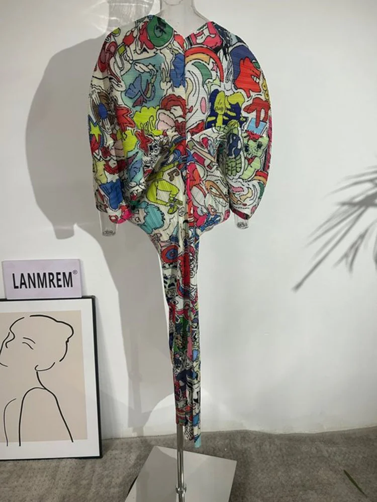 Introducing our LANMREM Pleated Graffiti Print Batwing Dress for Women! This stunning dress features a unique and eye-catching graffiti print, perfect for festival season or any fashion-forward event. The loose, batwing style provides a comfortable and relaxed fit, while the V-neck adds a touch of femininity. Made with high-quality materials, this dress is one size and fits most (unit:cm) with a length of 130cm, sleeve length of 42cm, and shoulder width of 40cm. Plus, with its versatile design, it can be dressed up or down for any occasion. Don't miss out on this limited time offer and add this must-have dress to your wardrobe today!