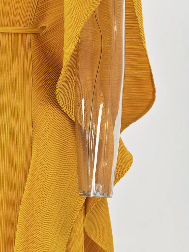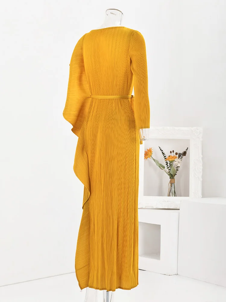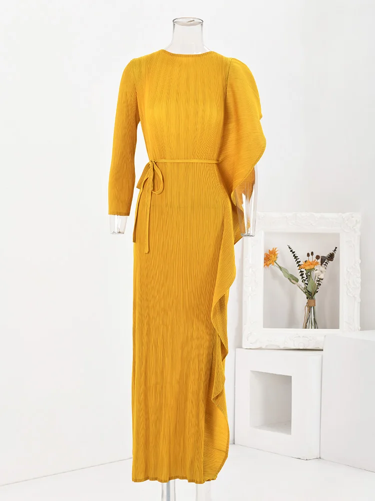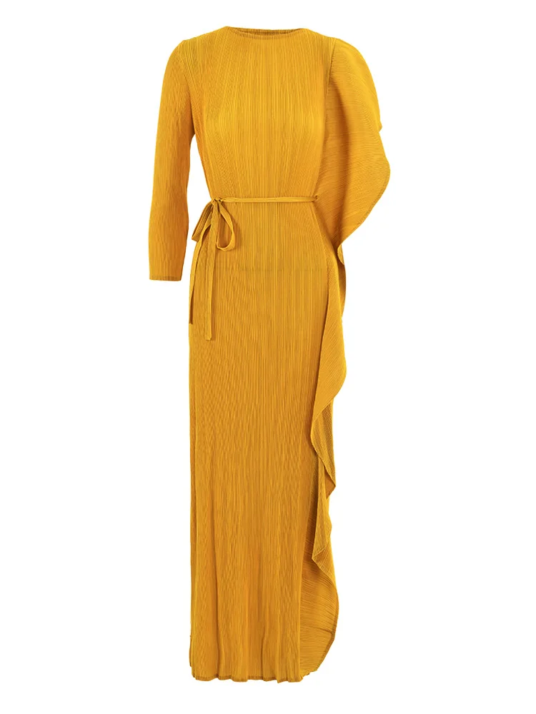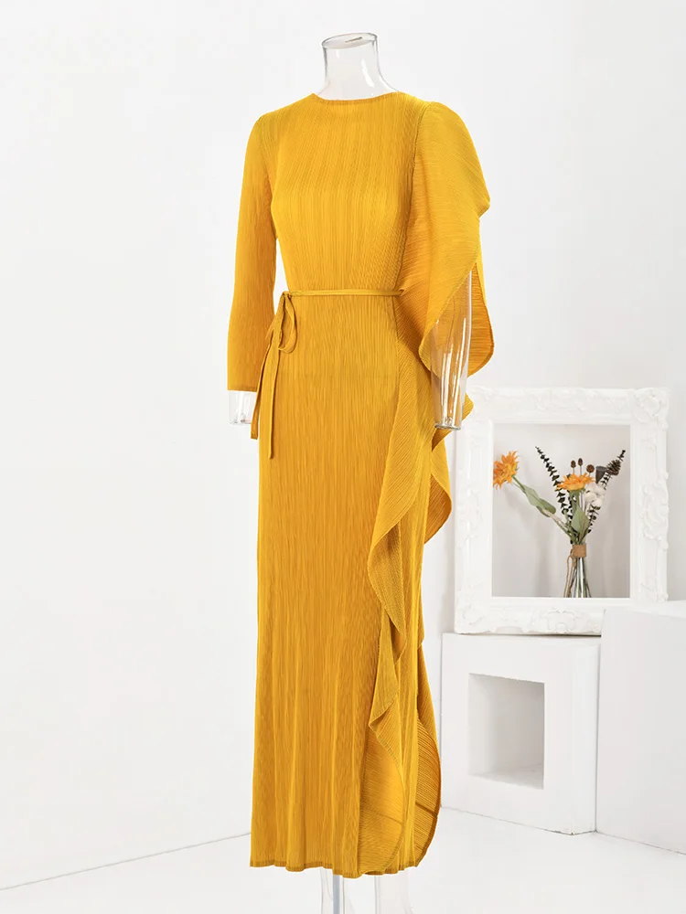 Introducing the LANMREM Fashion Irregular Ruffles Design Pleated Dress, the perfect dress for any occasion. Made with high-quality materials, this dress features an eye-catching ruffle design and a gathered waist with a belt for a flattering silhouette. Available in a solid color, it is versatile and suitable for any style. The long length adds elegance and sophistication to your look. Plus, the one-size-fits-all design makes it a perfect fit for all body types. Upgrade your wardrobe with this premium and limited-time dress, and be the center of attention at your next party. Don't miss out on this best-selling dress of 2024.