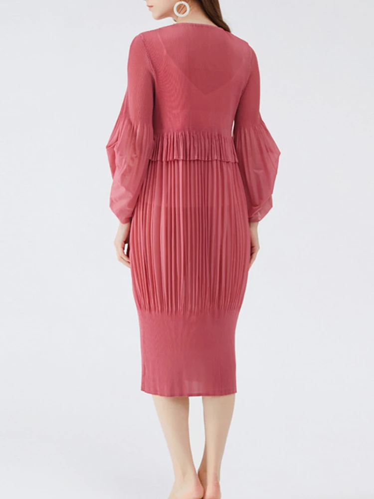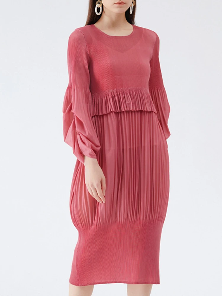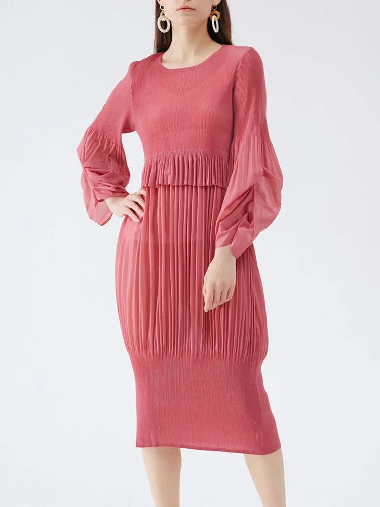 🎉 What it is - Elevate your fashion game with this stunning ruffles pleated dress featuring lantern sleeves and a chic round neck. The mid-length design adds a touch of elegance to your wardrobe.
