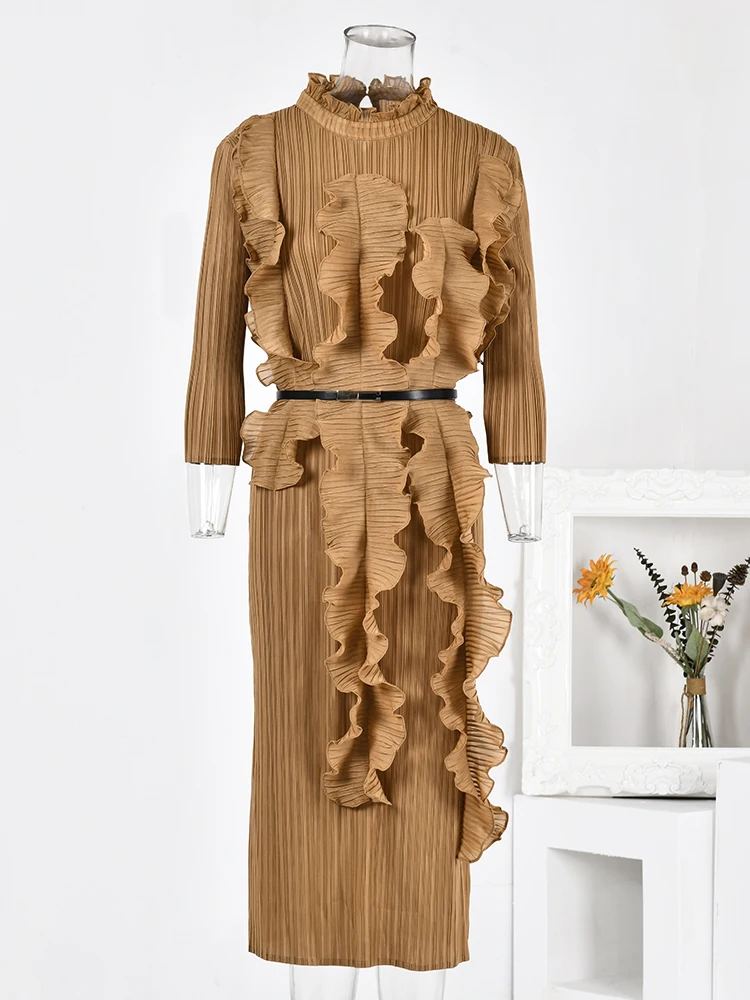 Introducing our best-selling LANMREM Ruffles Spliced Pleated Dress, a must-have addition to your wardrobe for the upcoming 2024 Spring season. This fashion-forward dress features a gathered waist and a trendy belt, perfect for any party or special occasion. Made with premium materials, this dress guarantees a perfect fit for all body types. The unique ruffled and pleated design adds a touch of elegance and sophistication to your look. Don't miss out on this exclusive limited-time offer and elevate your fashion game with our LANMREM dress. Available in one size, with a length of 120 cm, this dress is the perfect choice for on-the-go fashionistas. Say goodbye to all your fashion woes and hello to effortless style with our LANMREM Ruffles Spliced Pleated Dress. Order now and experience the ultimate fashion statement!