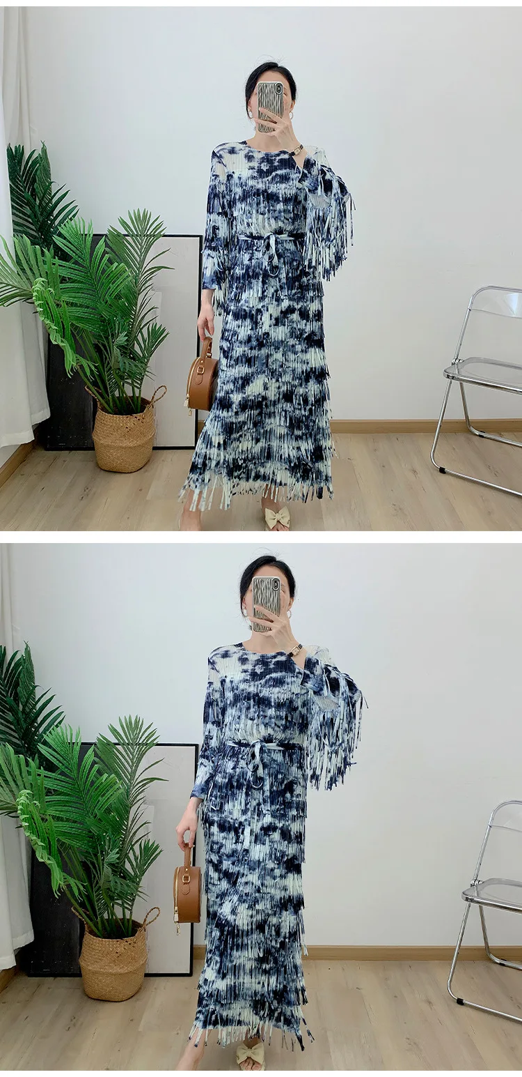 Introducing our latest addition to the 2023 Autumn New Clothing collection - the LANMREM Fashion Tassel Pleated Belt Dress. This dress is designed with a round neck, long sleeves, and contrast color details, making it a perfect blend of style and comfort. The tassel pleated belt adds a touch of sophistication to the overall look. Made with high-quality materials, this dress is a must-have for any fashion-forward woman. It comes in one size with a length of 135cm and a bust range of 90-120cm. Our dress is perfect for any occasion, whether it's a casual day out or a special event. Don't miss out on this limited time offer and grab yours today!