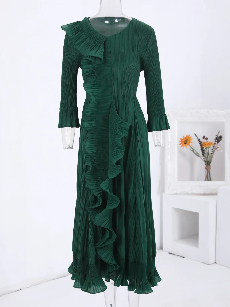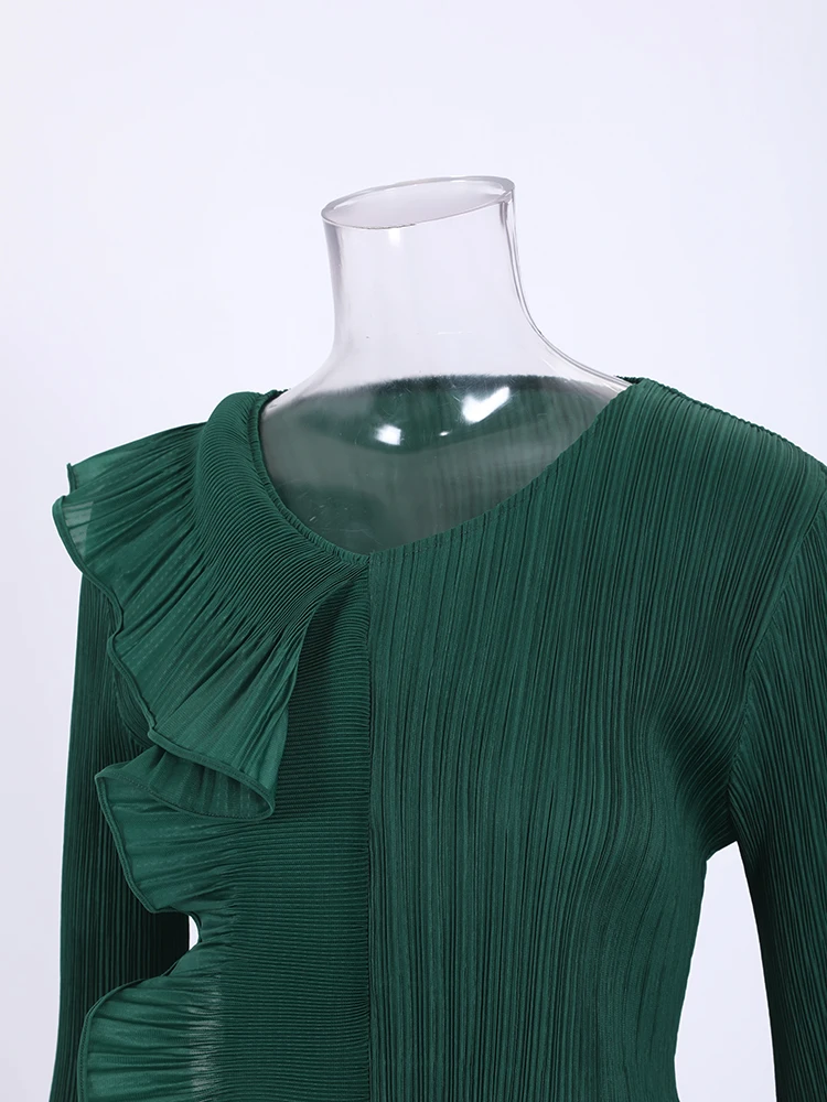 Introducing the LANMREM Asymmetric Ruffles Spliced Pleated Dress - the perfect addition to your wardrobe for any elegant occasion. Made with high-quality materials, this dress features a V-neckline, flare sleeves, and a unique asymmetric ruffle design. Its one size fits all (unit:cm) makes it a versatile option for all body types. With a length of 125cm and a bust of 80cm, this dress offers a flattering fit. The beautiful pleated details add a touch of sophistication, making it a must-have for any fashion-forward woman. Don't miss out on this limited time offer and upgrade your style with this premium dress today!