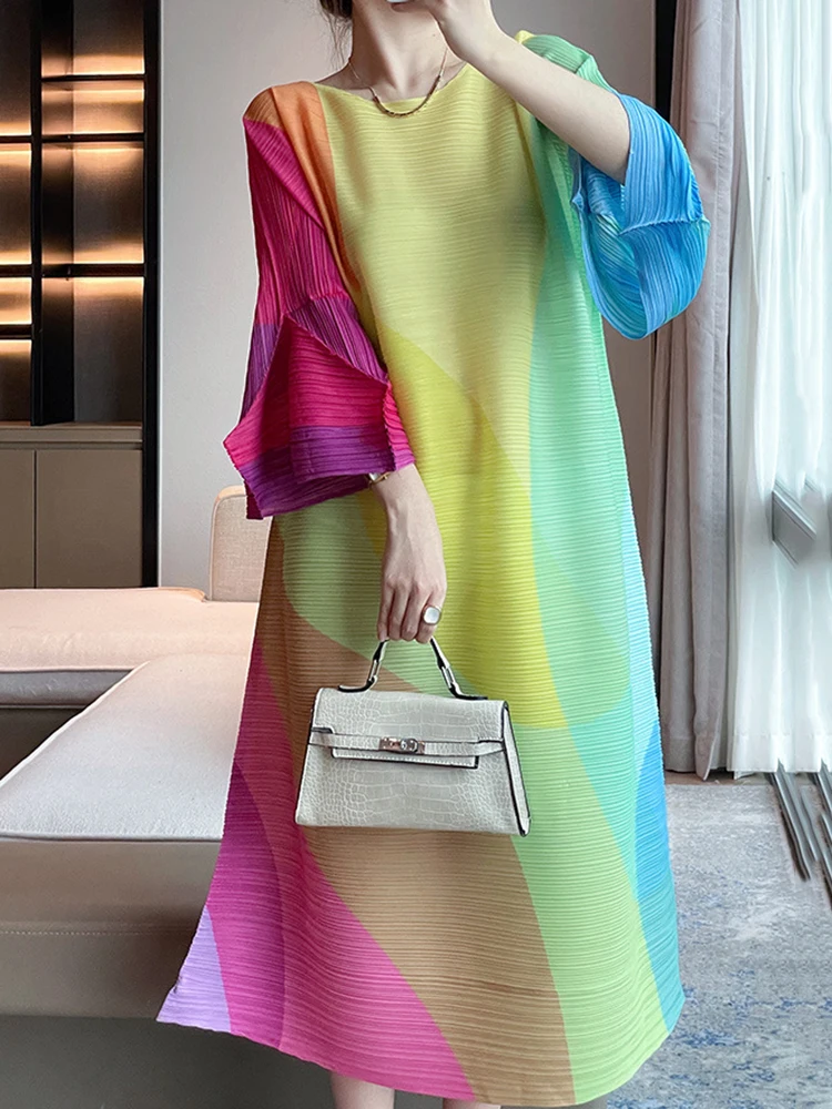 Introducing our must-have LANMREM Colorful Print Pleated Dress from our 2023 Autumn collection. This dress offers a vibrant and trendy look with its colorful print and flare sleeves. Its loose A-line silhouette provides a comfortable fit for all body types. Made with high-quality materials, this dress is perfect for any occasion and is sure to be a best seller. Upgrade your fashion game with our exclusive limited time offer and stand out from the crowd. Don't miss out on this premium dress that solves all your style problems. Get ready to gain compliments and confidence with our LANMREM dress.