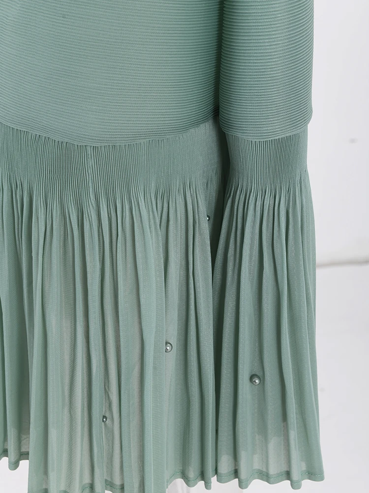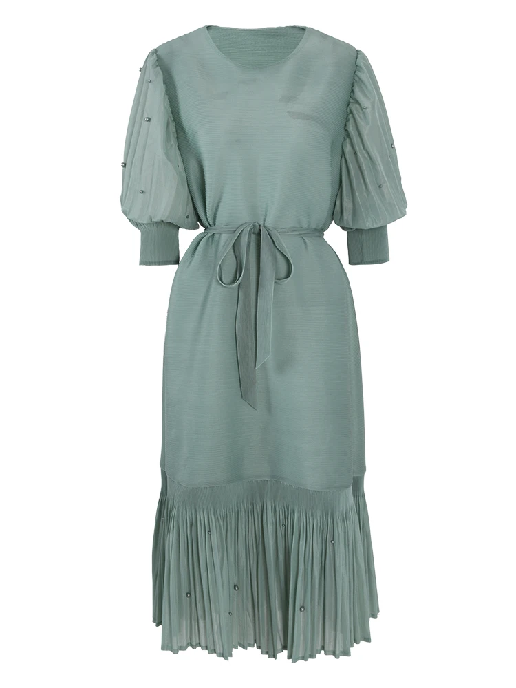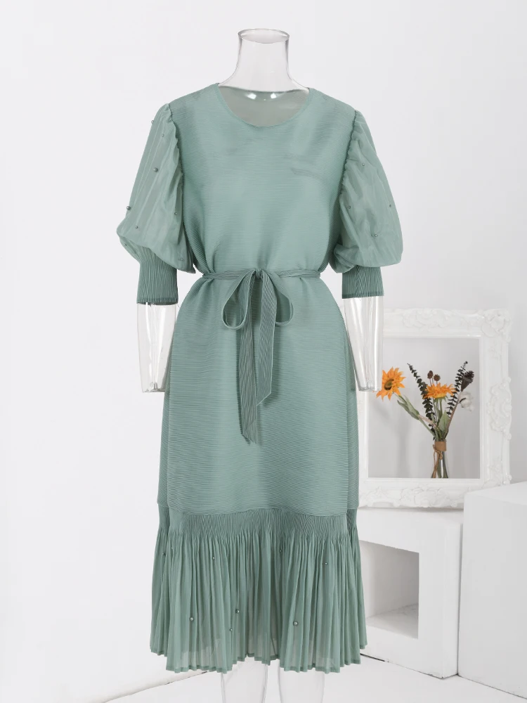 Introducing our latest fashion statement, the LANMREM Women's Party Pleated Dress. This dress is designed with intricate beading and spliced lantern sleeves, exuding elegance and sophistication. The gathered waist and belt add a touch of femininity, making it the perfect dress for any occasion. Available in one size, it has a length of 124 cm and a bust of 110 cm, with a sleeve length of 43 cm. Our dress is made with premium materials and is a best seller among fashion-forward women. Don't miss out on this exclusive piece, perfect for those on the go. Hurry, limited time only. Get yours now and experience the perfect fit and unmatched style.