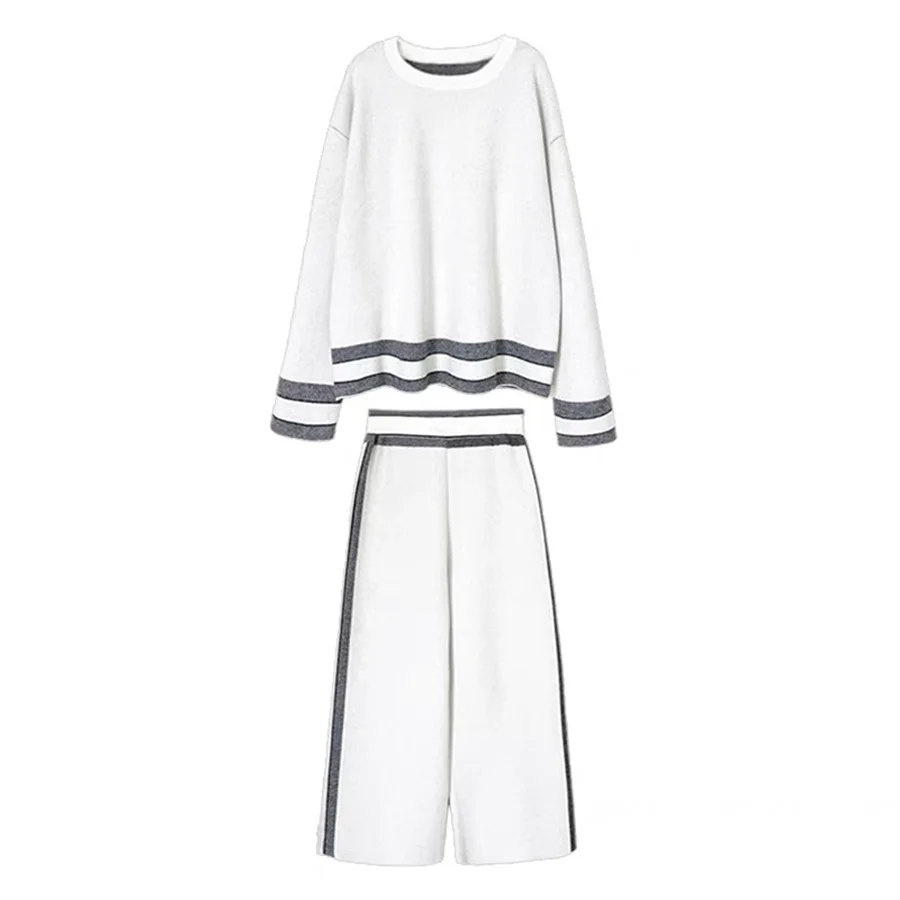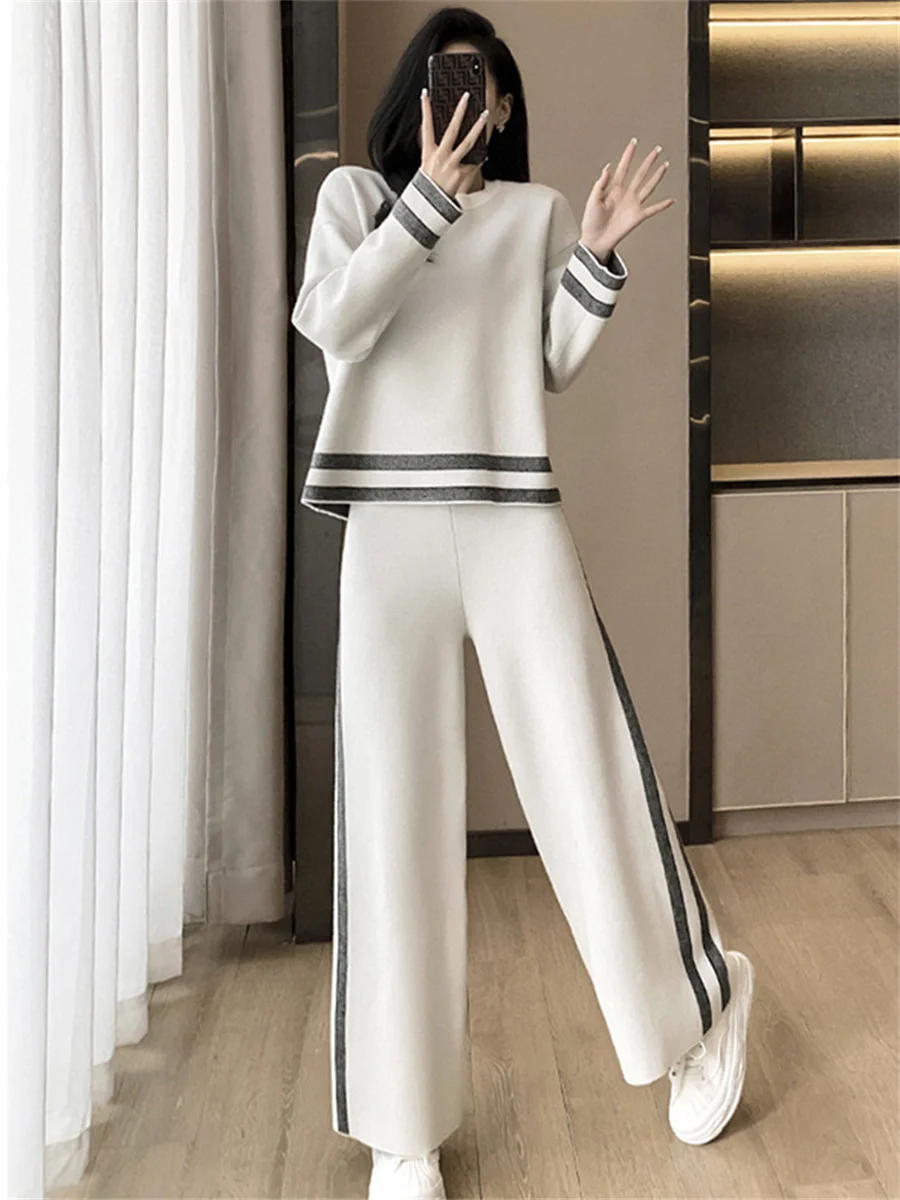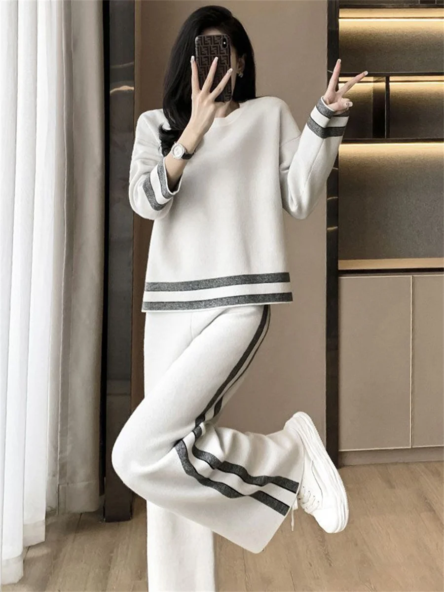 Loose Casual Striped Tracksuit Long Sleeved Sweatshirts Tops Conjunto High Elastic Waist Wide Leg Pants Suit Women Korean Sets