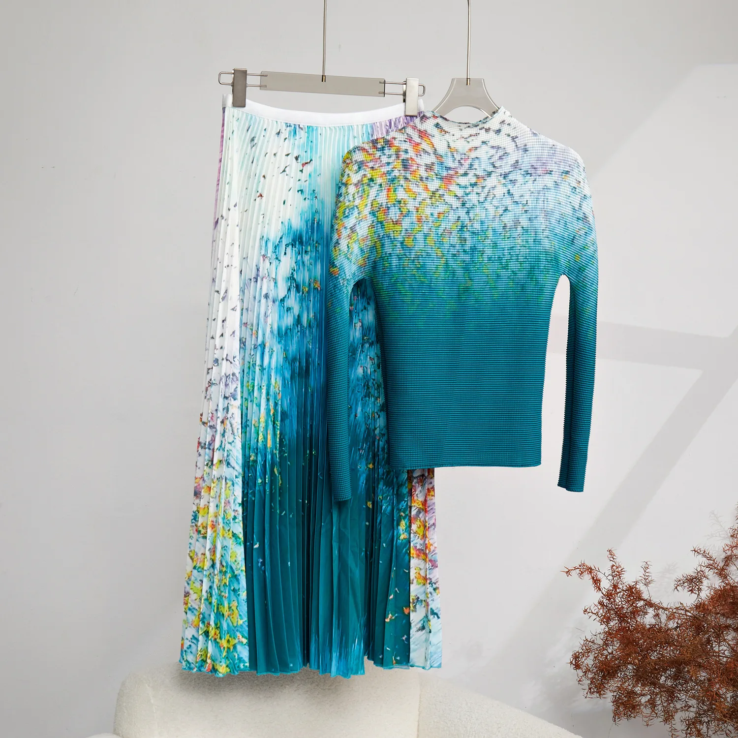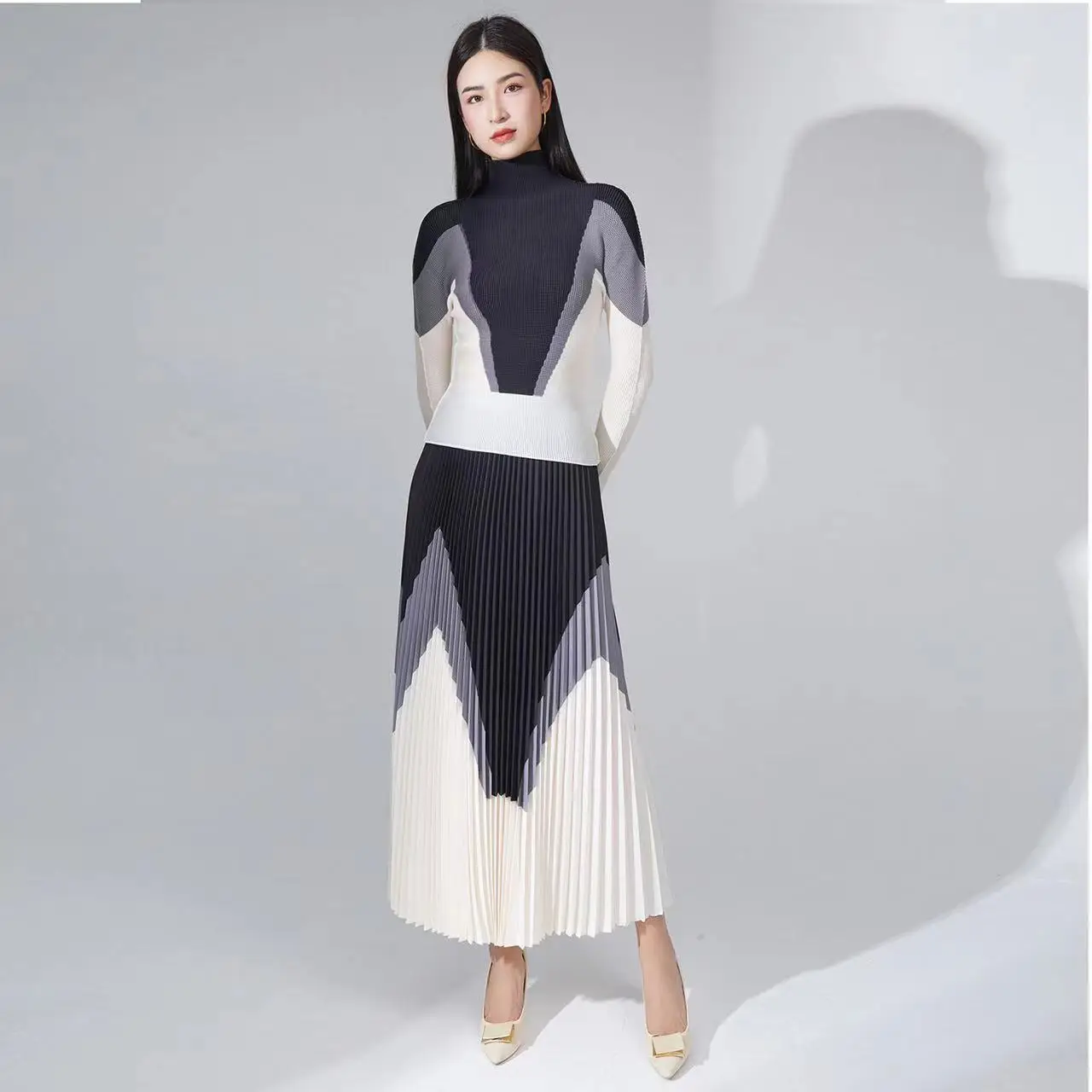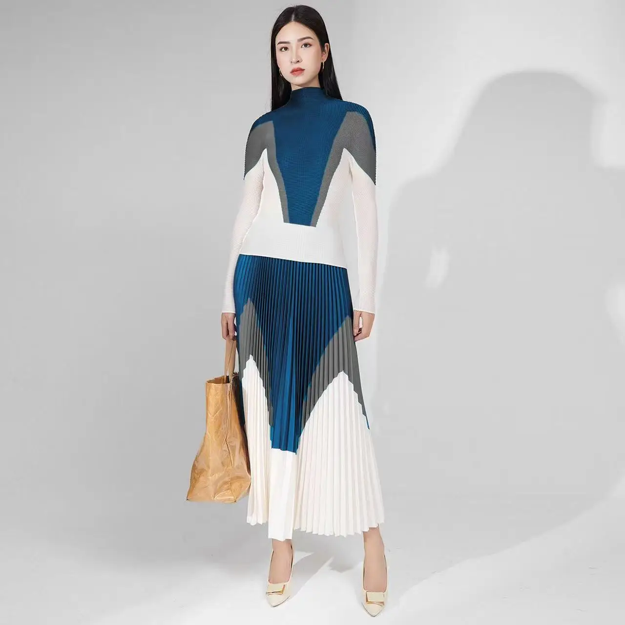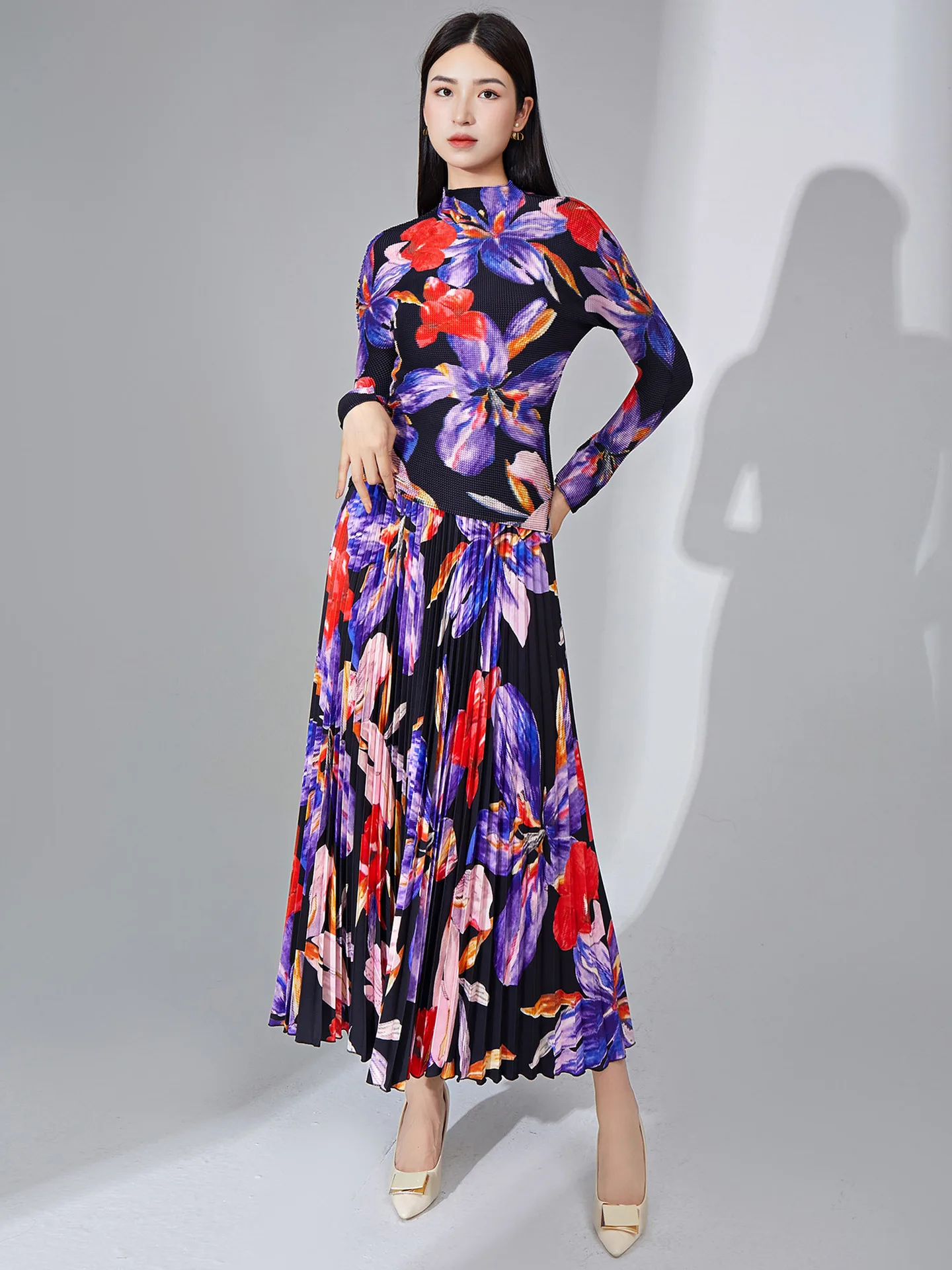 🌸 What it is - This set includes a high collar long sleeve top and a long skirt, both featuring a stunning pleated print design for a unique touch.