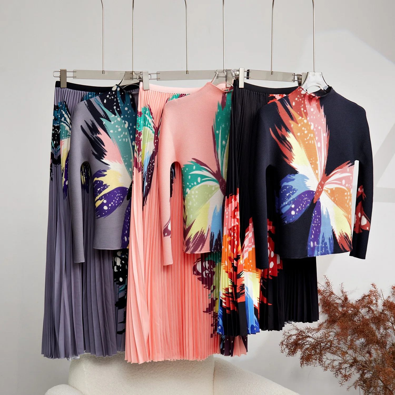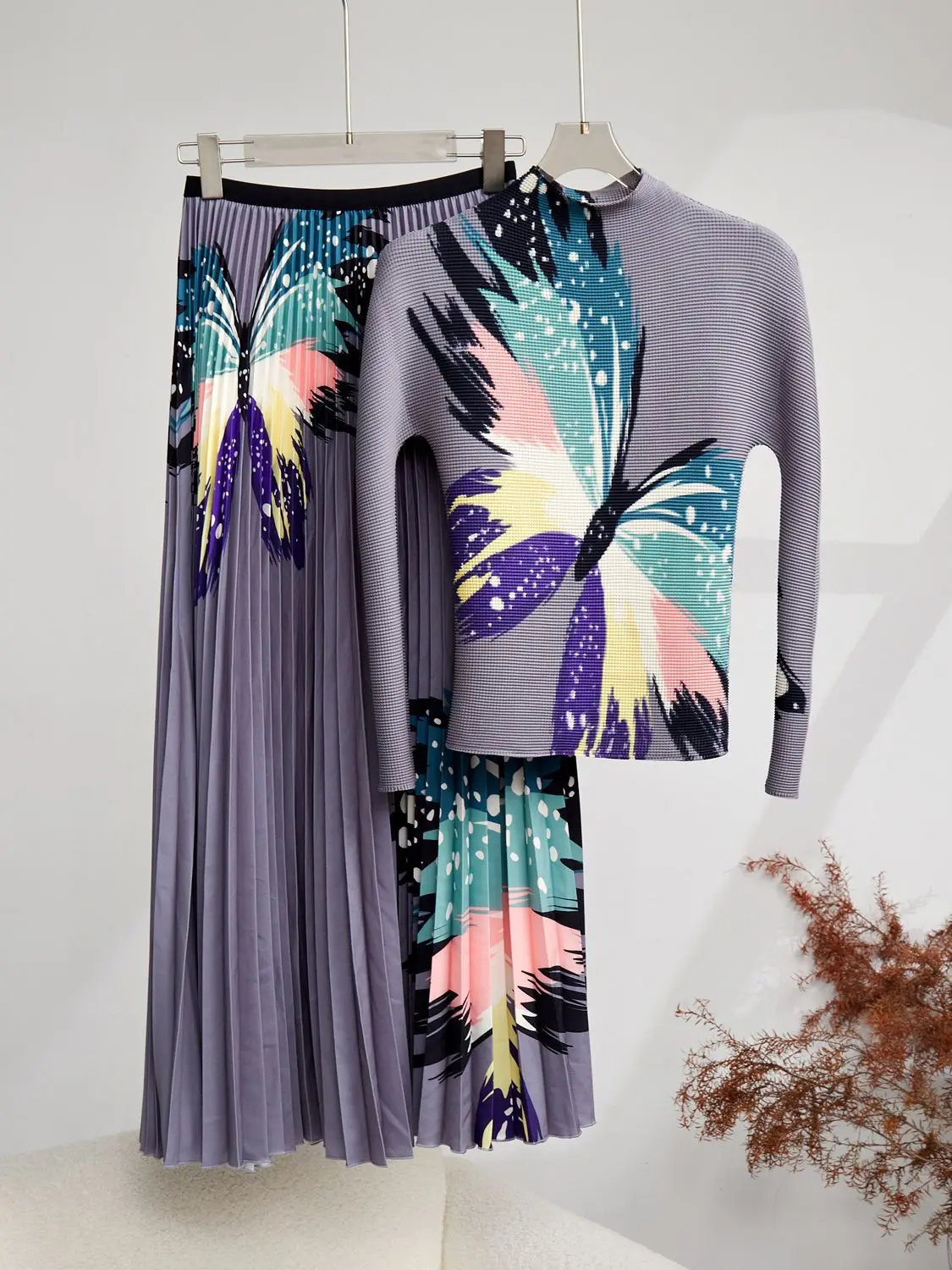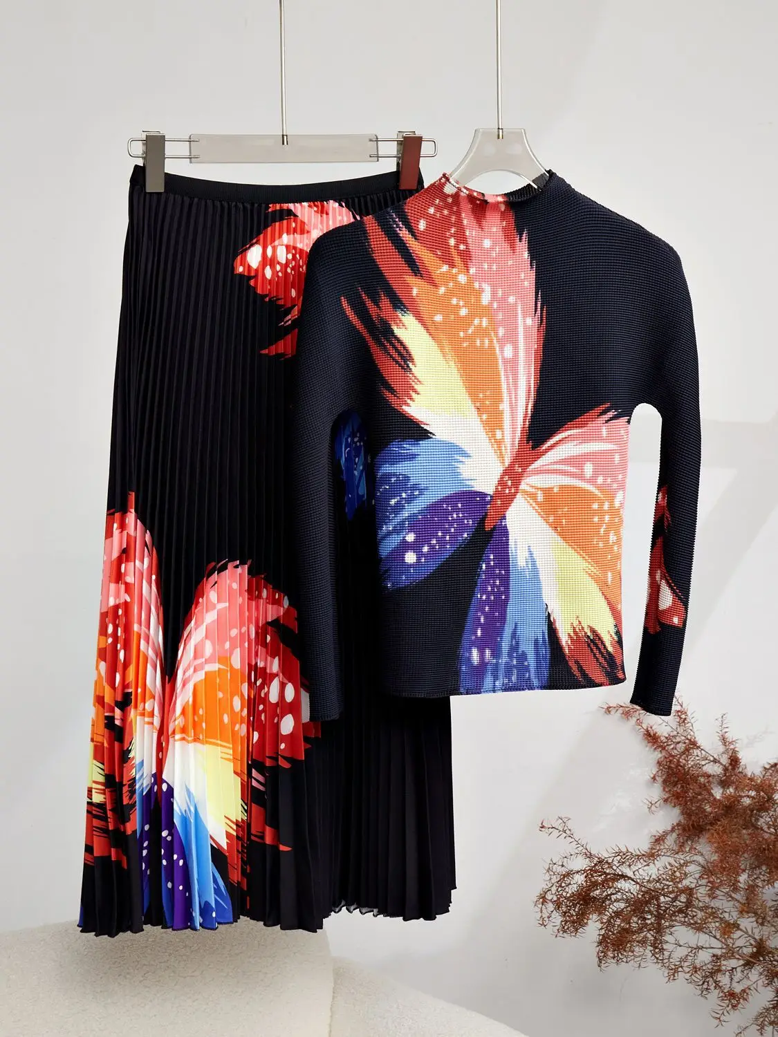 Elevate your wardrobe with the Miyake Pleated Print 2 Piece Set, perfect for a stylish spring or autumn look.