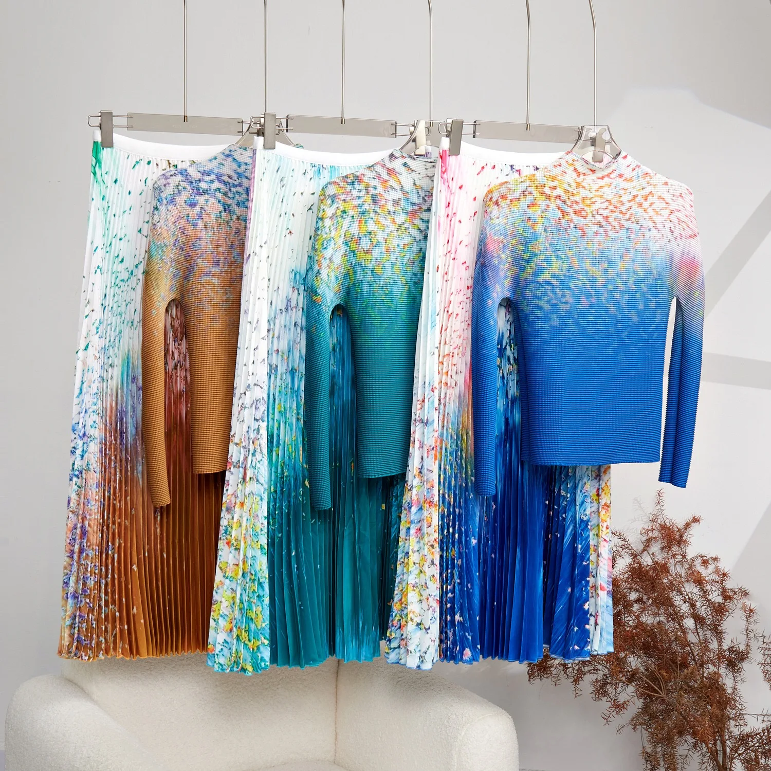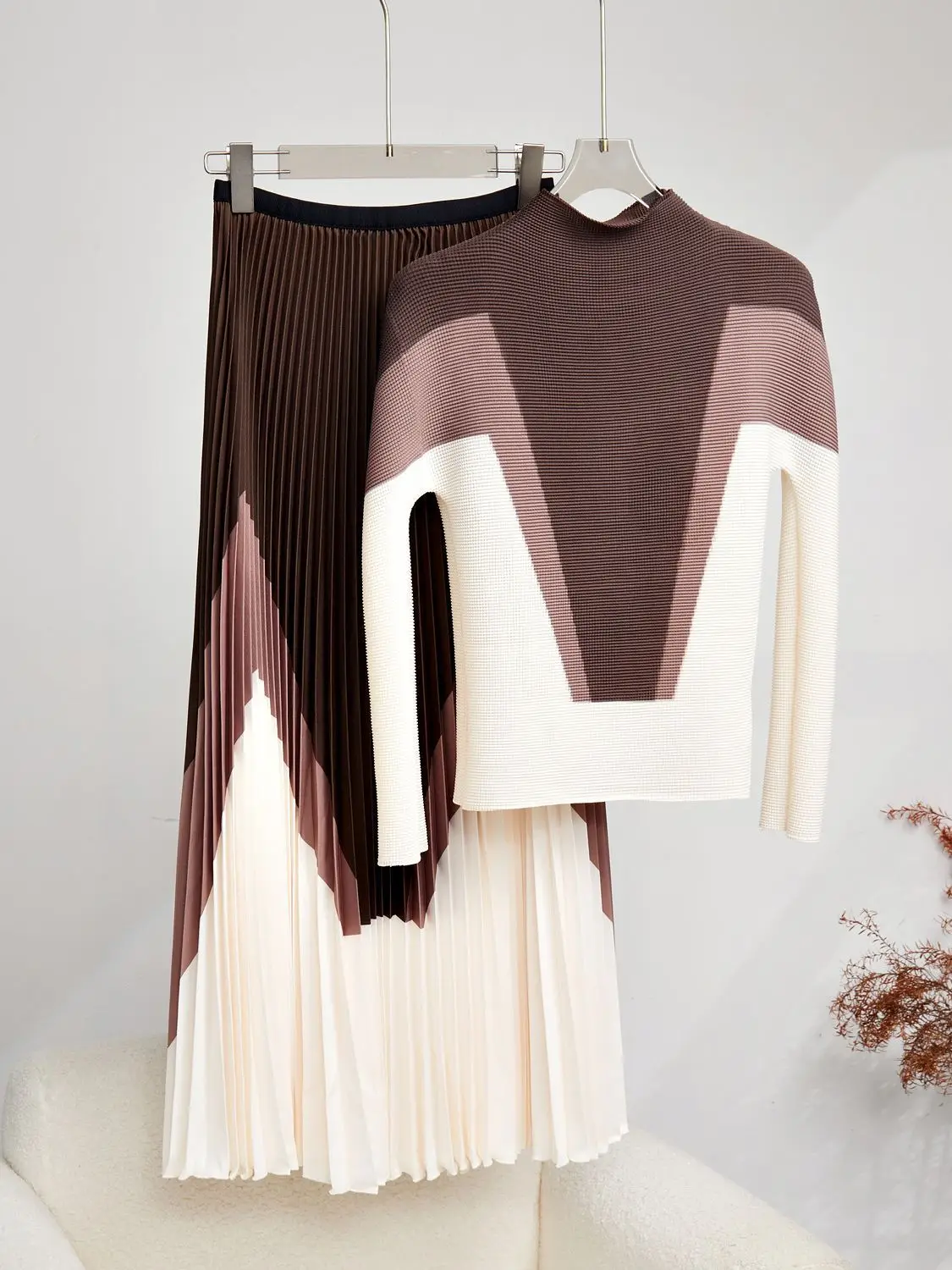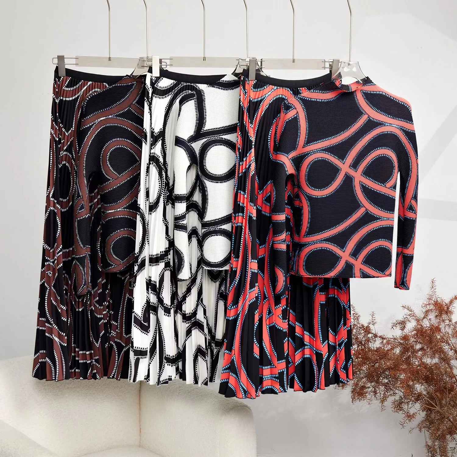 Elevate your wardrobe with the Miyake Pleated Print 2 Piece Set, perfect for a stylish spring or autumn look.