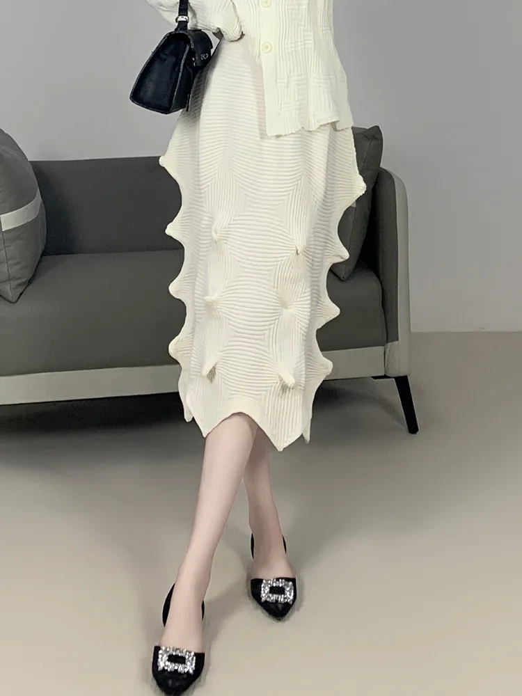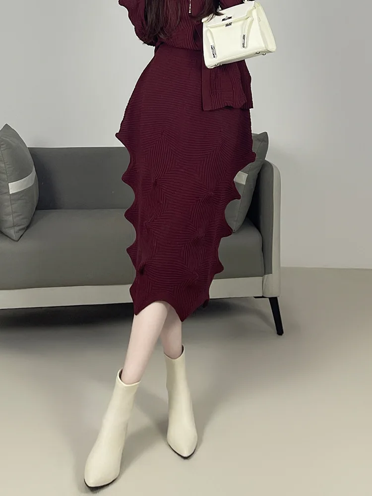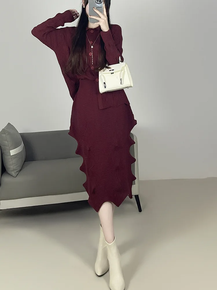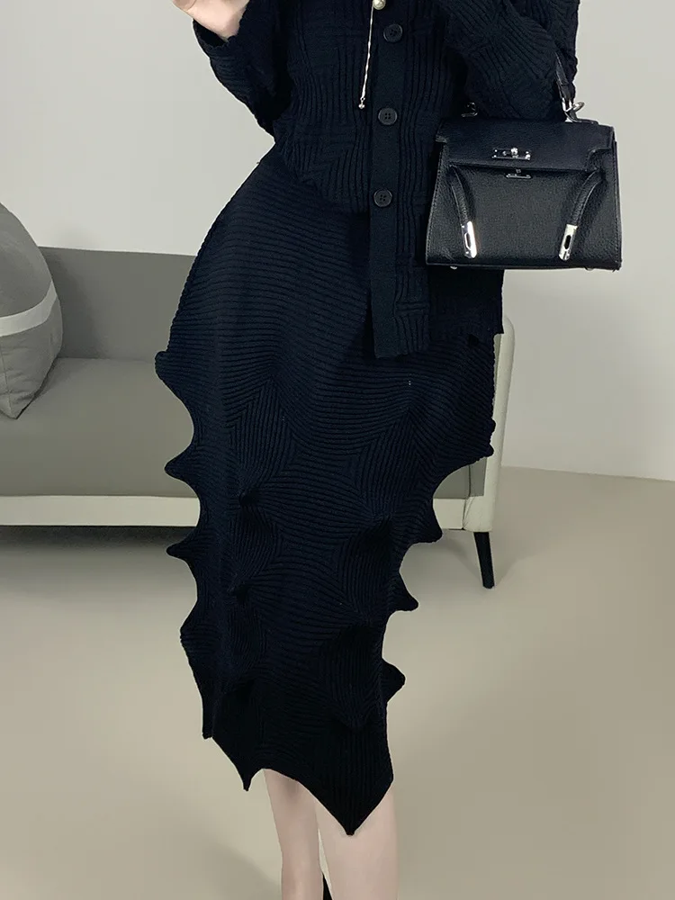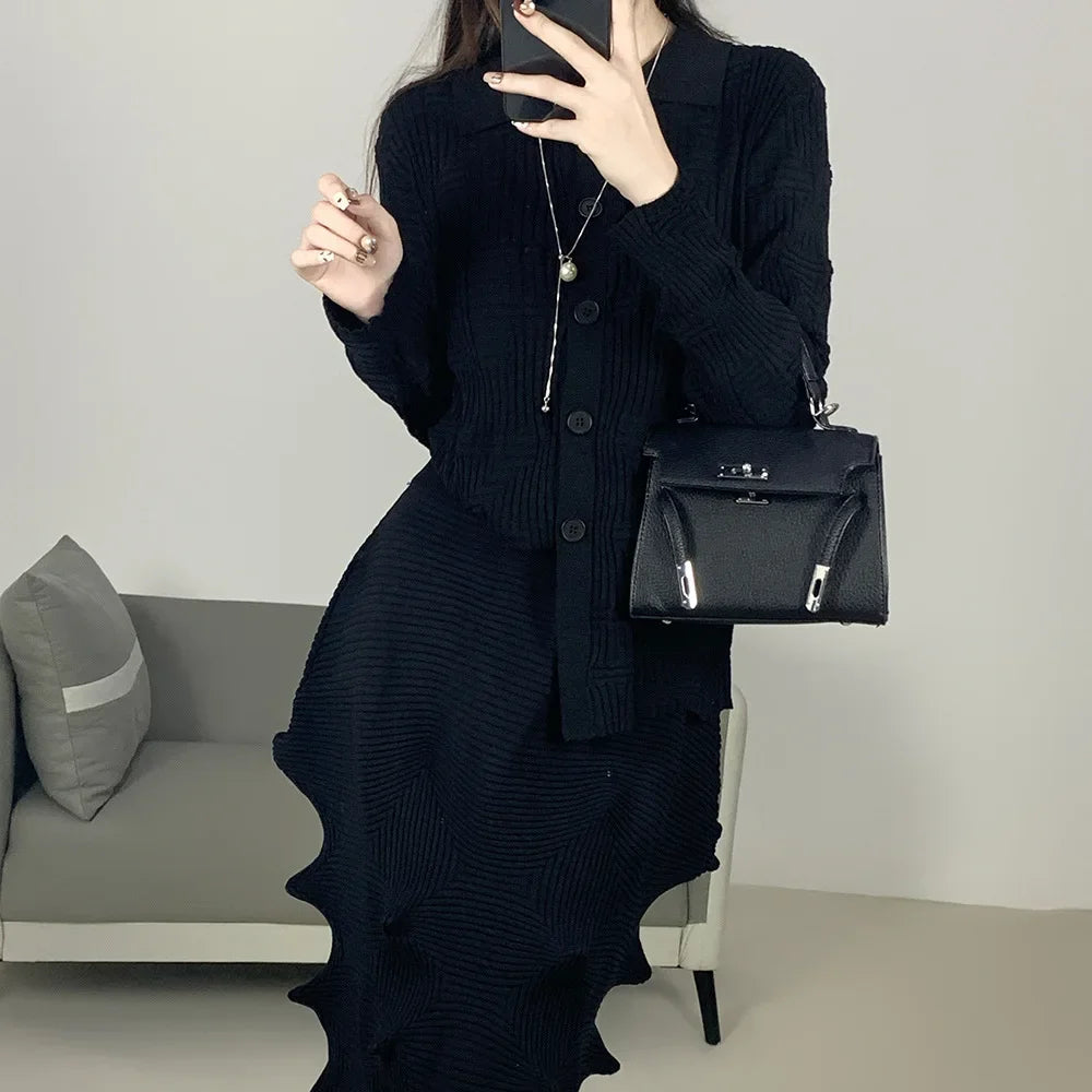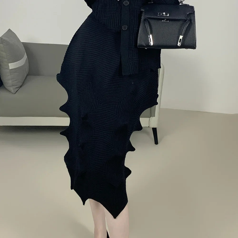 This exclusive two-piece set combines a chic bud skirt with a loose sweater cardigan, crafted from high-quality knitted fabric to ensure you stay comfortable and stylish throughout the seasons.
