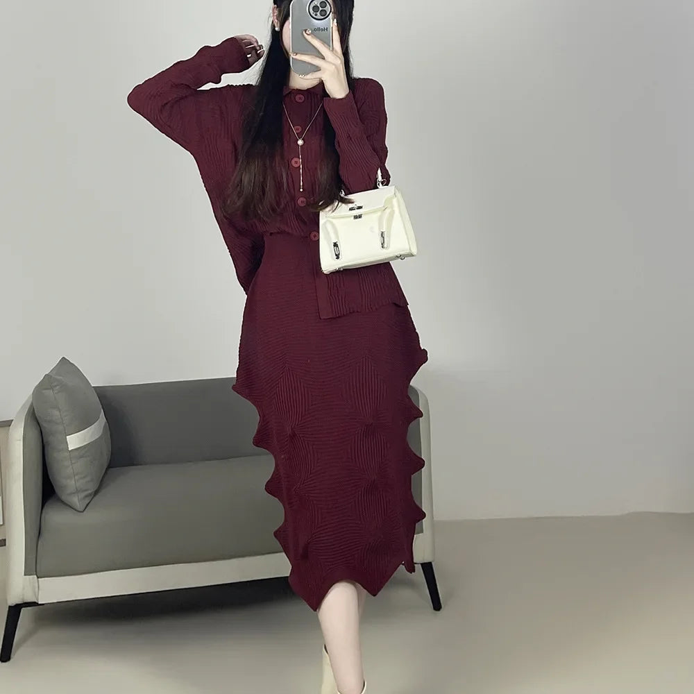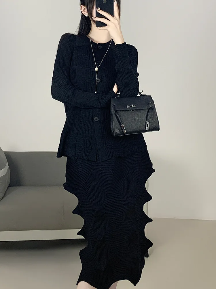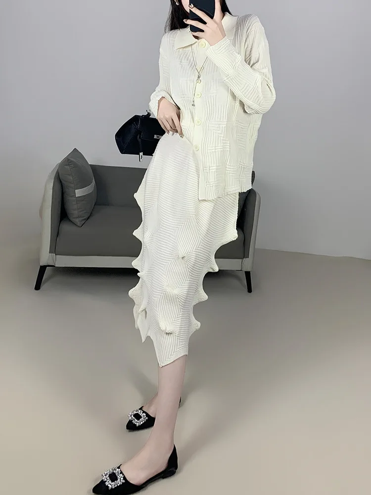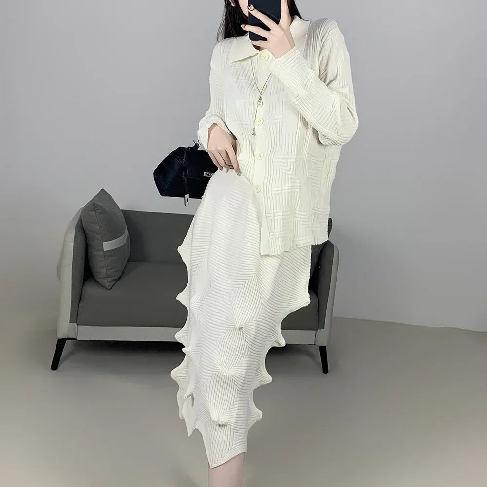 Elevate your autumn wardrobe with the Miyake Pleated Two-Piece Set, featuring a stylish bud skirt paired with a cozy cardigan jacket.