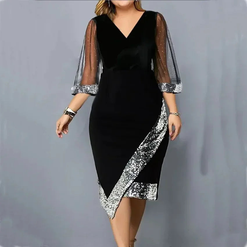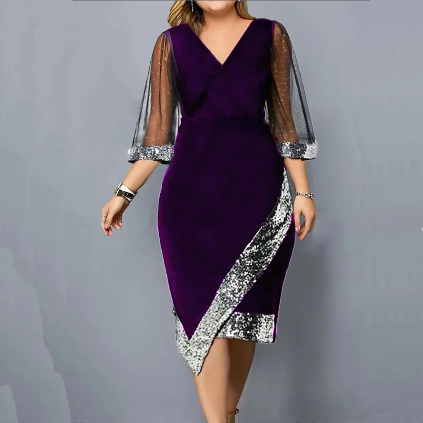 New 2024 Women's Casual Dress Golden Velvet Irregular Sequin Perspective Mesh Dress Female Oversized Fat Ladies Dress Vestidos