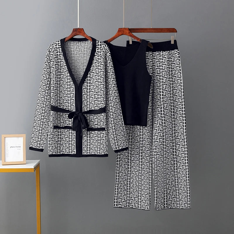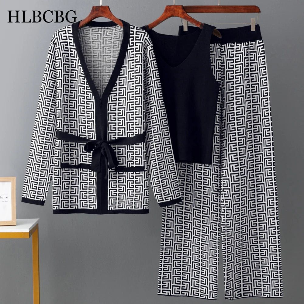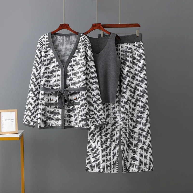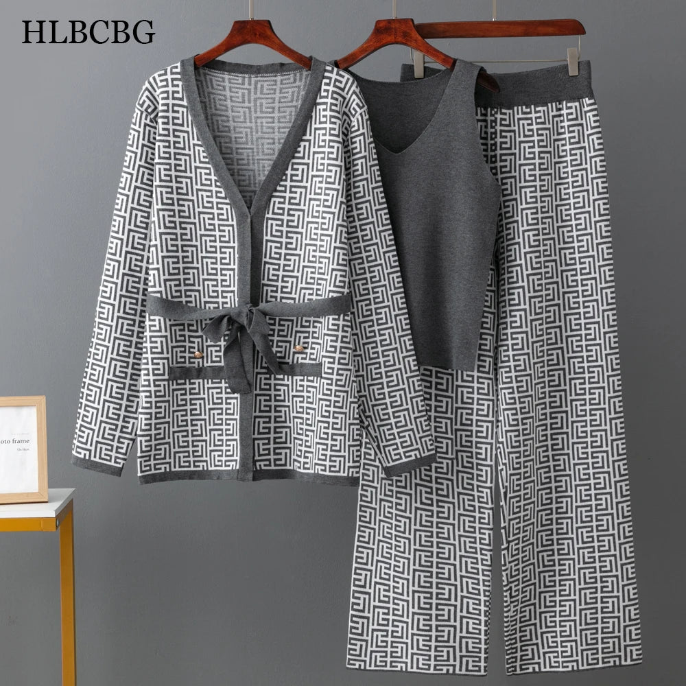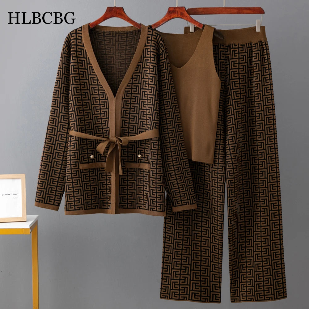 Office Lady Three Pieces Sweater Suits Loose Belt Cardigan+Tank Tops+Drawstring Wide Legs Long Pants Autumn Fashion Solid Sets