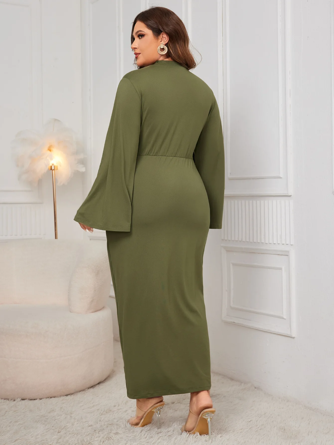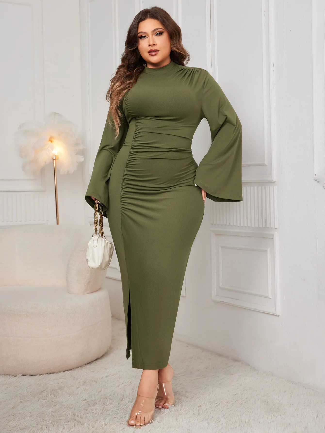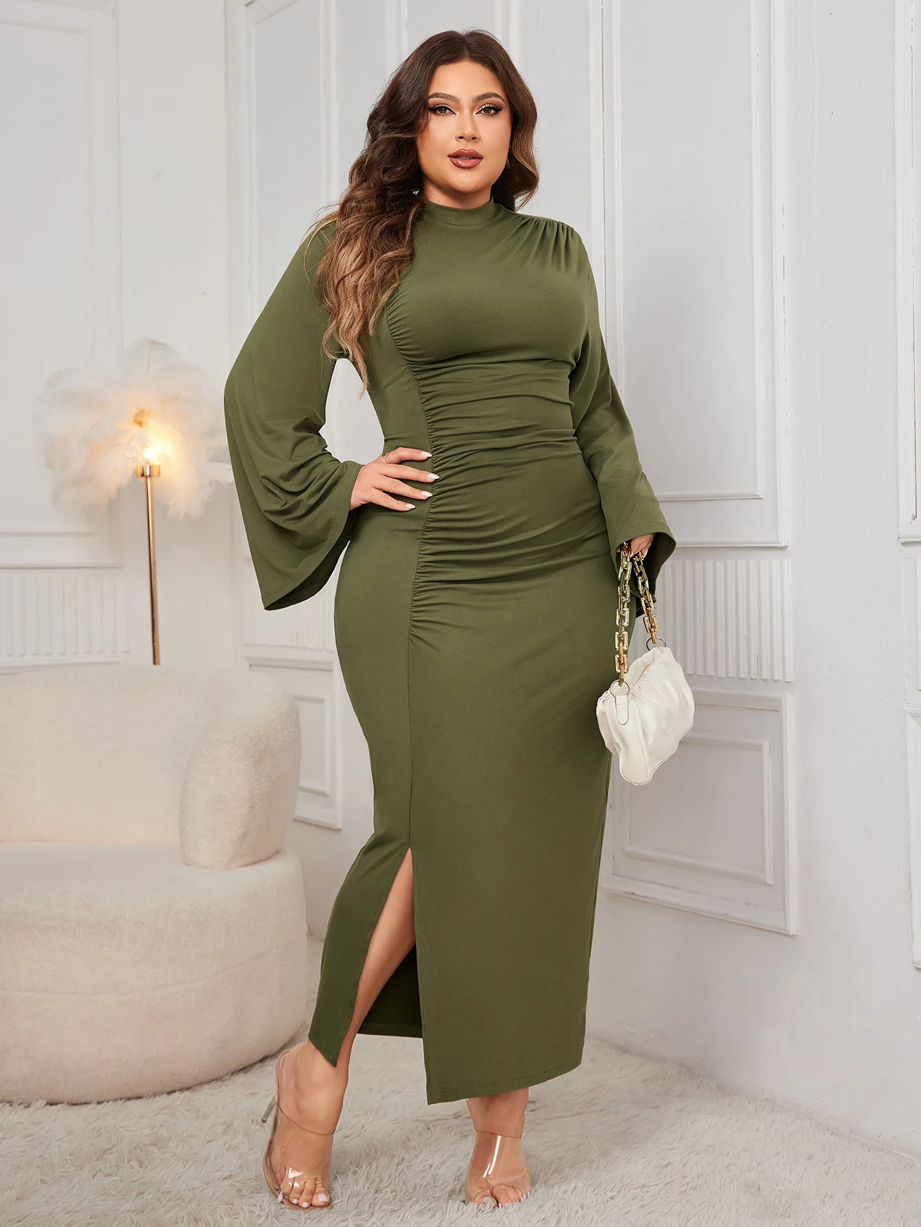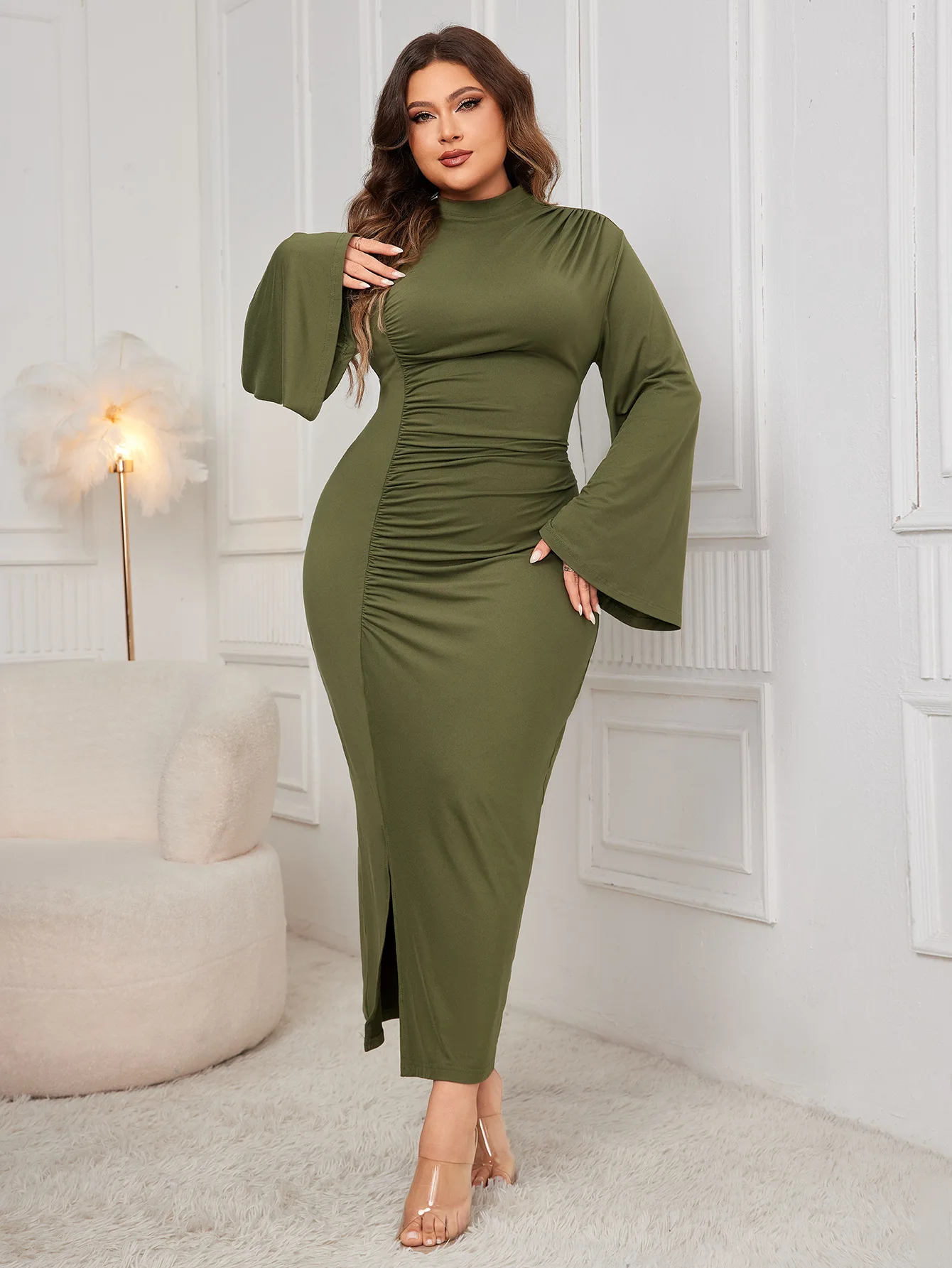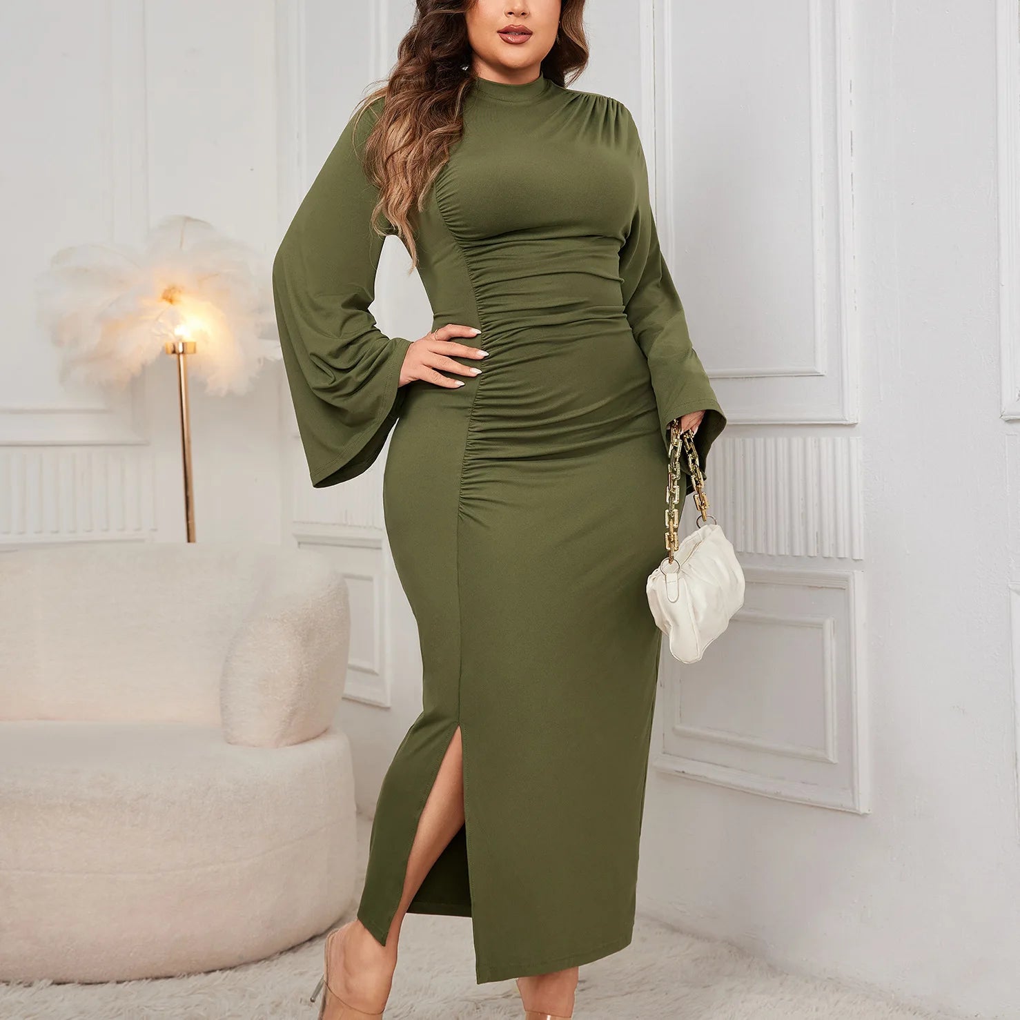 Elevate your style with this exclusive Plus Size Maxi Dress. Featuring a high collar and split hip design, this solid color dress is perfect for the fashion-forward. Made with quality materials, this dress is both stylish and comfortable.