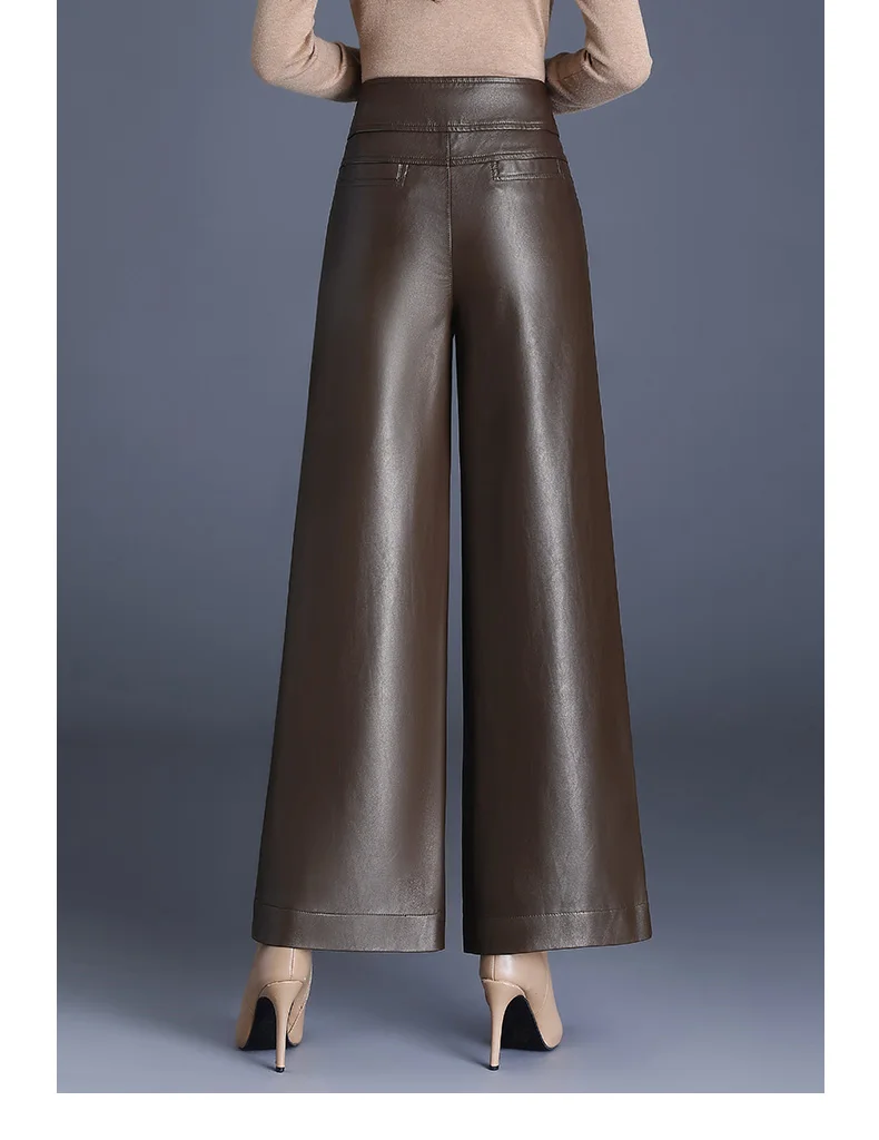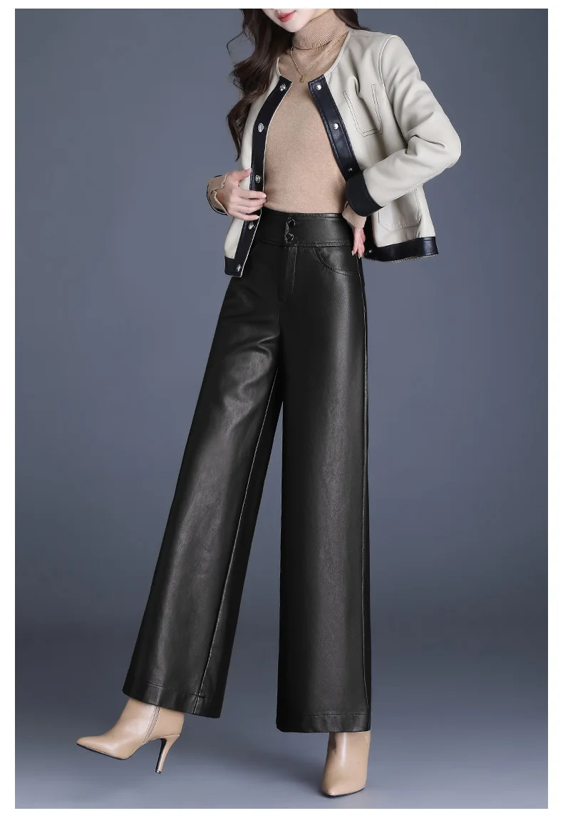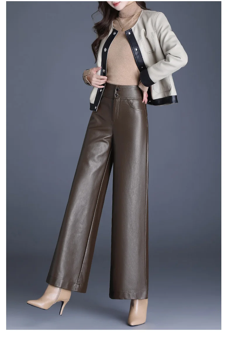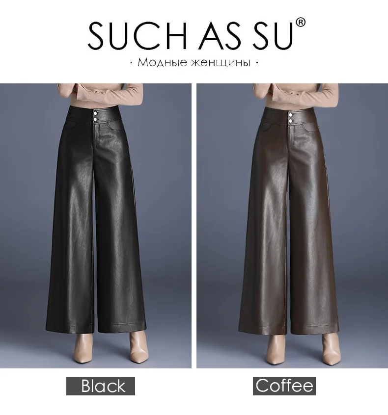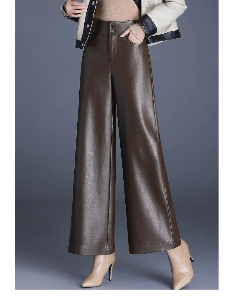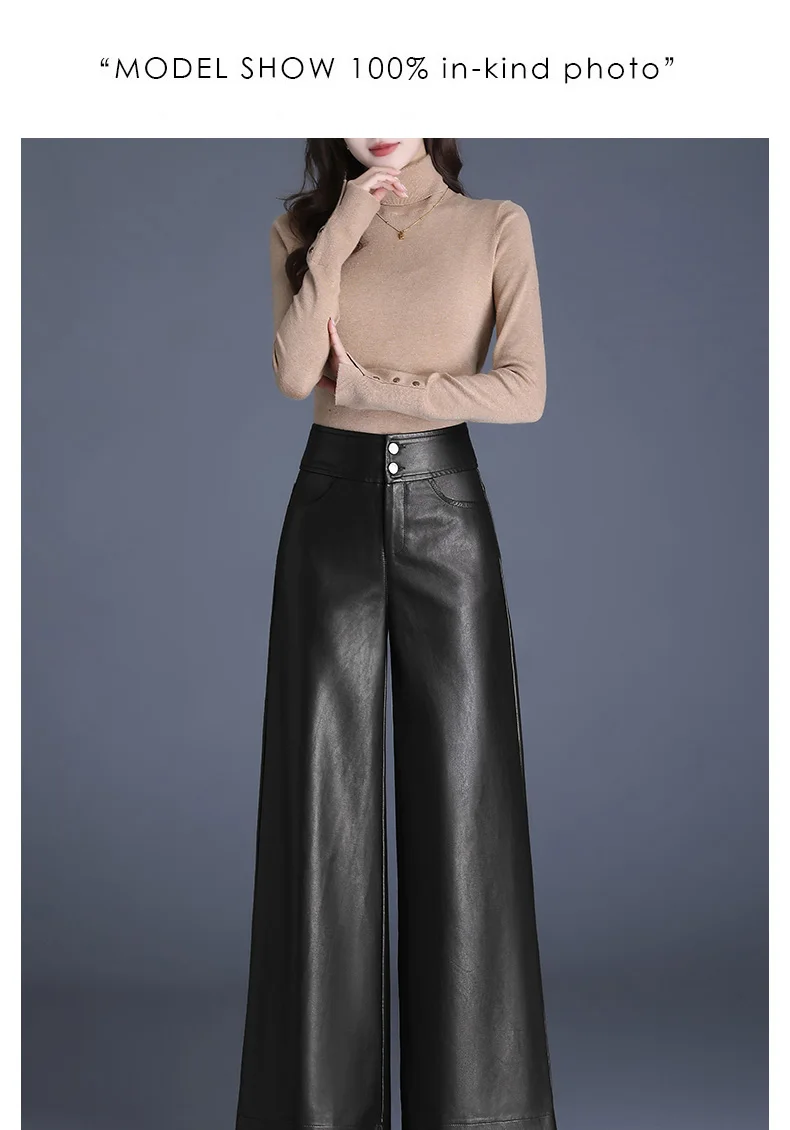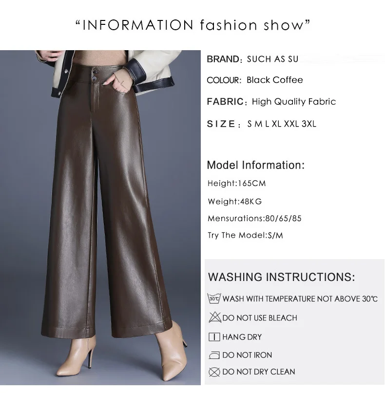 Introducing our newest addition to our fall/winter collection - the High Quality Women Pockets Wide Leg Pants. These pants are designed with a slim fit and ankle-length culottes, perfect for the stylish and sophisticated woman. Made with premium PU leather and an elastic waist, these pants offer both comfort and style. Our pants also feature functional pockets, making it the perfect on-the-go piece. Available in a variety of sizes and recommended weight ranges, these pants are the perfect addition to any wardrobe. Don't miss out on this limited time exclusive item. Order now and experience the perfect fit and ultimate style.