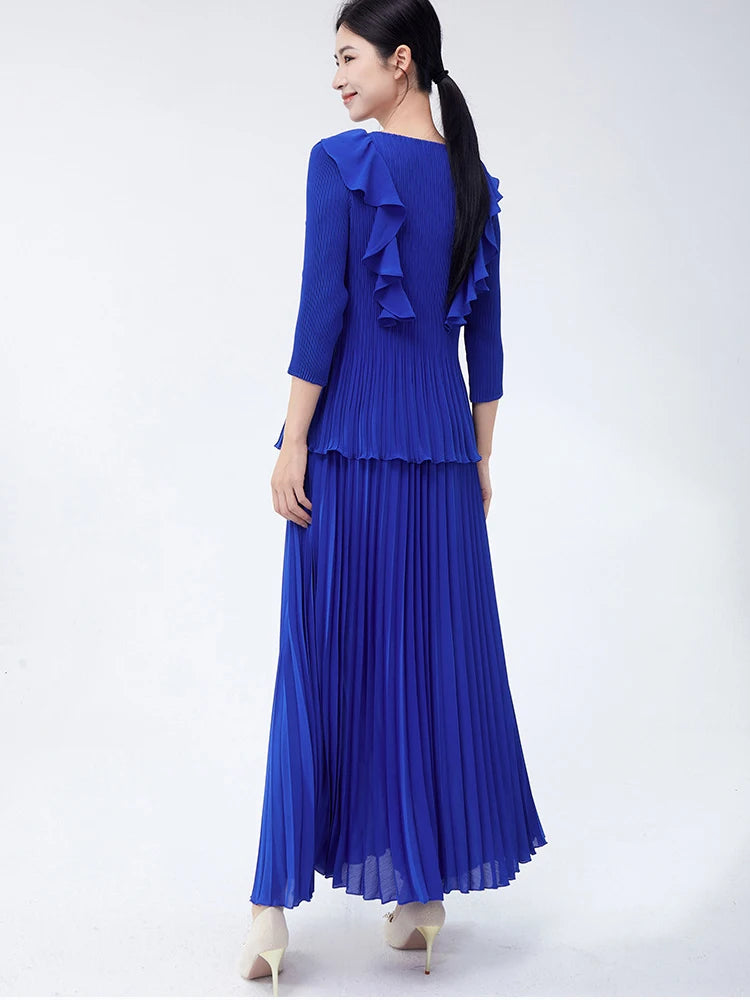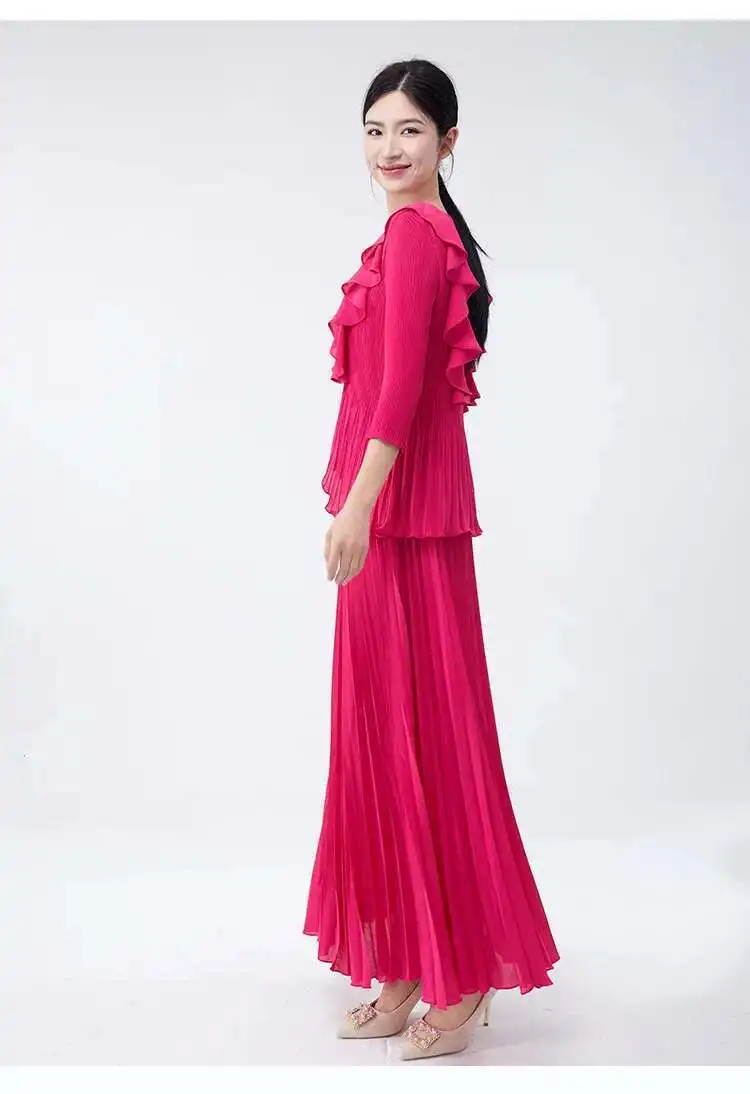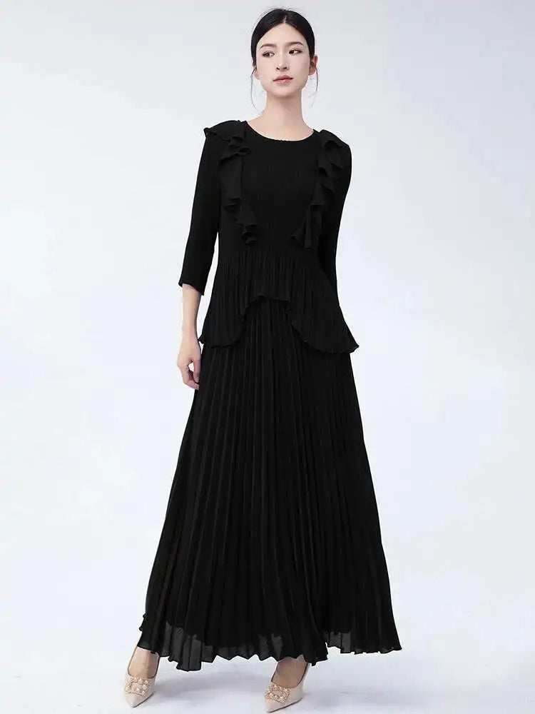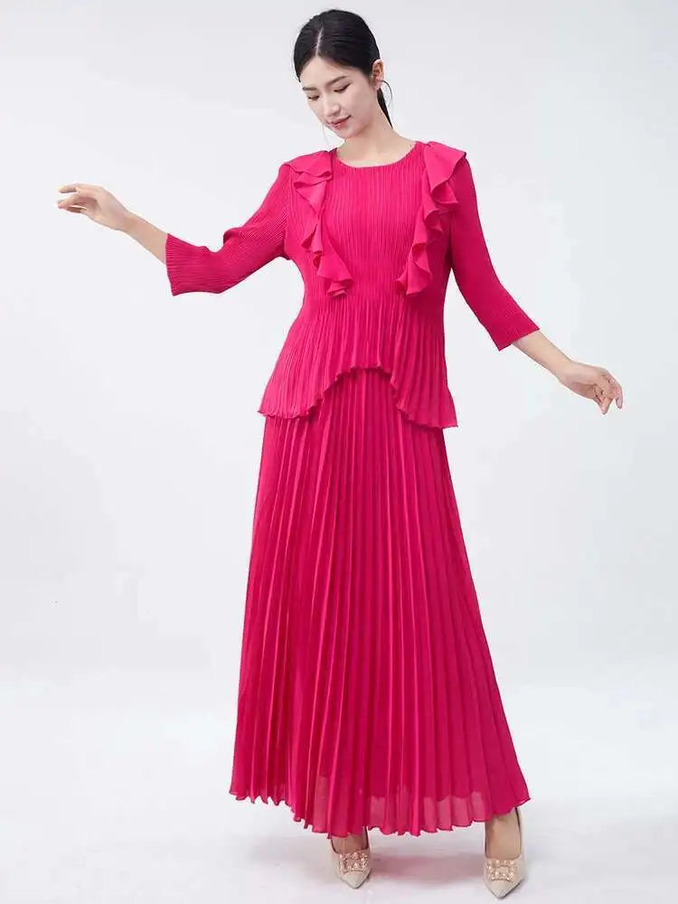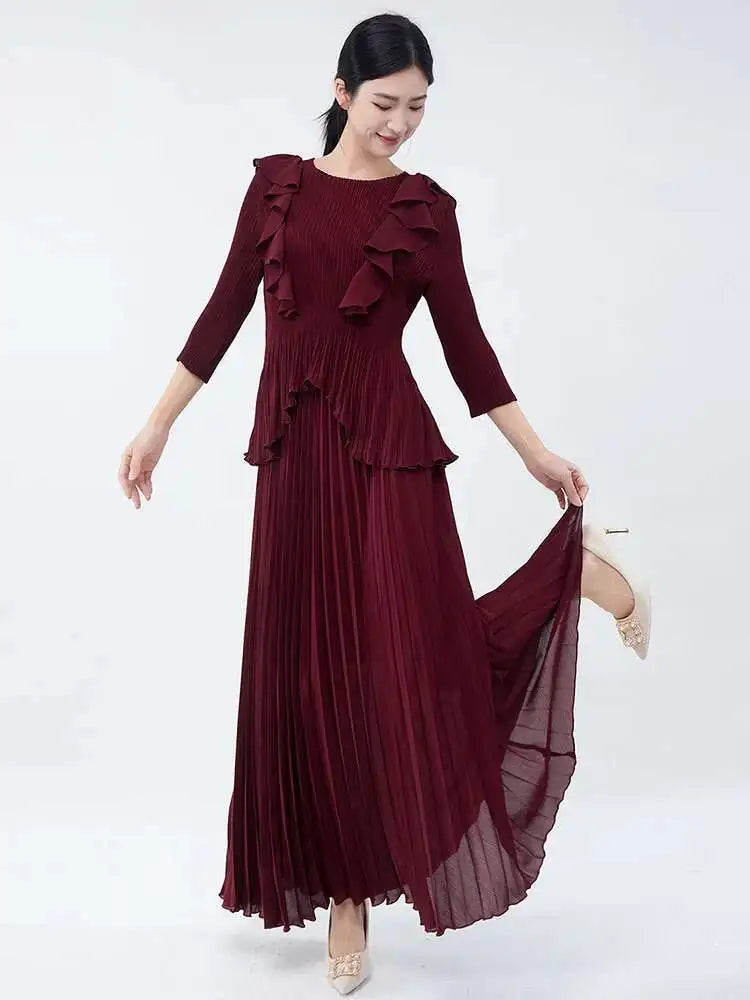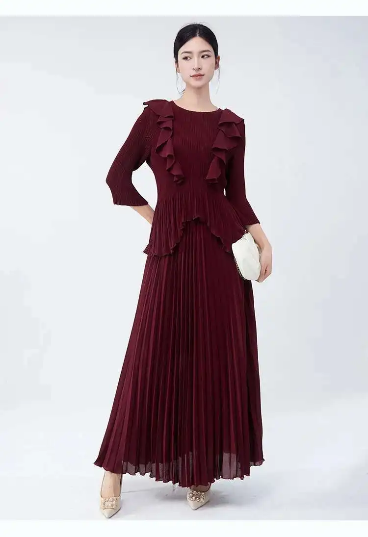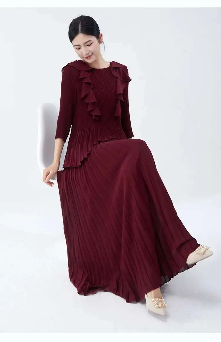 Elevate your style this season with our chic Pleated Two-Piece Set featuring a versatile O-neck long sleeve top and an elastic waist long skirt adorned with elegant irregular ruffles.