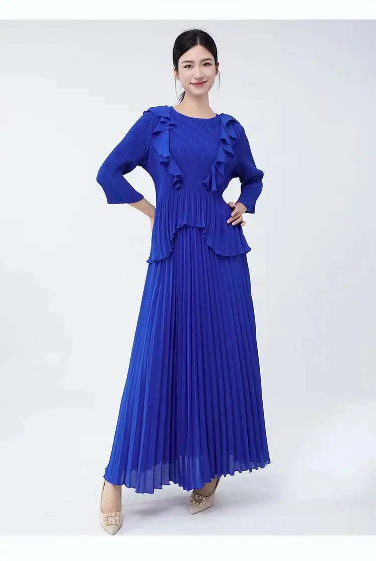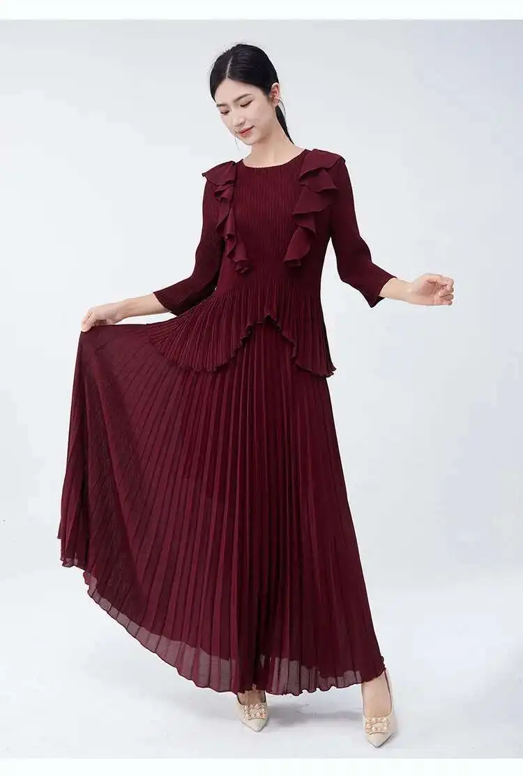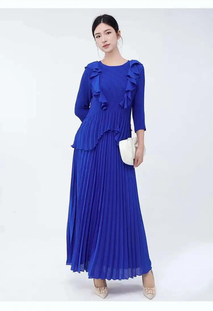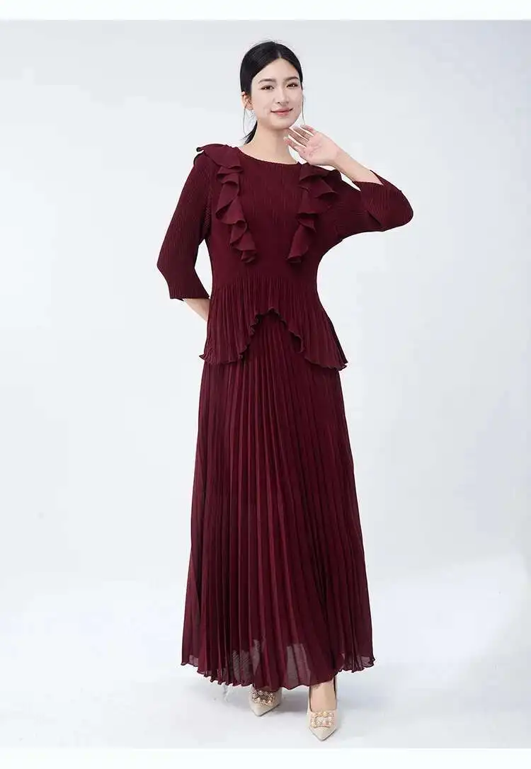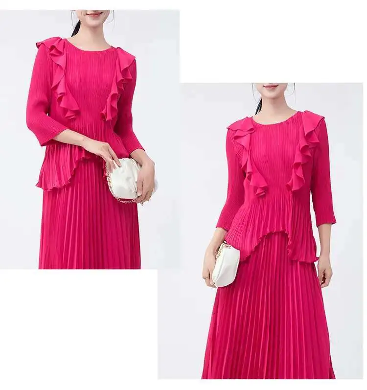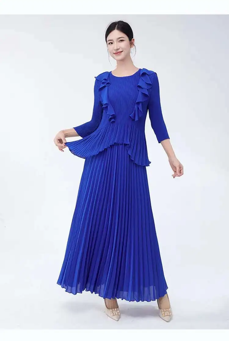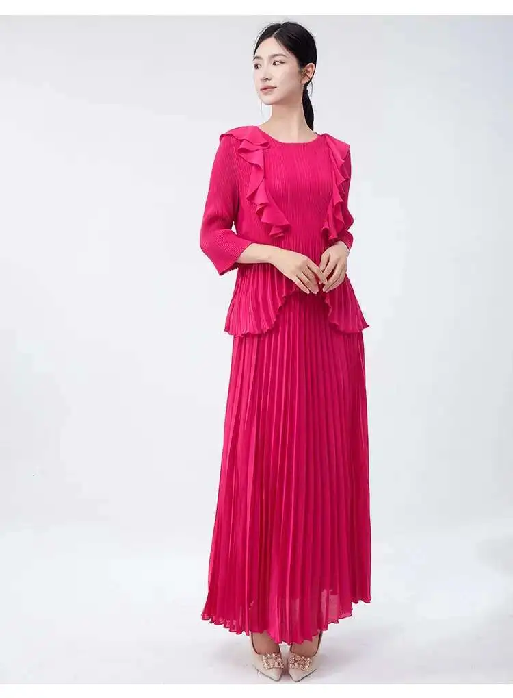 Elevate your style this season with our chic Pleated Two-Piece Set featuring a versatile O-neck long sleeve top and an elastic waist long skirt adorned with elegant irregular ruffles.