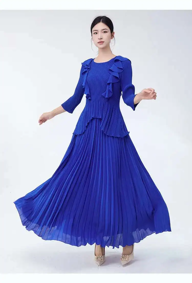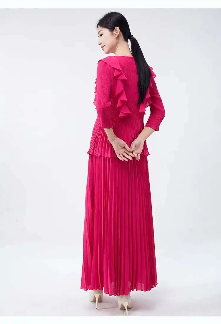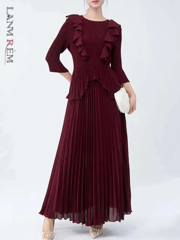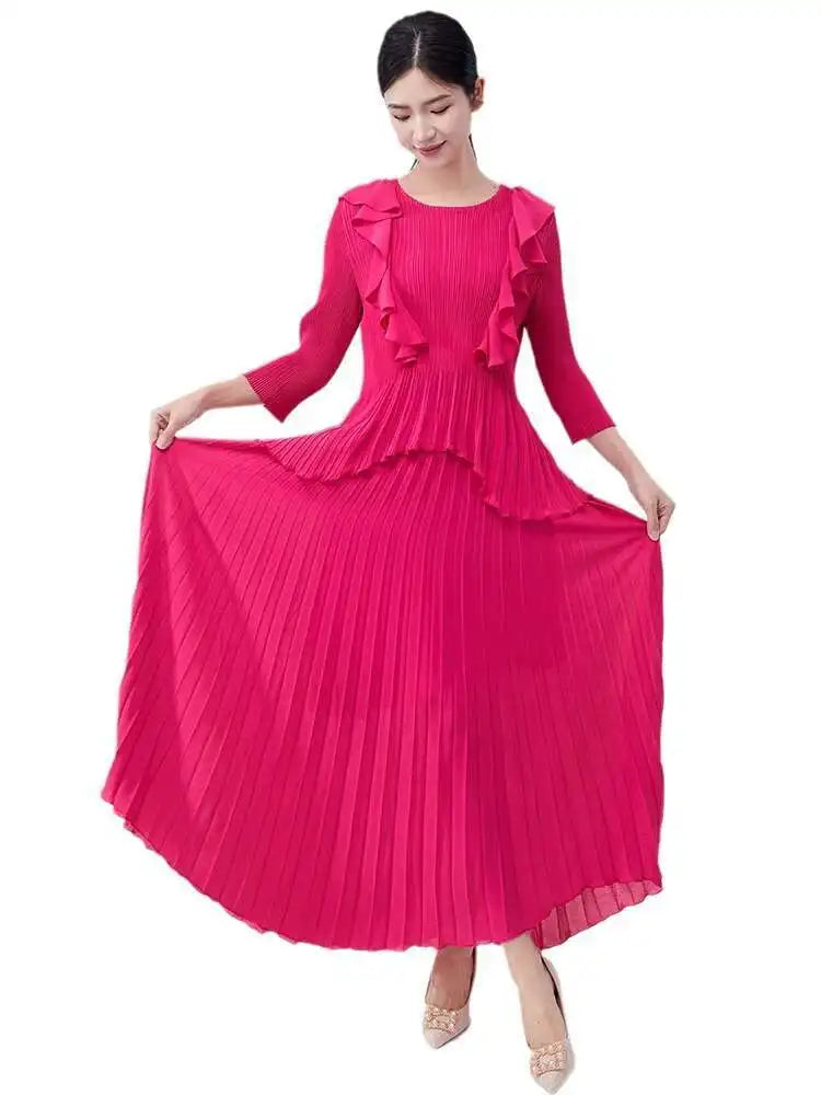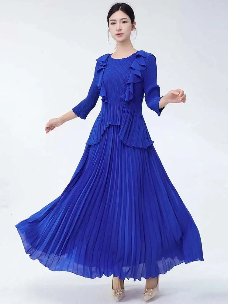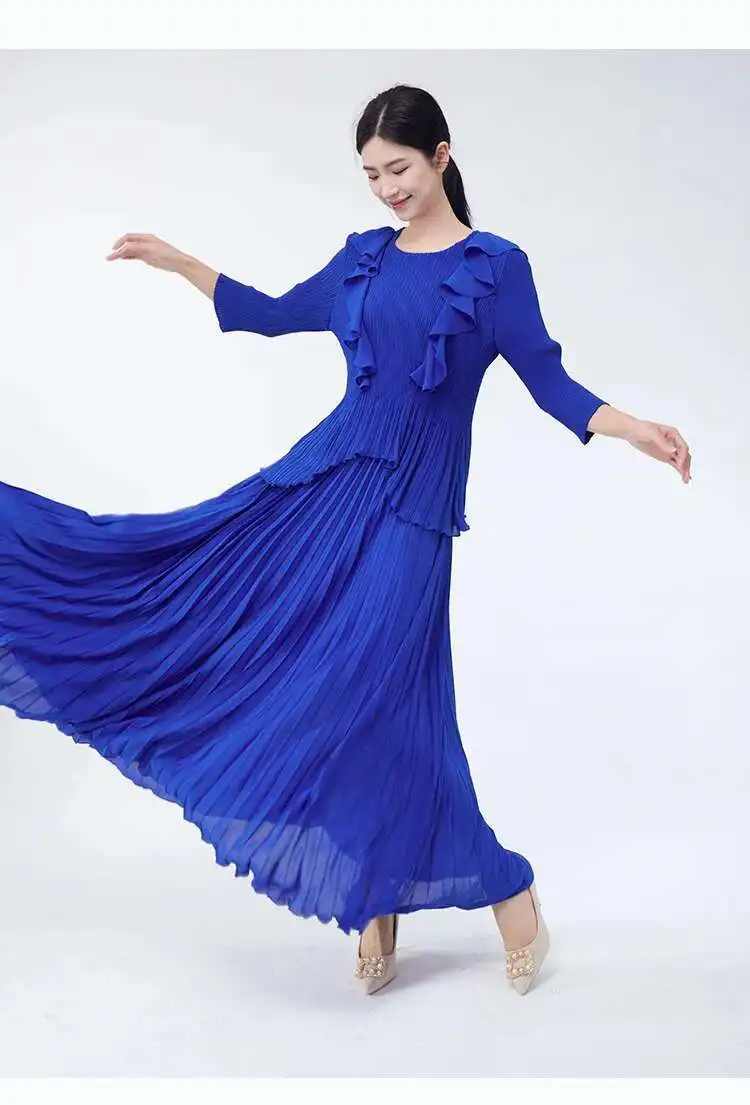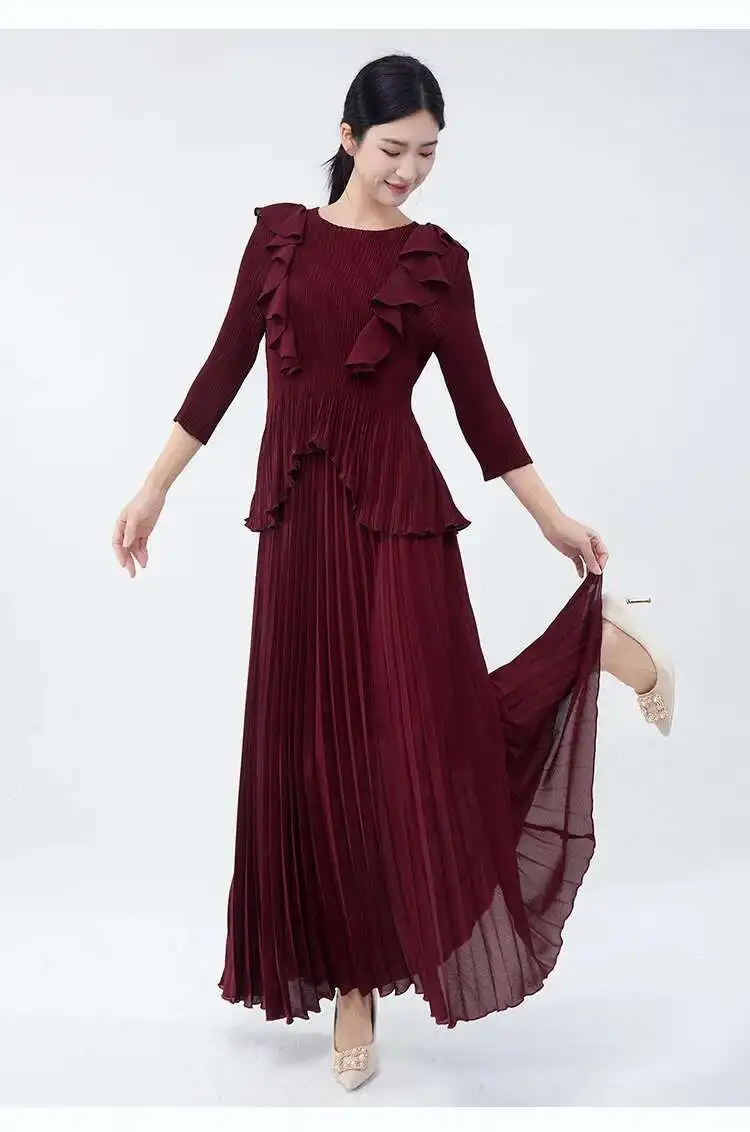 Elevate your style this season with our chic Pleated Two-Piece Set featuring a versatile O-neck long sleeve top and an elastic waist long skirt adorned with elegant irregular ruffles.