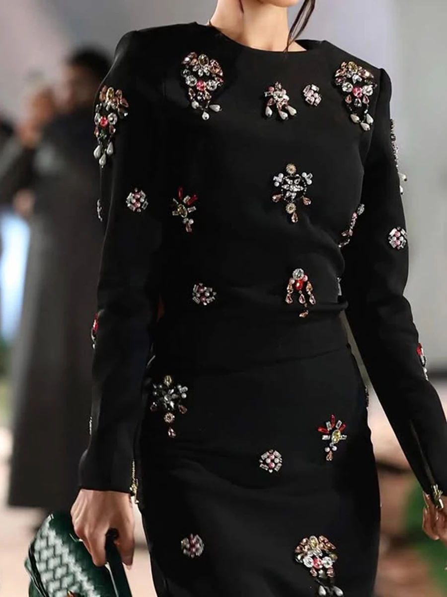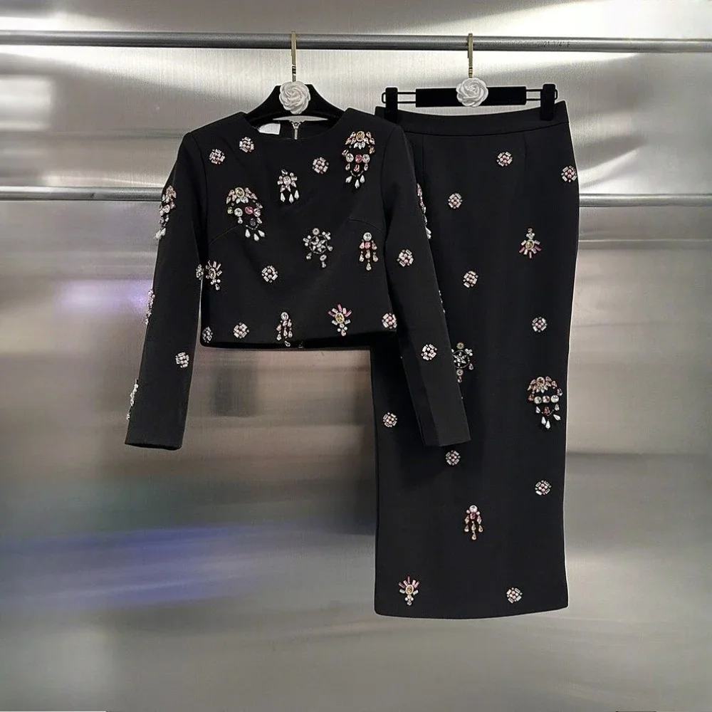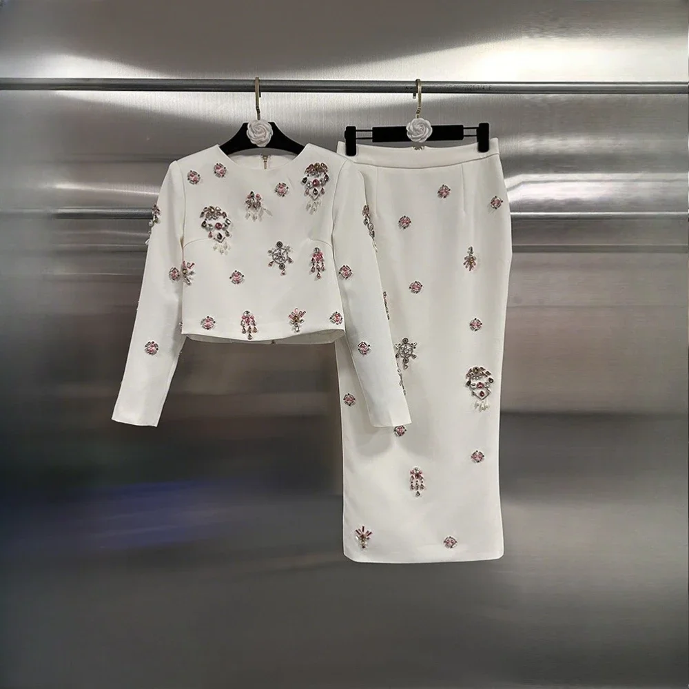 Elevate your style with our TWOTWINSTYLE Solid Slimming Two Piece Sets, featuring a chic round neck and long sleeves with elegant patchwork diamonds. This exclusive set is designed for the modern woman who values comfort and fashion.